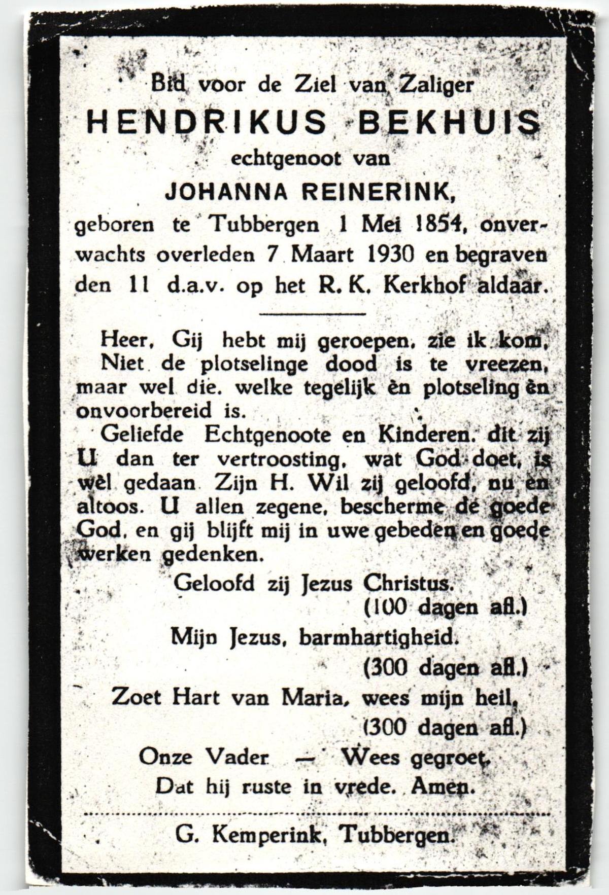 BEKHUIS, Hendrikus, geboren op 01-05-1854 te Tubbergen, overleden op 7-3-1930 te Tubbergen op 75-jarige leeftijd, begraven op 11-3-1930 te Tubbergen.