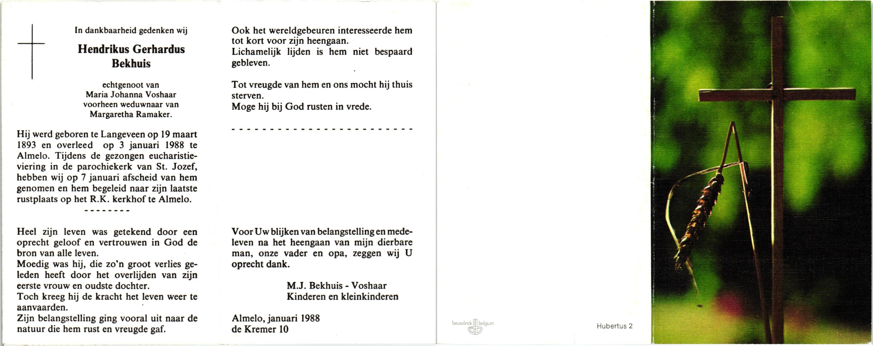 BEKHUIS, Hendrikus Gerhardus, geboren op 19-03-1893 te Langeveen, overleden op 3-1-1988 te Almelo op 94-jarige leeftijd, begraven op 7-1-1988 te Almelo.