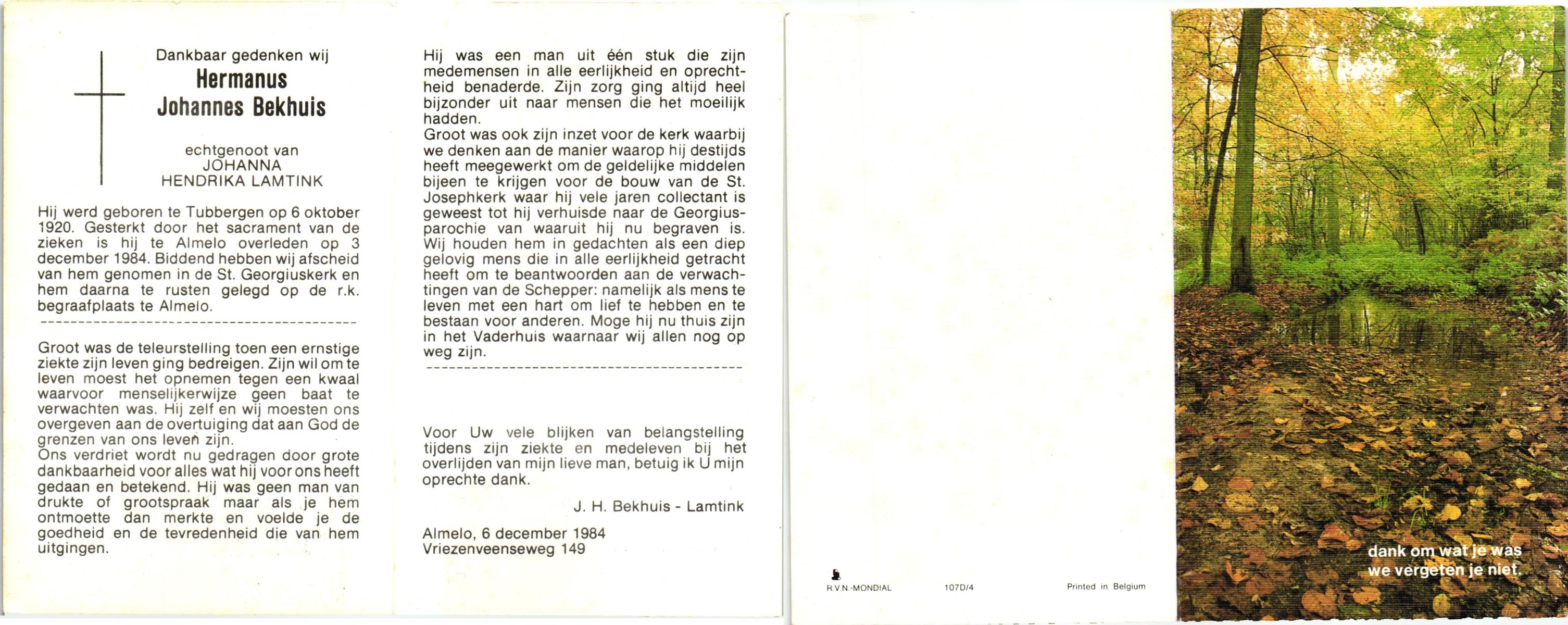 BEKHUIS, Hermanus Johannes, geboren op 6-10-1920 te Tubbergen, overleden op 3-12-1984 te Almelo op 64-jarige leeftijd, begraven te Almelo.