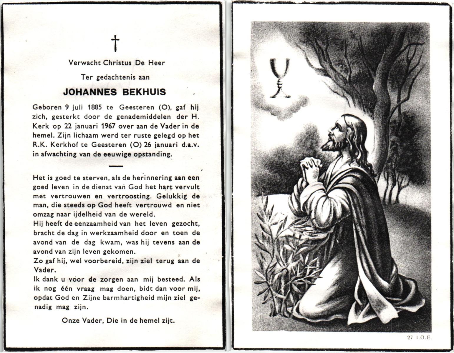 BEKHUIS, Johannes, geboren op 09-07-1885 te Geesteren, overleden op 22-1-1967 op 81-jarige leeftijd, begraven op 26-1-1967 te Geesteren.