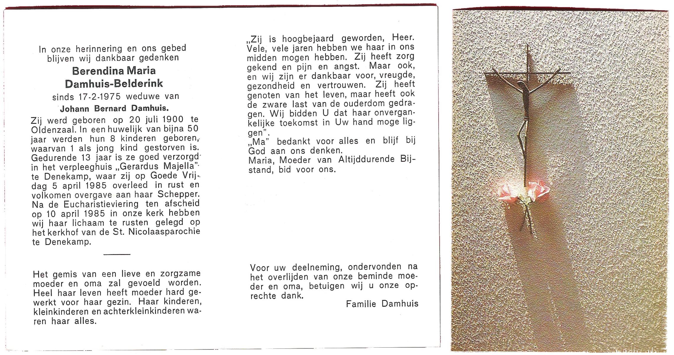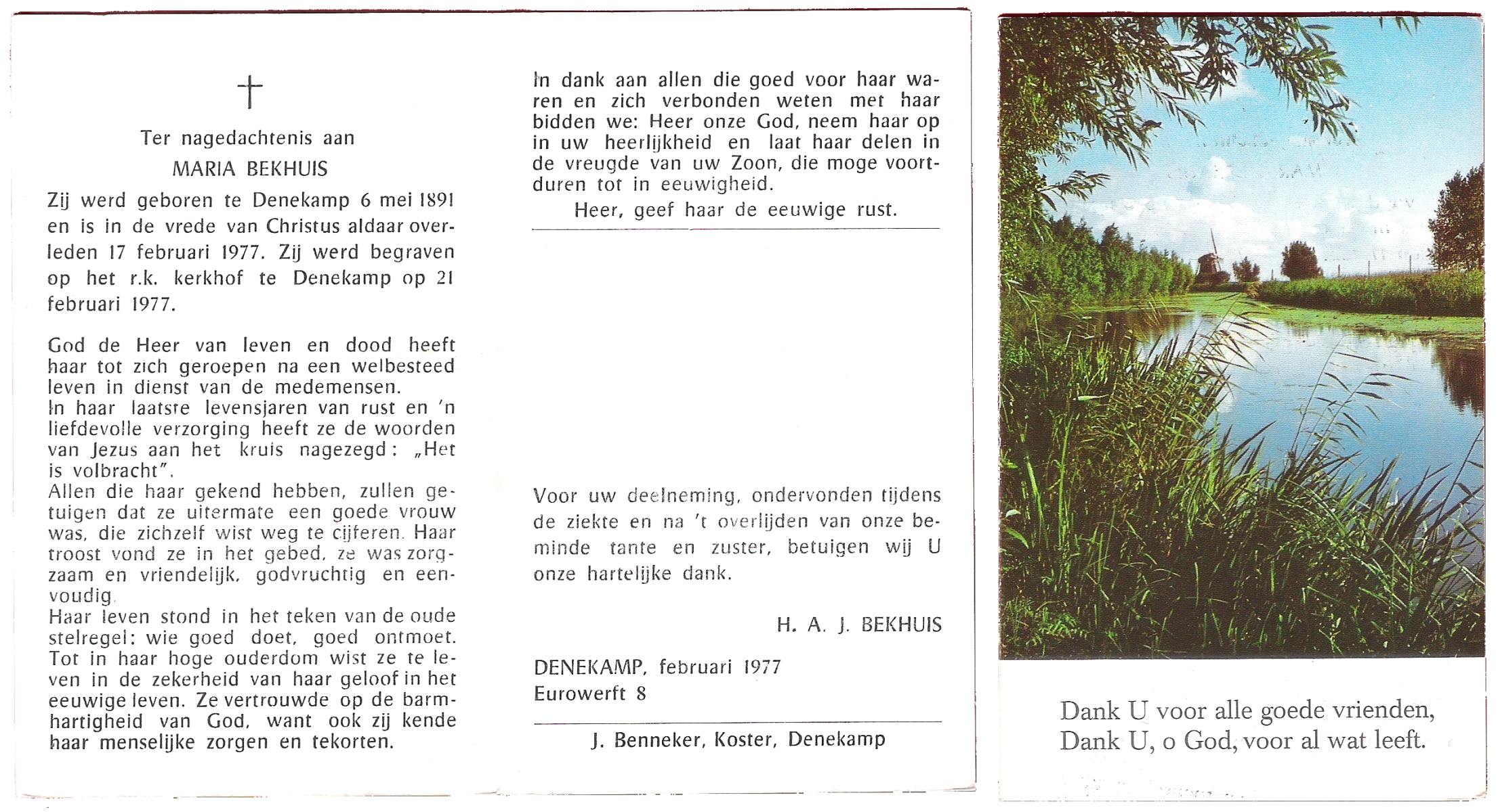 BEKHUIS, Maria, geboren op 06-05-1891 te Denekamp, overleden op 17-2-1977 te Denekamp op 86-jarige leeftijd, begraven op 21-2-1977 te Denekamp.