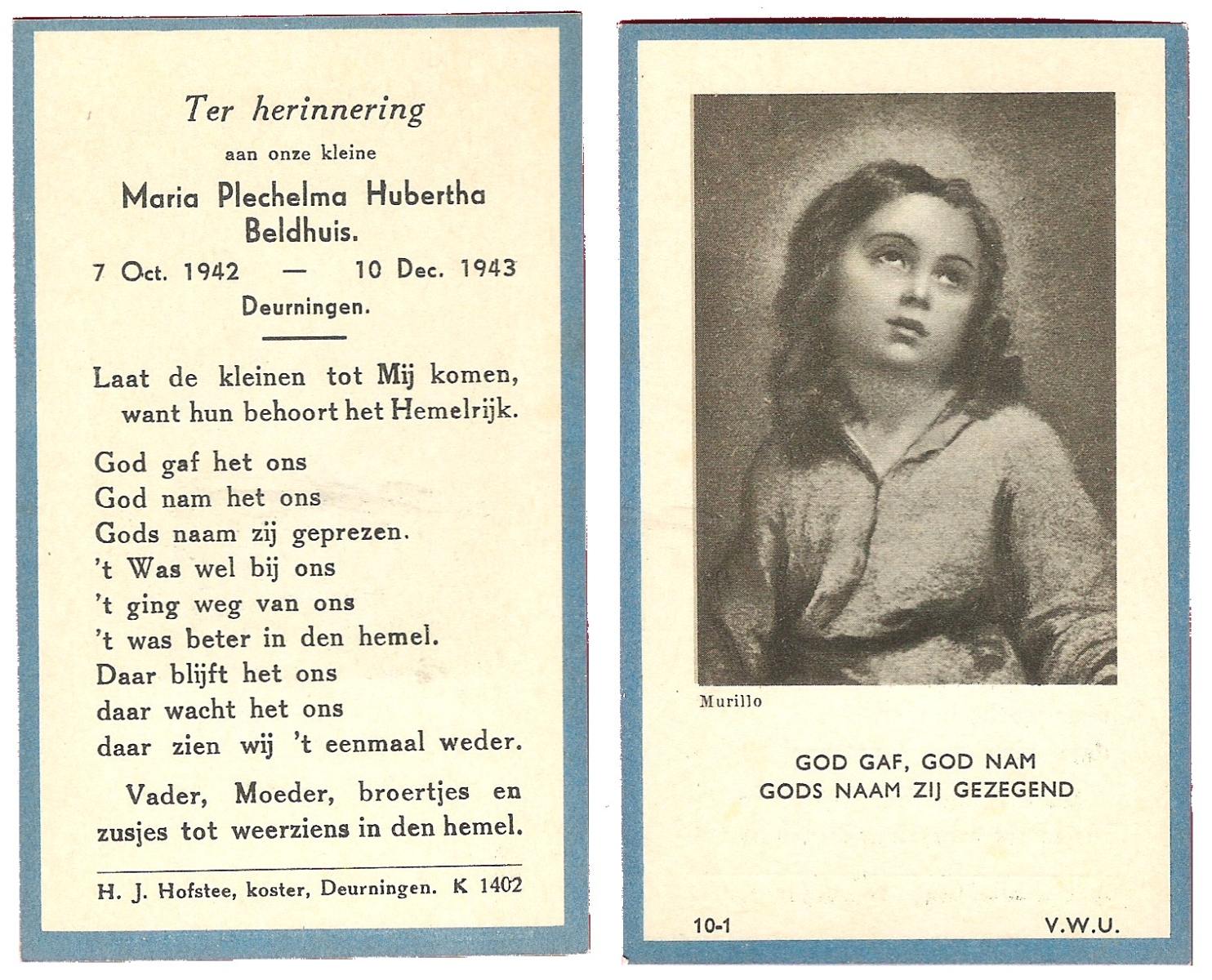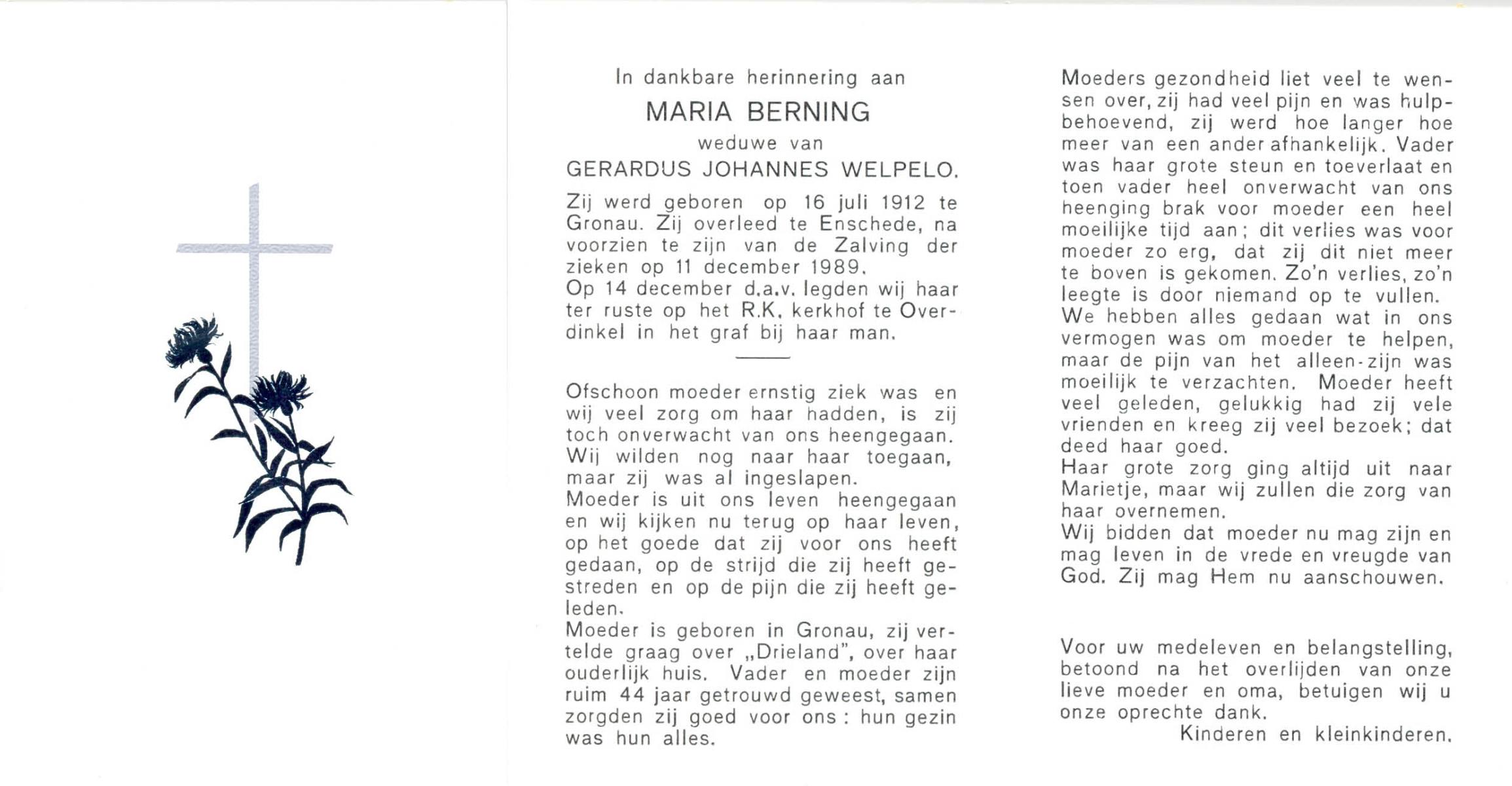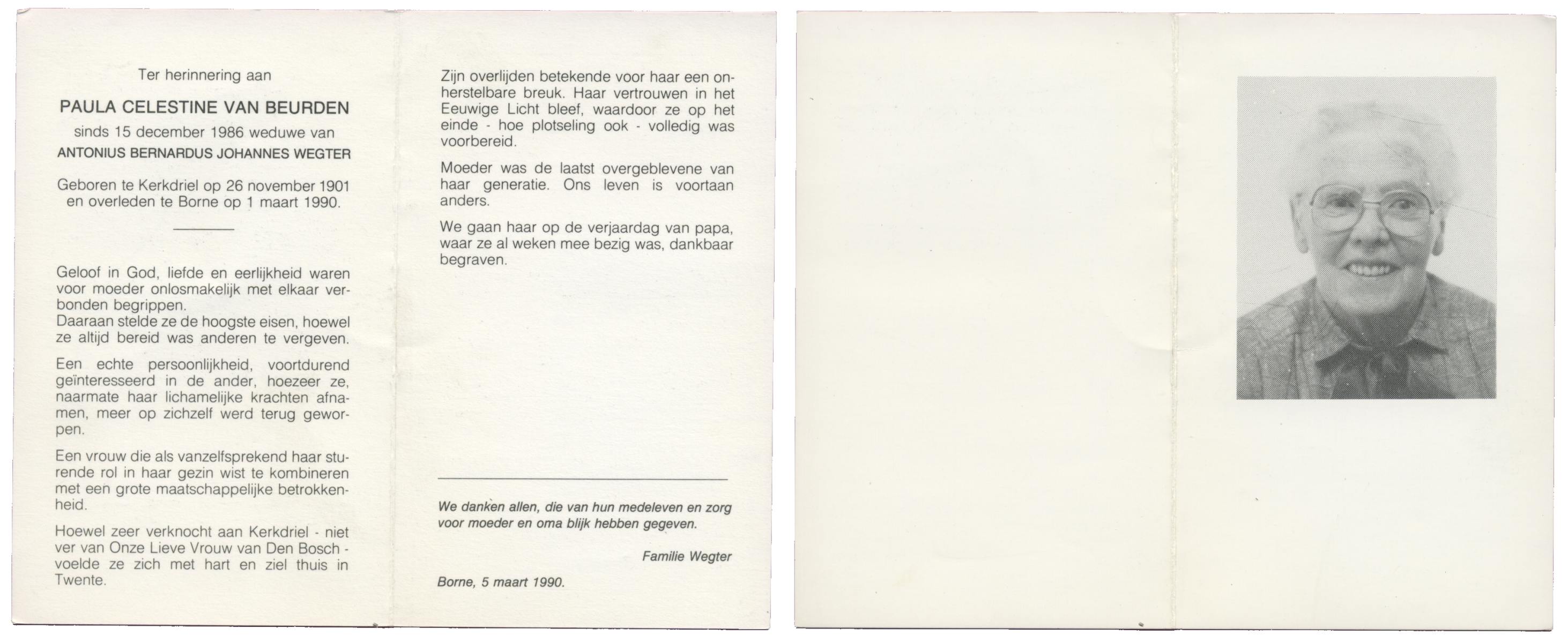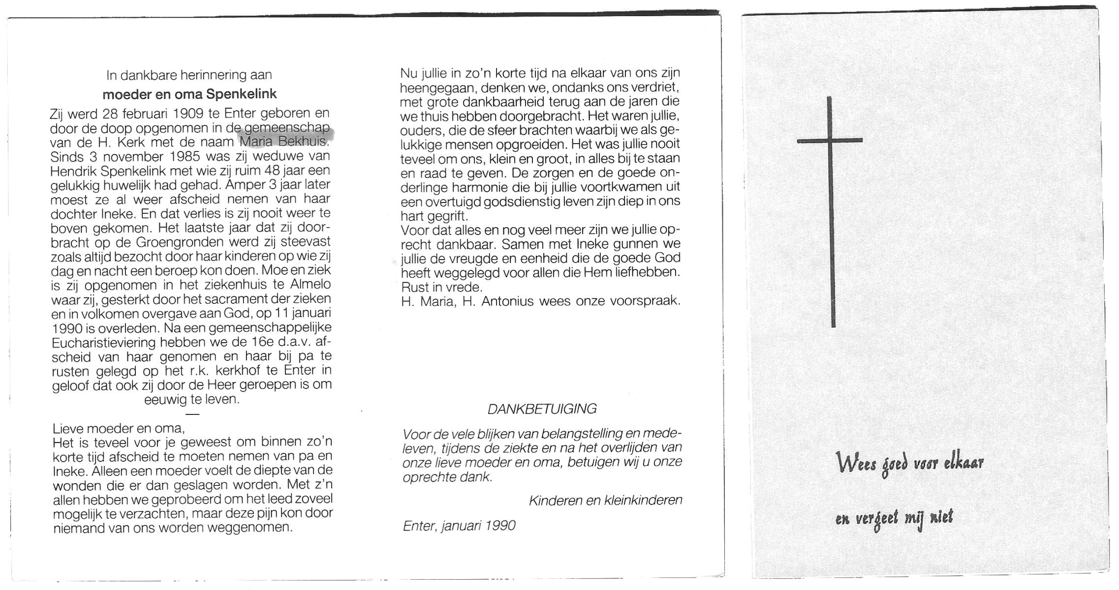 BEKHUIS, Maria, geboren op 28-2-1909 te Wierden, Enter, overleden op 11-1-1990 op 80-jarige leeftijd, begraven op 16-1-1990 te Wierden, Enter.