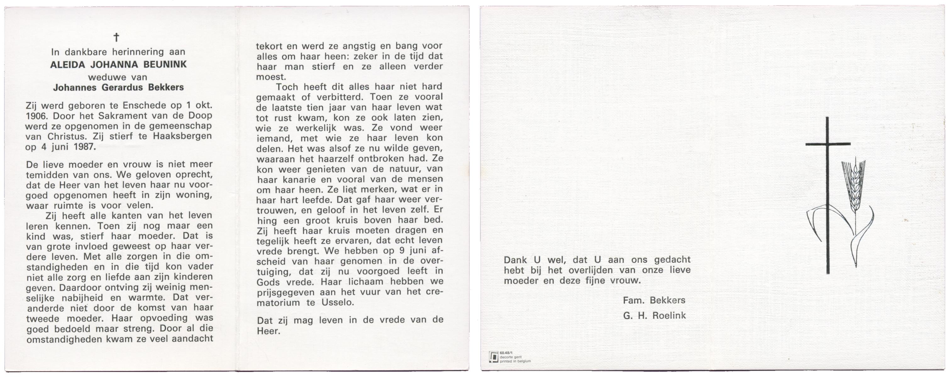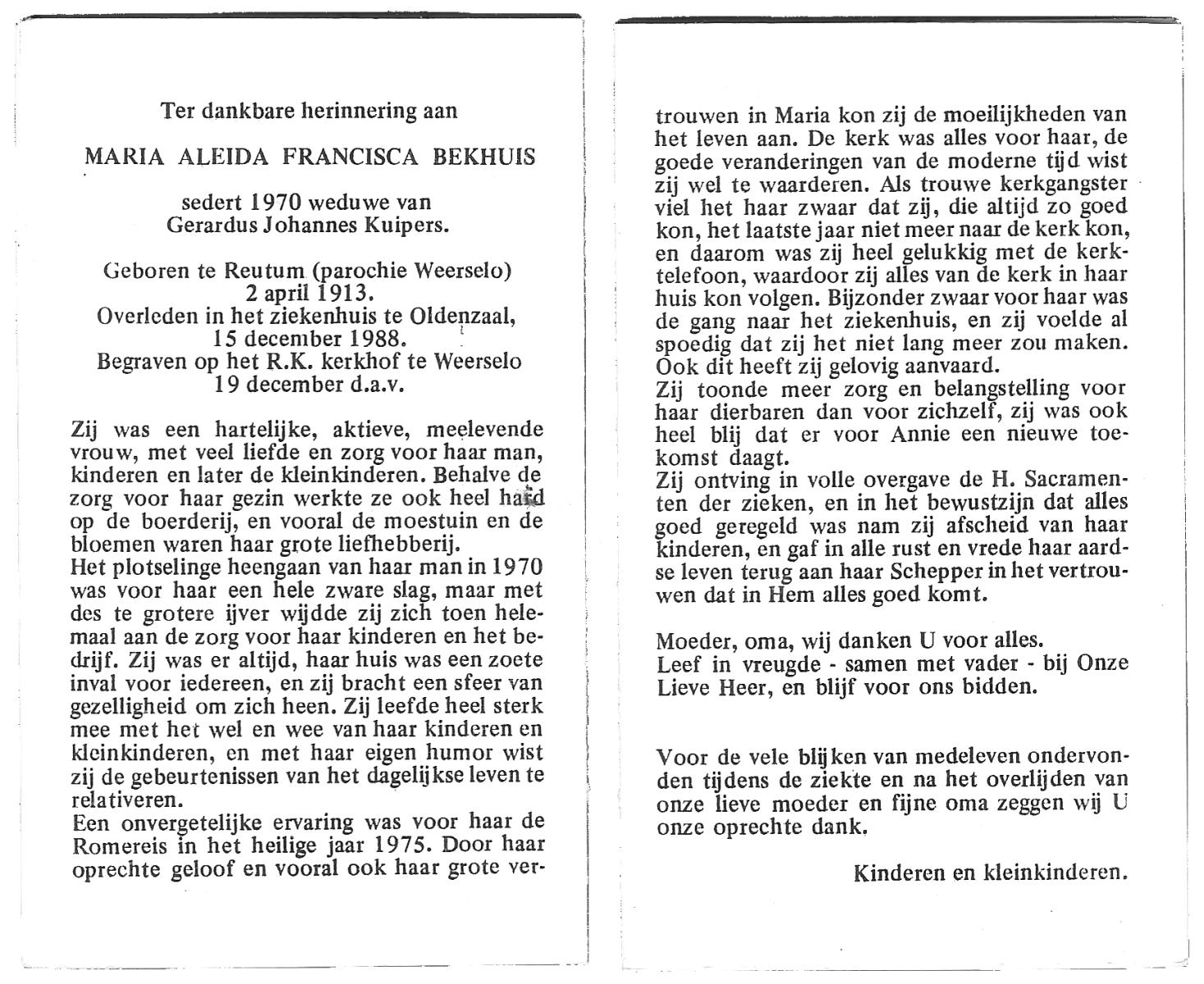 BEKHUIS, Maria Aleida Francisca, geboren op 2-4-1913 te Reutum, overleden op 15-12-1988 te Oldenzaal op 75-jarige leeftijd, begraven op 19-12-1988 te Weerselo.