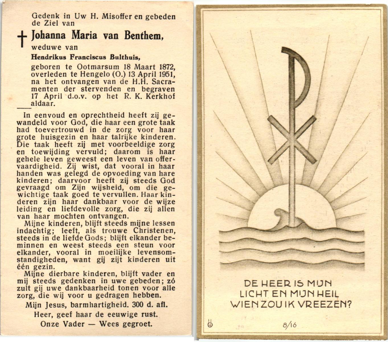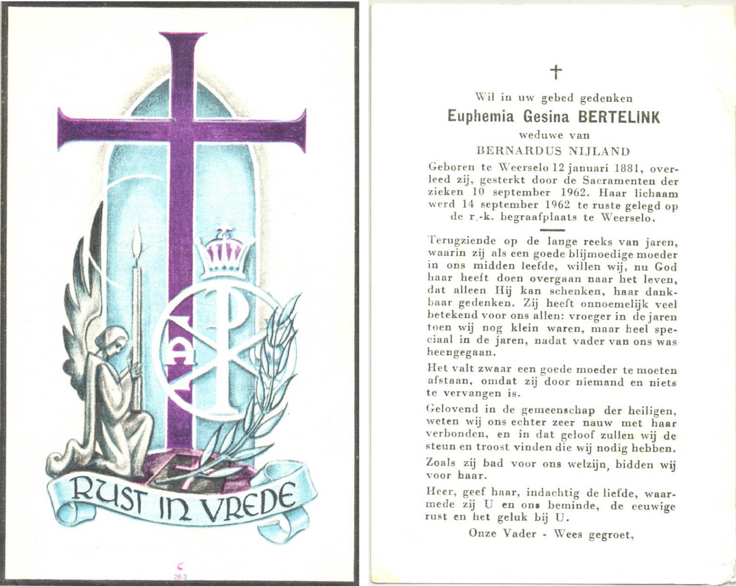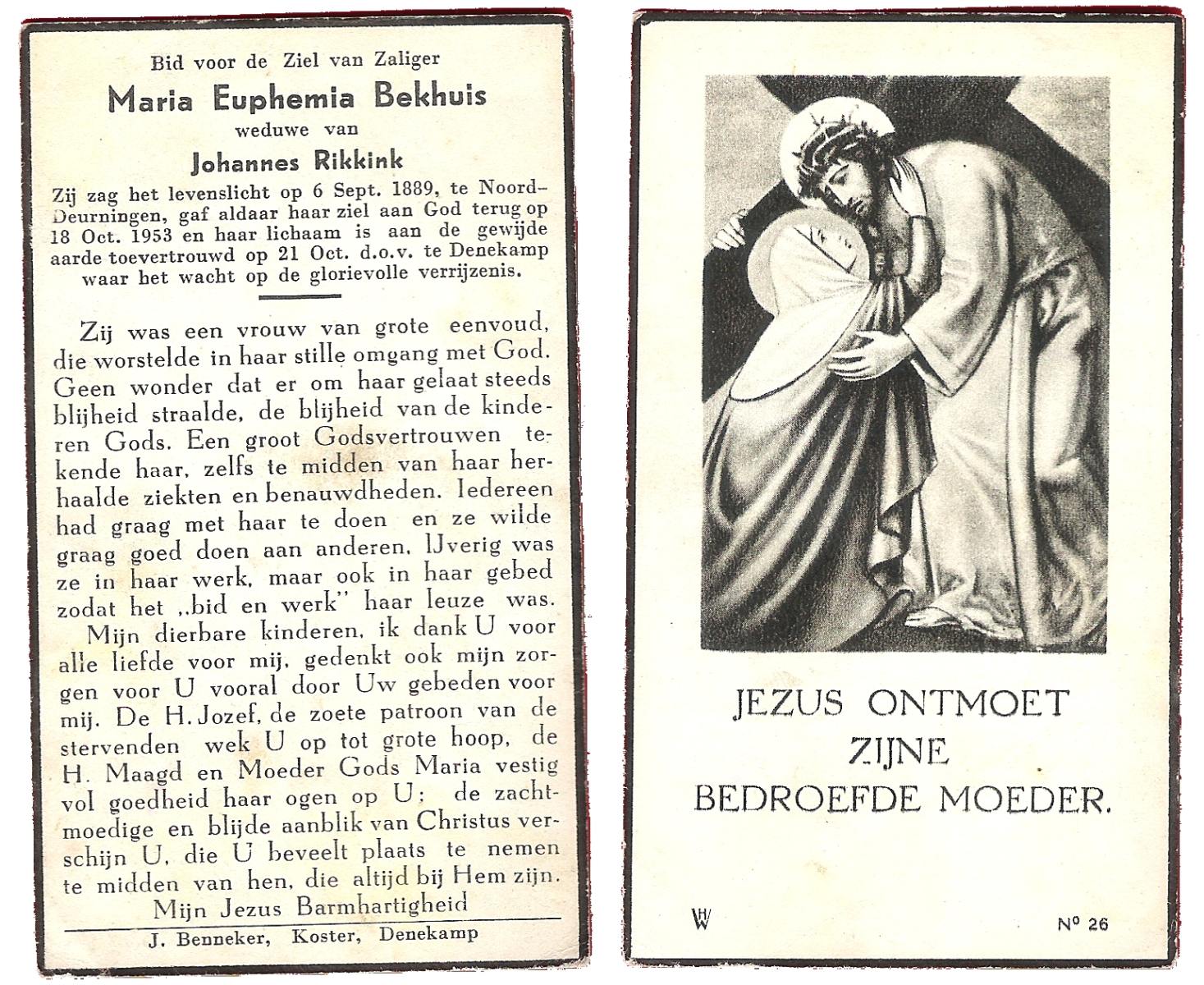 BEKHUIS, Maria Euphemia, geboren op 06-09-1889 te Noord Deurningen, overleden op 18-10-1953 te Noord Deurningen op 64-jarige leeftijd, begraven op 21-10-1953 te Denekamp.