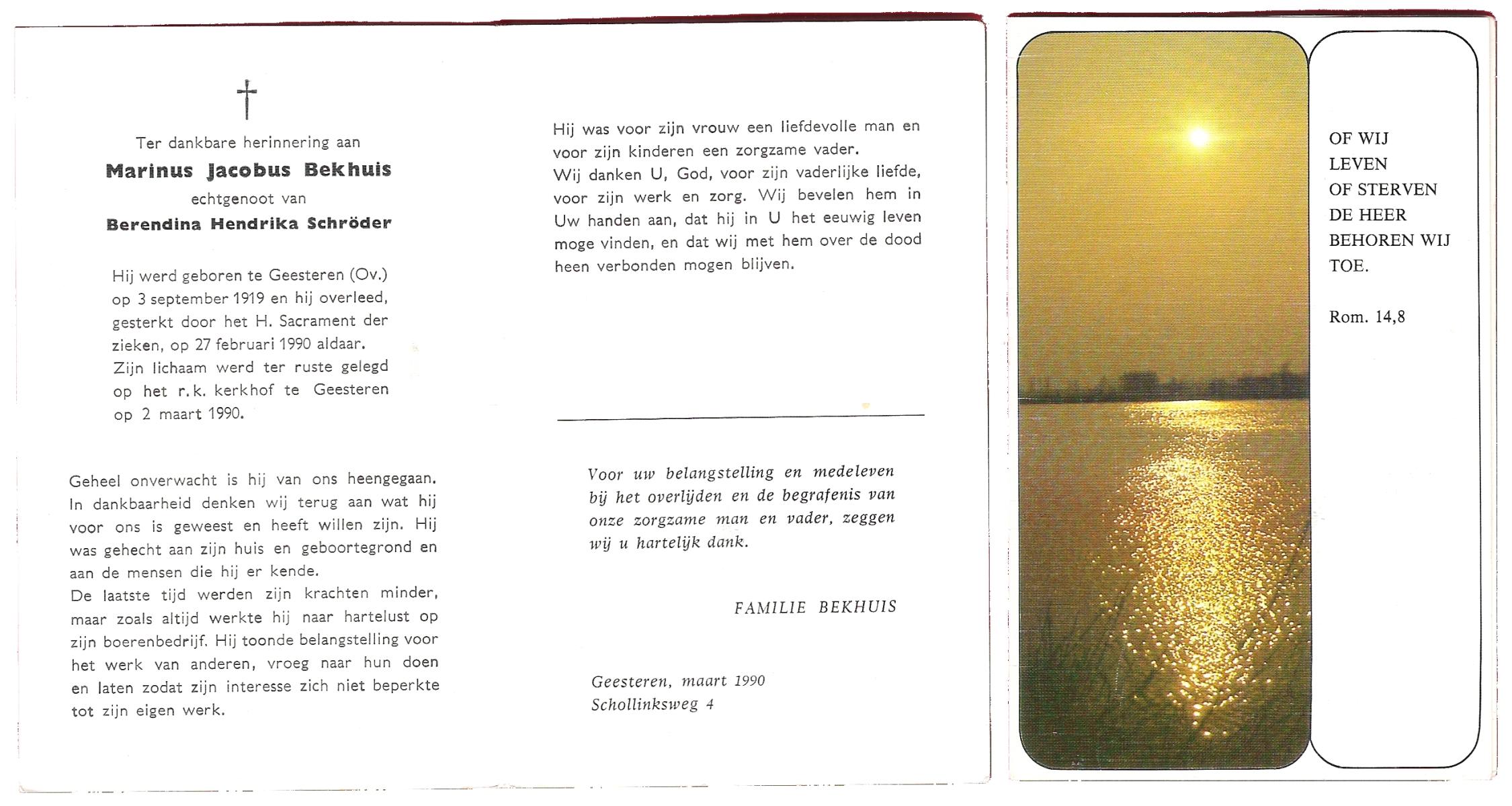 BEKHUIS, Marinus Jacobus, geboren op 3-9-1919 te Geesteren (Ov.), overleden op 27-2-1990 te Geesteren op 71-jarige leeftijd, begraven op 2-3-1990 te Geesteren.