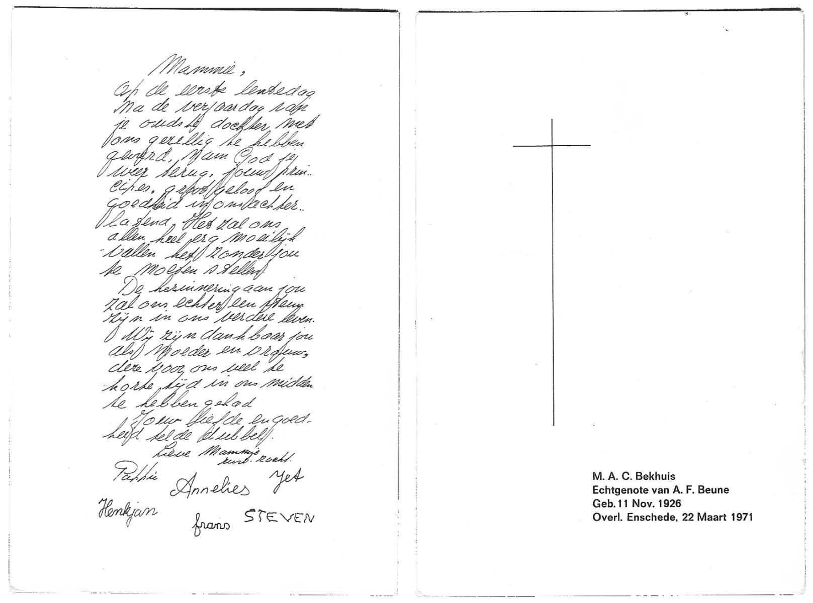BEKHUIS, M.A.C., geboren op 11-11-1926, overleden op 22-3-1971 te Enschede op 44-jarige leeftijd.