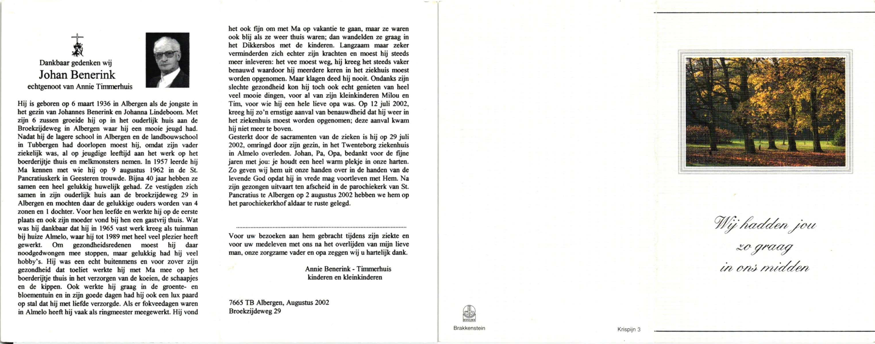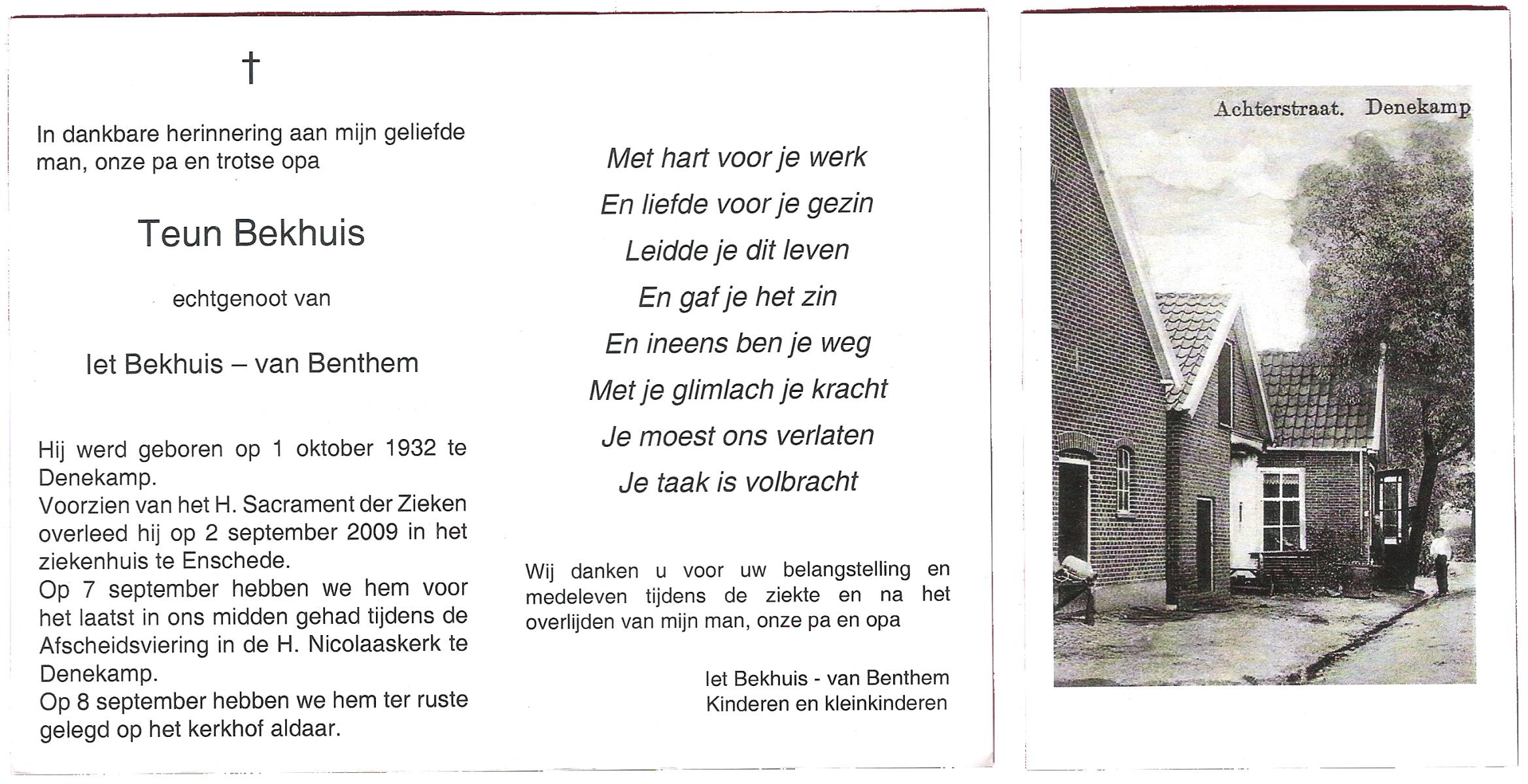 BEKHUIS, Teun, geboren op 1-10-1932 te Denekamp, overleden op 2-9-2009 te Enschede op 76-jarige leeftijd, begraven op 8-9-2009 te Denekamp.