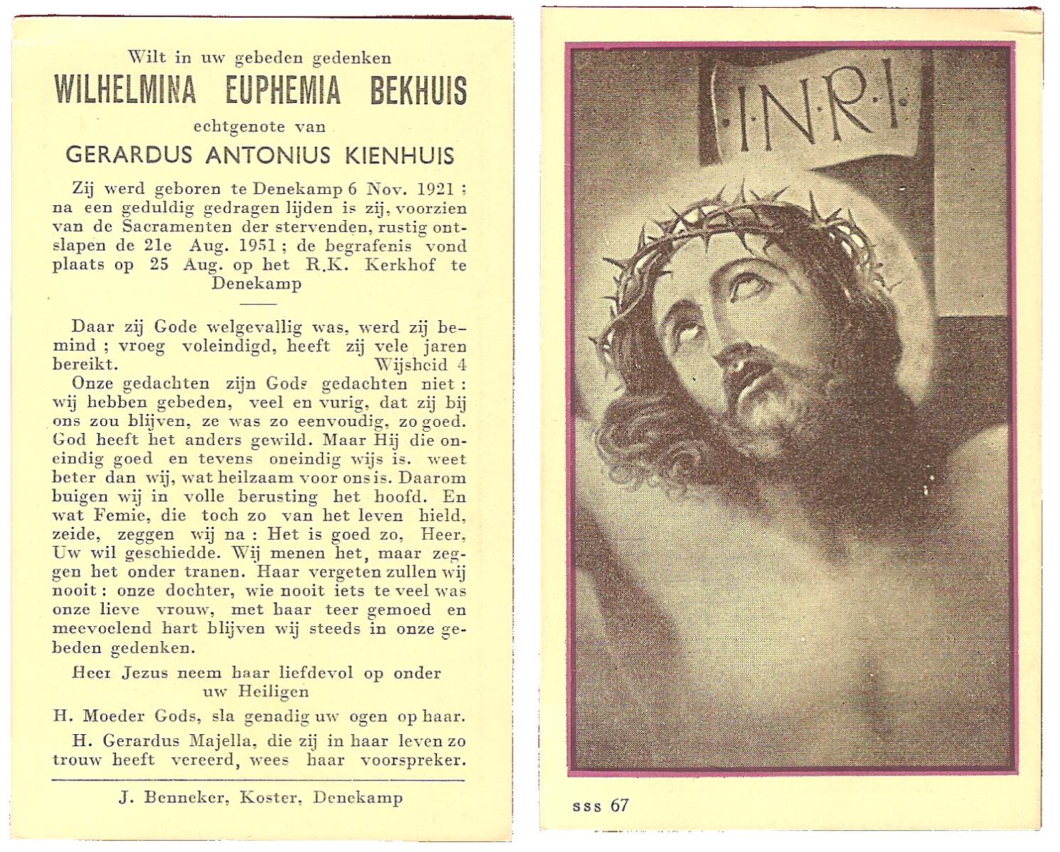 BEKHUIS, Wilhelmina Euphemia, geboren op 6-11-1921 te Denekamp, overleden op 21-8-1951 op 29-jarige leeftijd, begraven op 25-8-1951 te Denekamp.