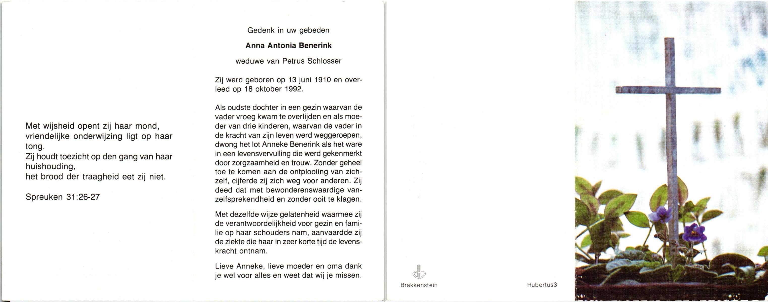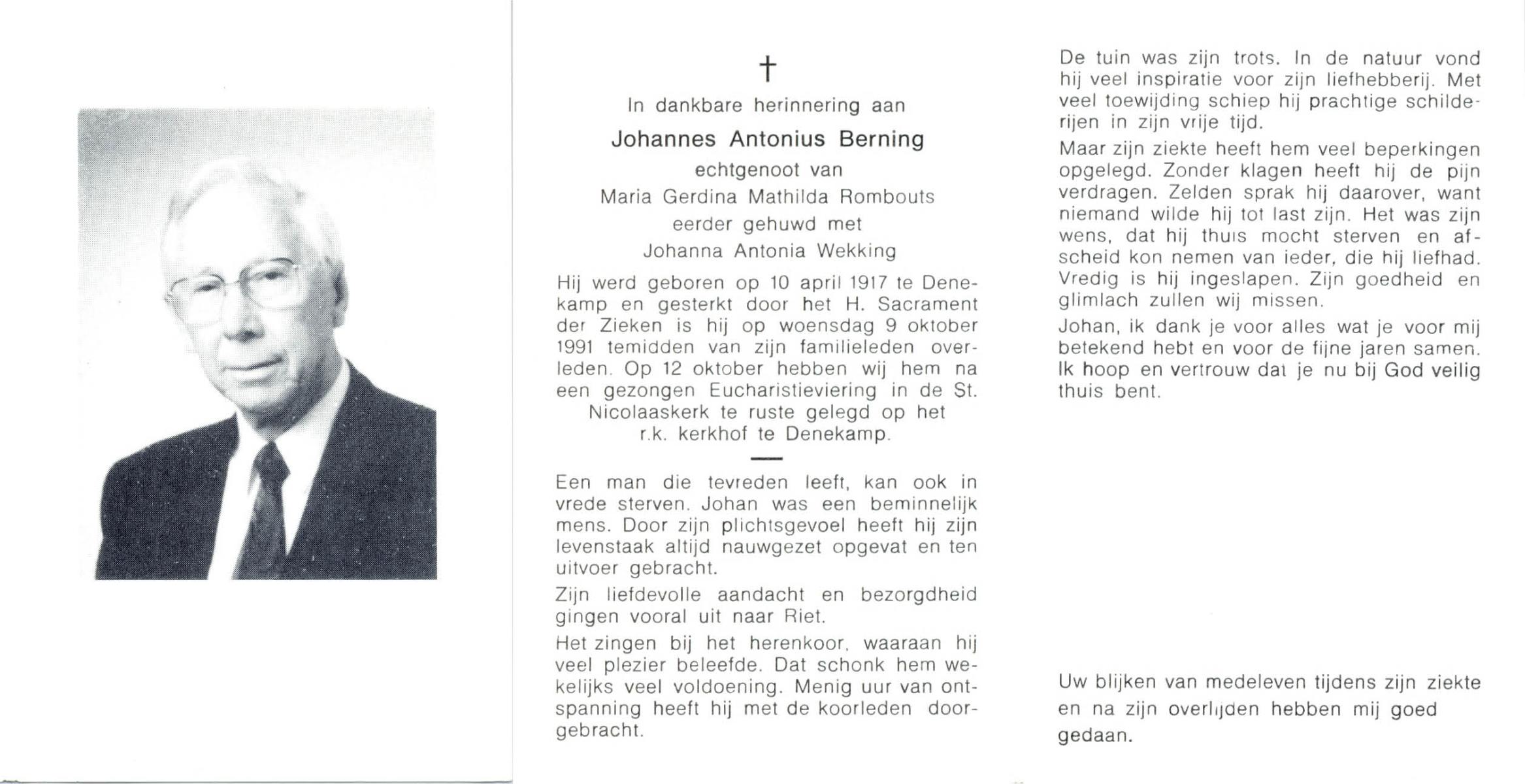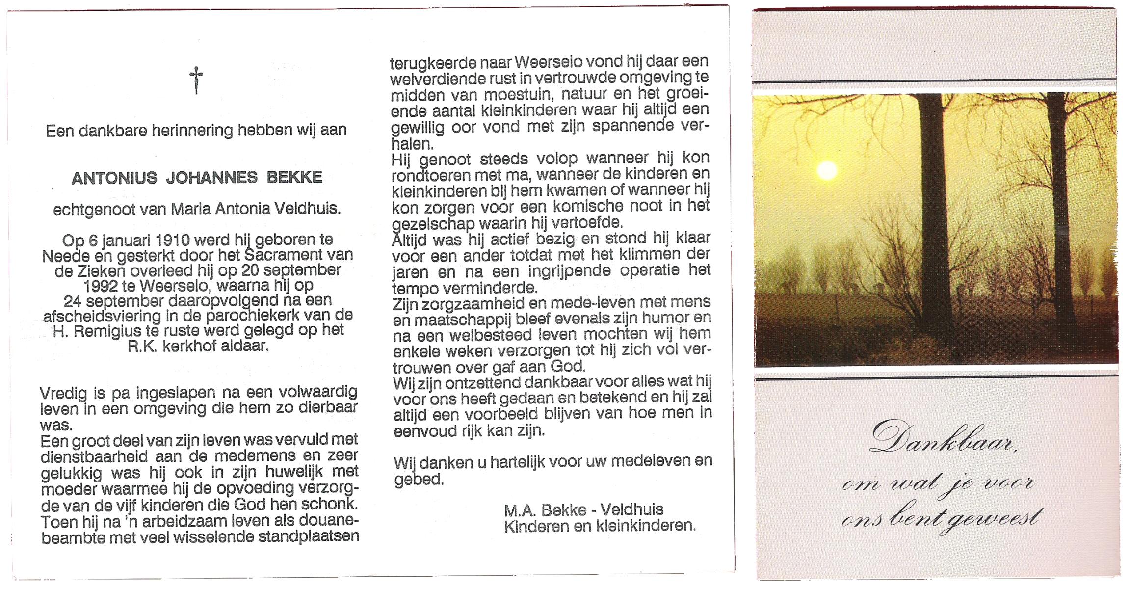 BEKKE, Antonius Johannes, geboren op 6-1-1910 te Neede, overleden op 20-9-1992 te Weerselo op 82-jarige leeftijd, begraven op 24-9-1992 te Weerselo.