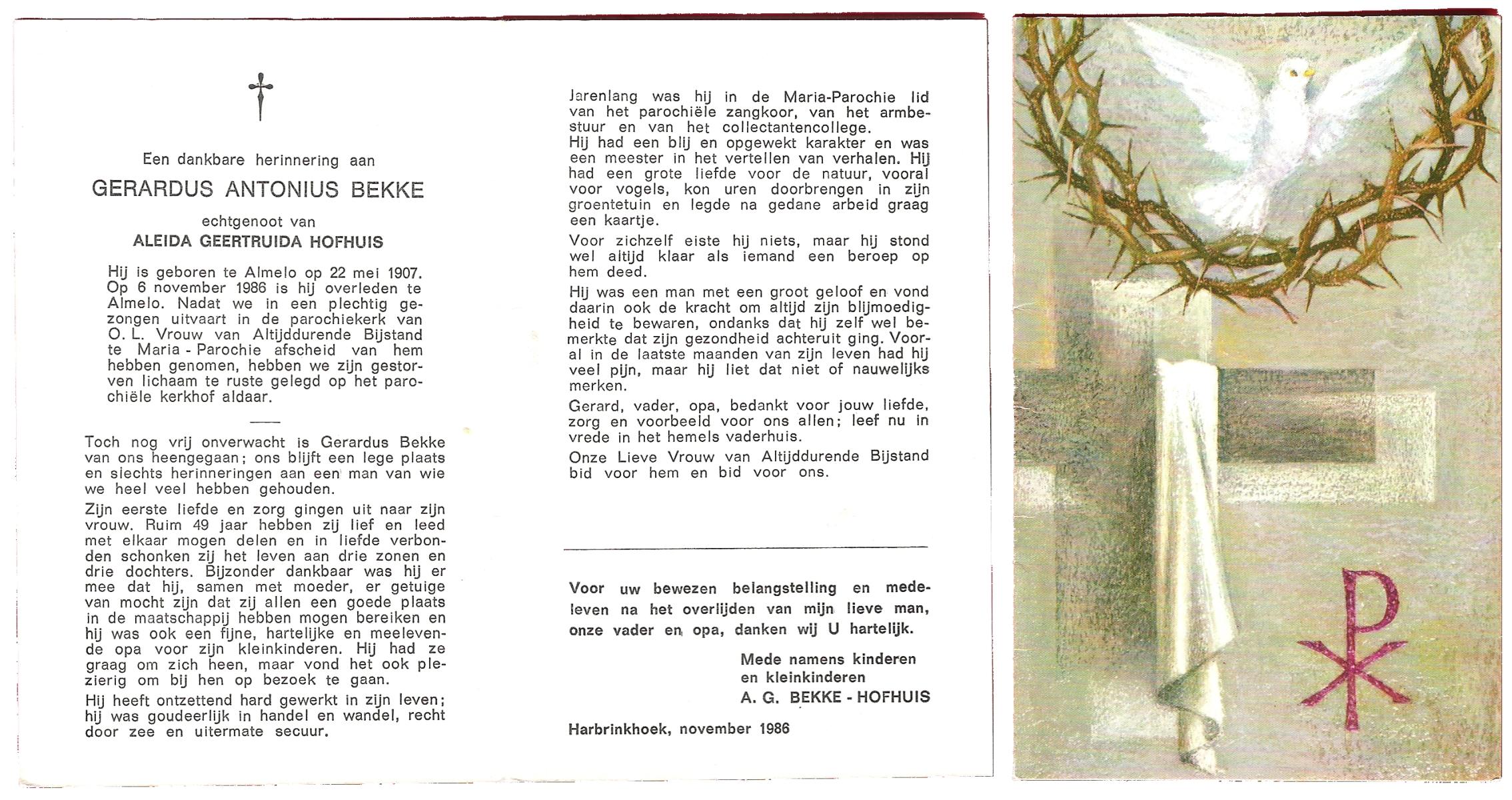 BEKKE, Gerardus Antonius, geboren op 22-5-1907 te Almelo, overleden op 6-11-1986 te Almelo op 79-jarige leeftijd, begraven te Almelo.