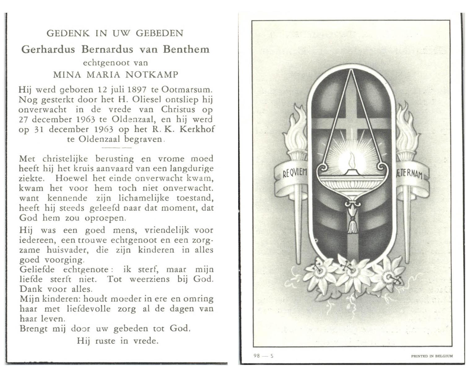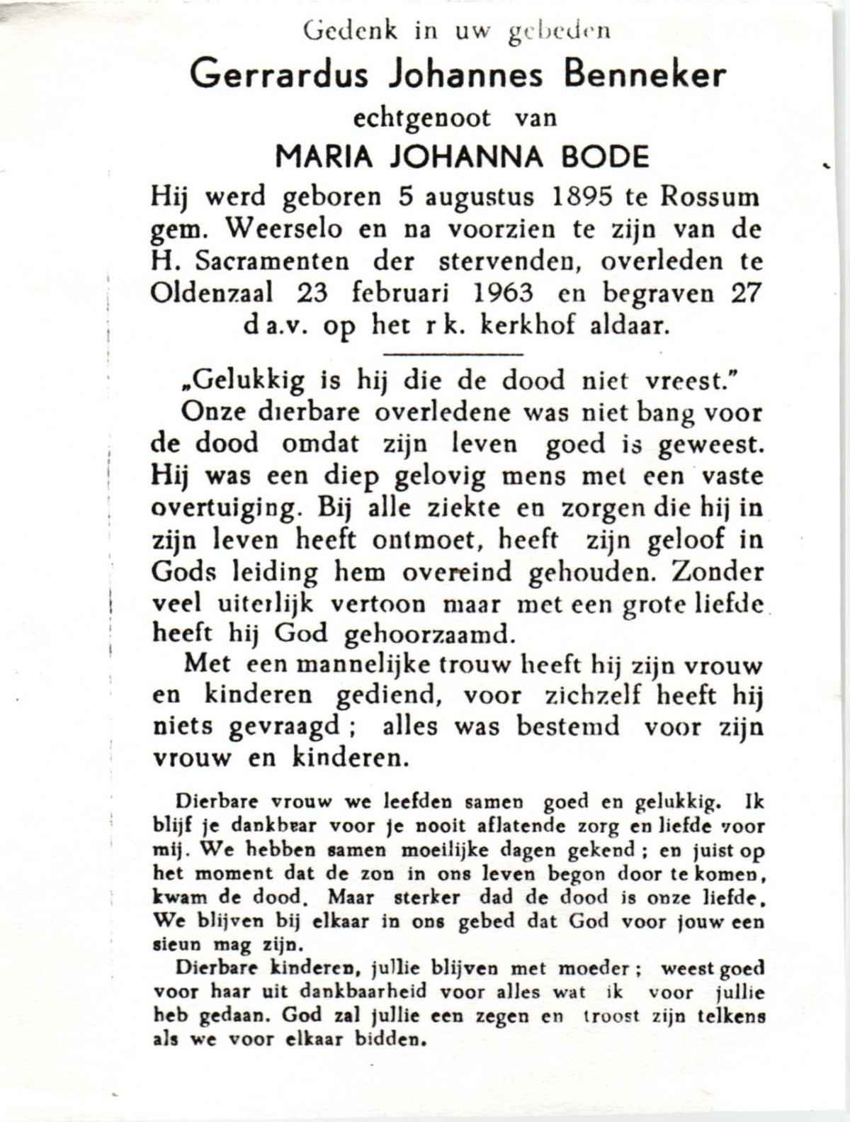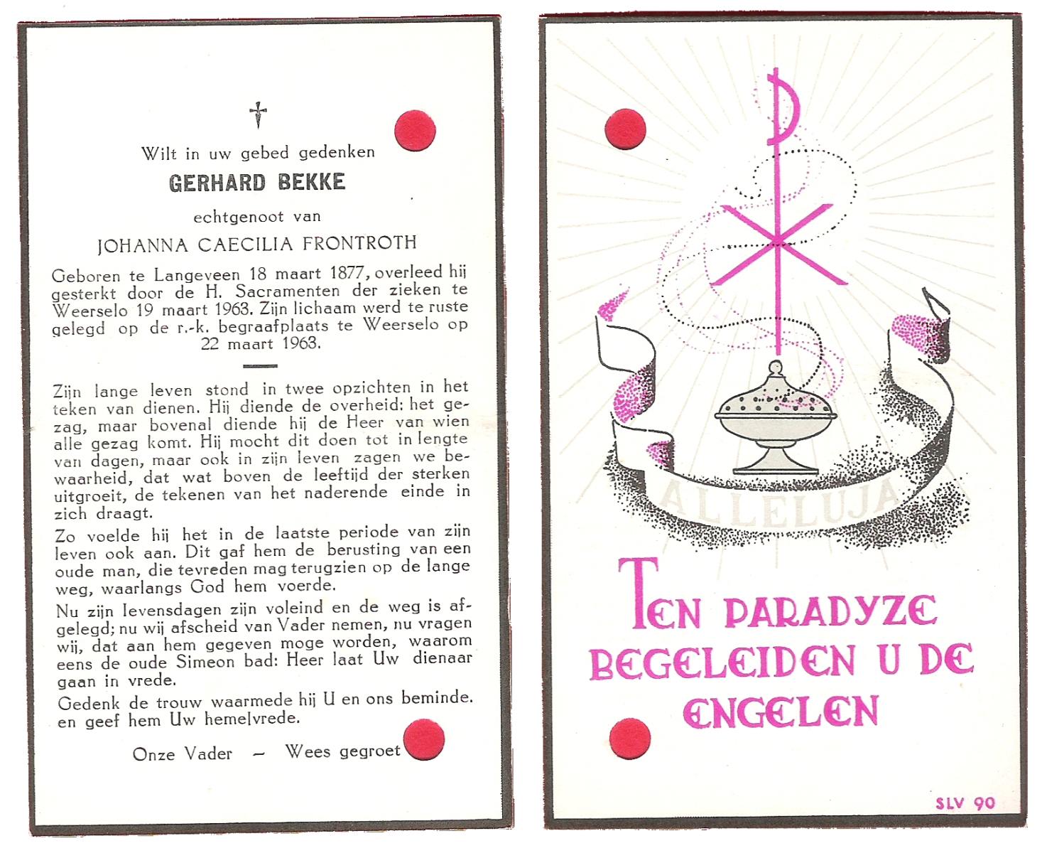 BEKKE, Gerhard, geboren op 18-03-1877 te Langeveen, overleden op 19-3-1963 te Weerselo op 86-jarige leeftijd, begraven op 22-3-1963 te Weerselo.