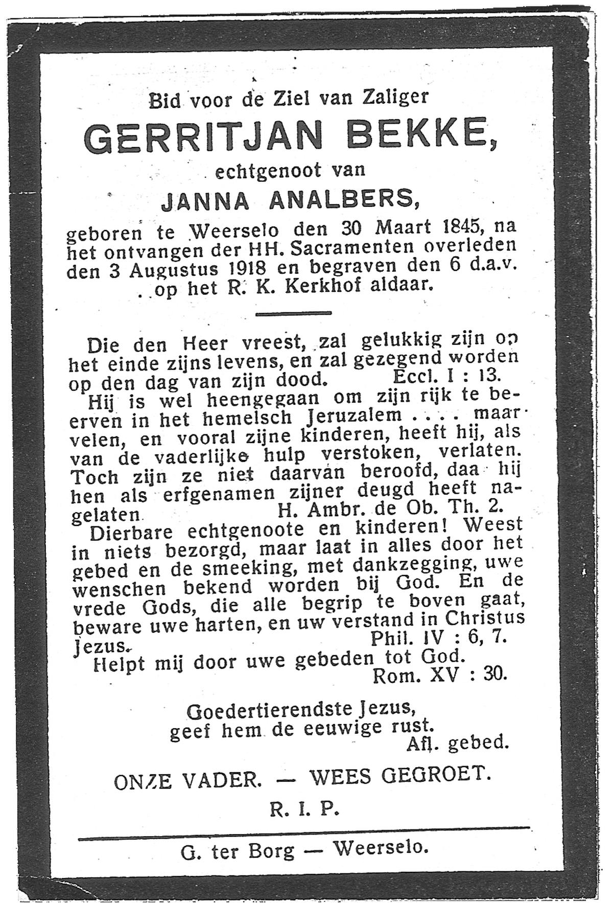 BEKKE, Gerritjan, geboren op 30-03-1845 te Weerselo, overleden op 3-8-1918 op 73-jarige leeftijd, begraven op 6-8-1918.