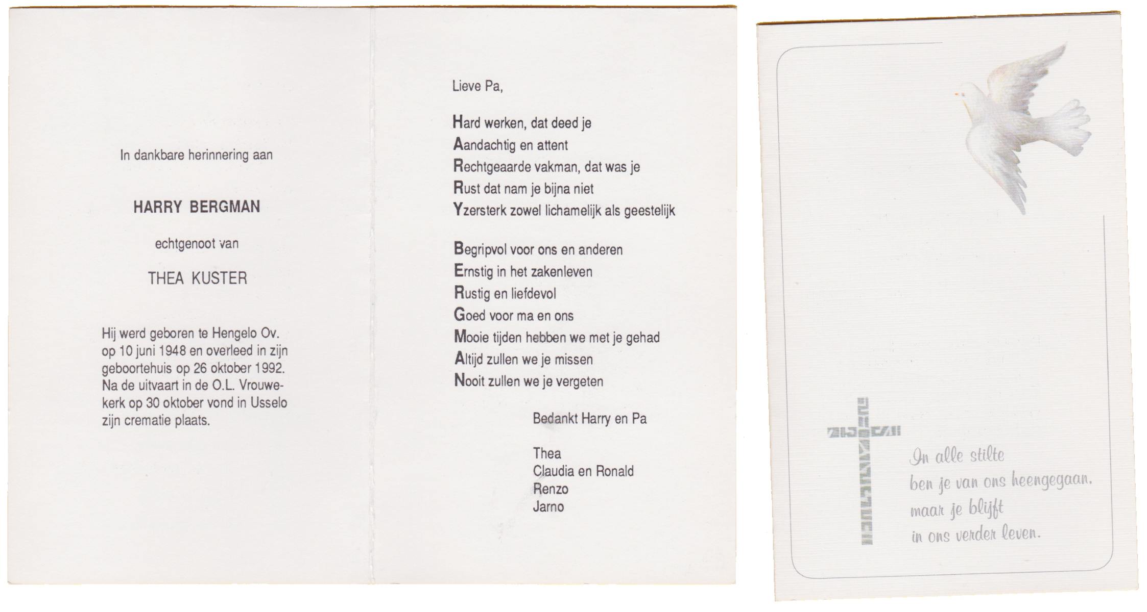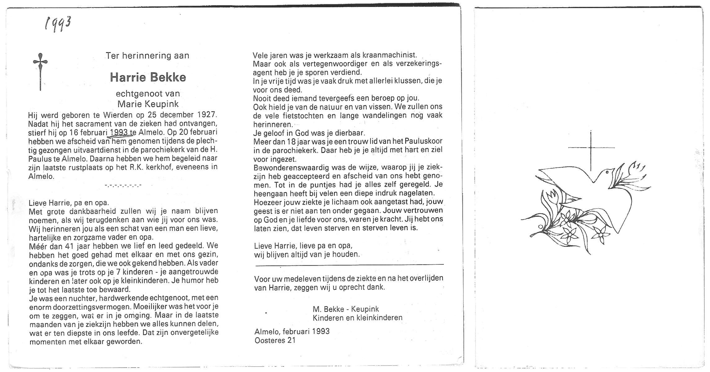 BEKKE, Harrie, geboren op 25-12-1927 te Wierden, overleden op 16-2-1993 te Almelo op 65-jarige leeftijd, begraven op 20-2-1993 te Almelo.