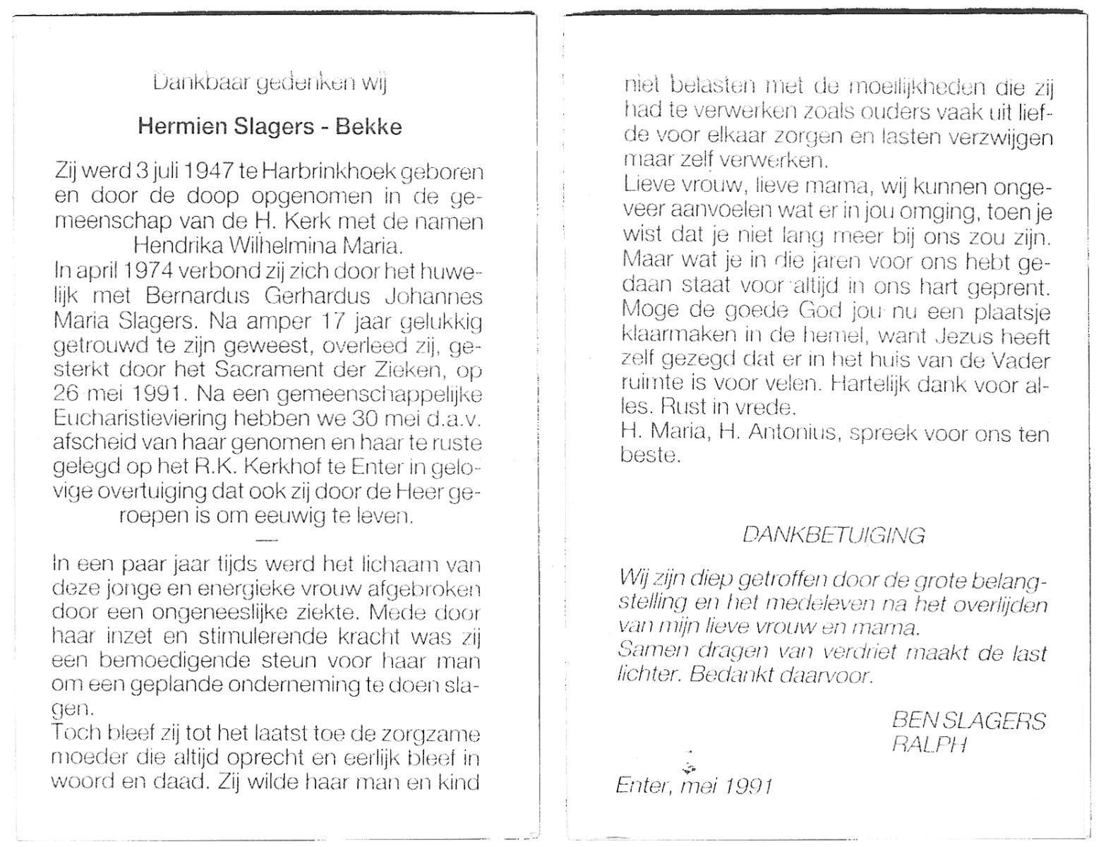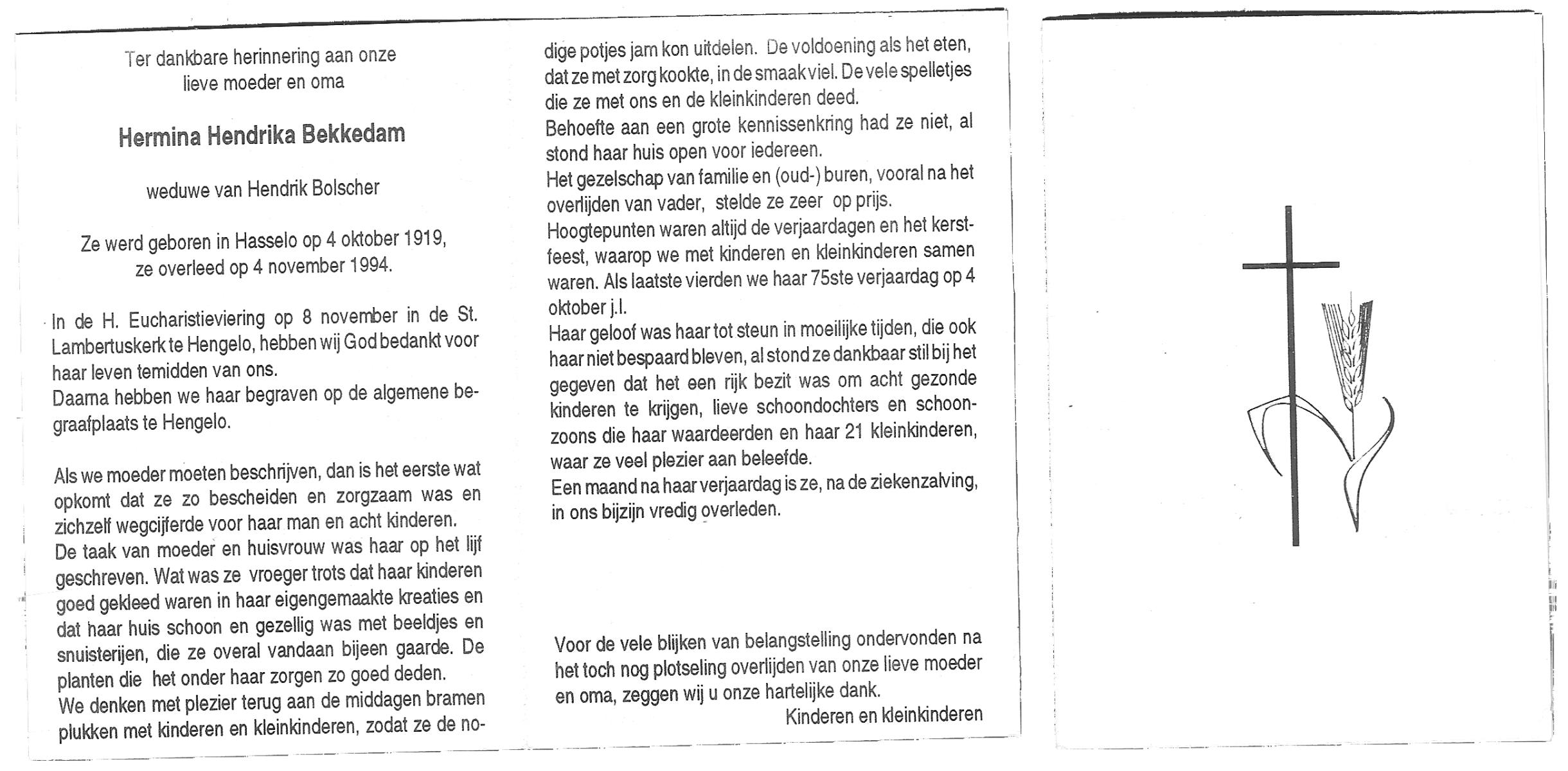BEKKEDAM, Hermina Hendrika, geboren op 4-10-1919 te Hasselo, overleden op 4-11-1994 op 75-jarige leeftijd, begraven op 8-11-1994 te Hengelo (Ov.).