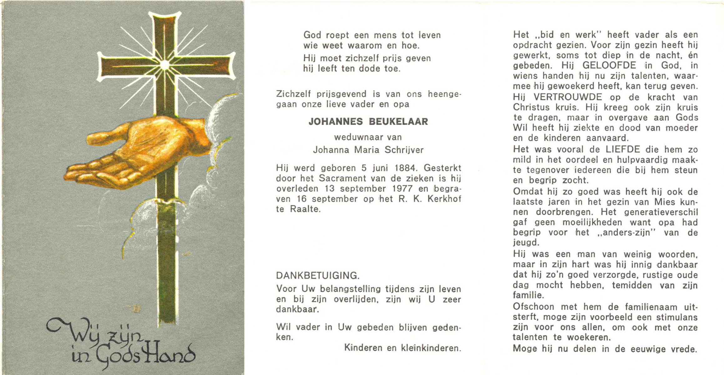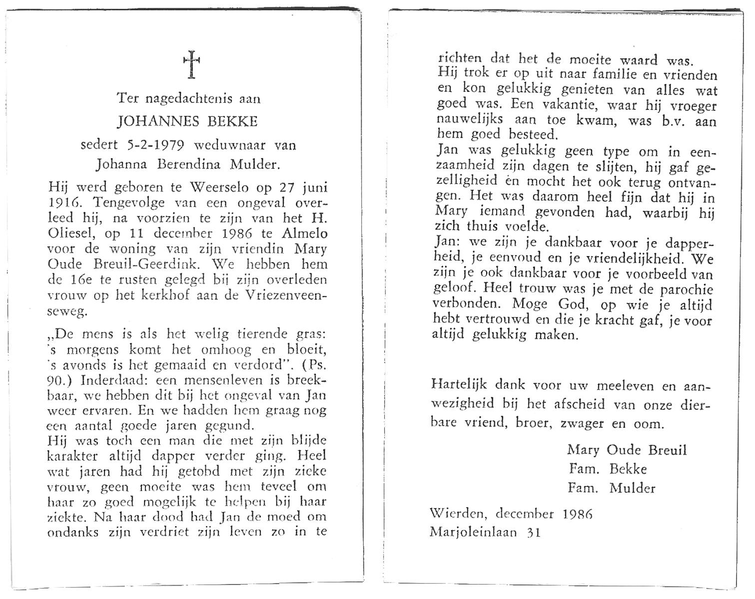 BEKKE, Johannes, geboren op 27-6-1916 te Weerselo, overleden op 11-12-1986 te Almelo op 70-jarige leeftijd, begraven op 16-12-1986 te Wierden.