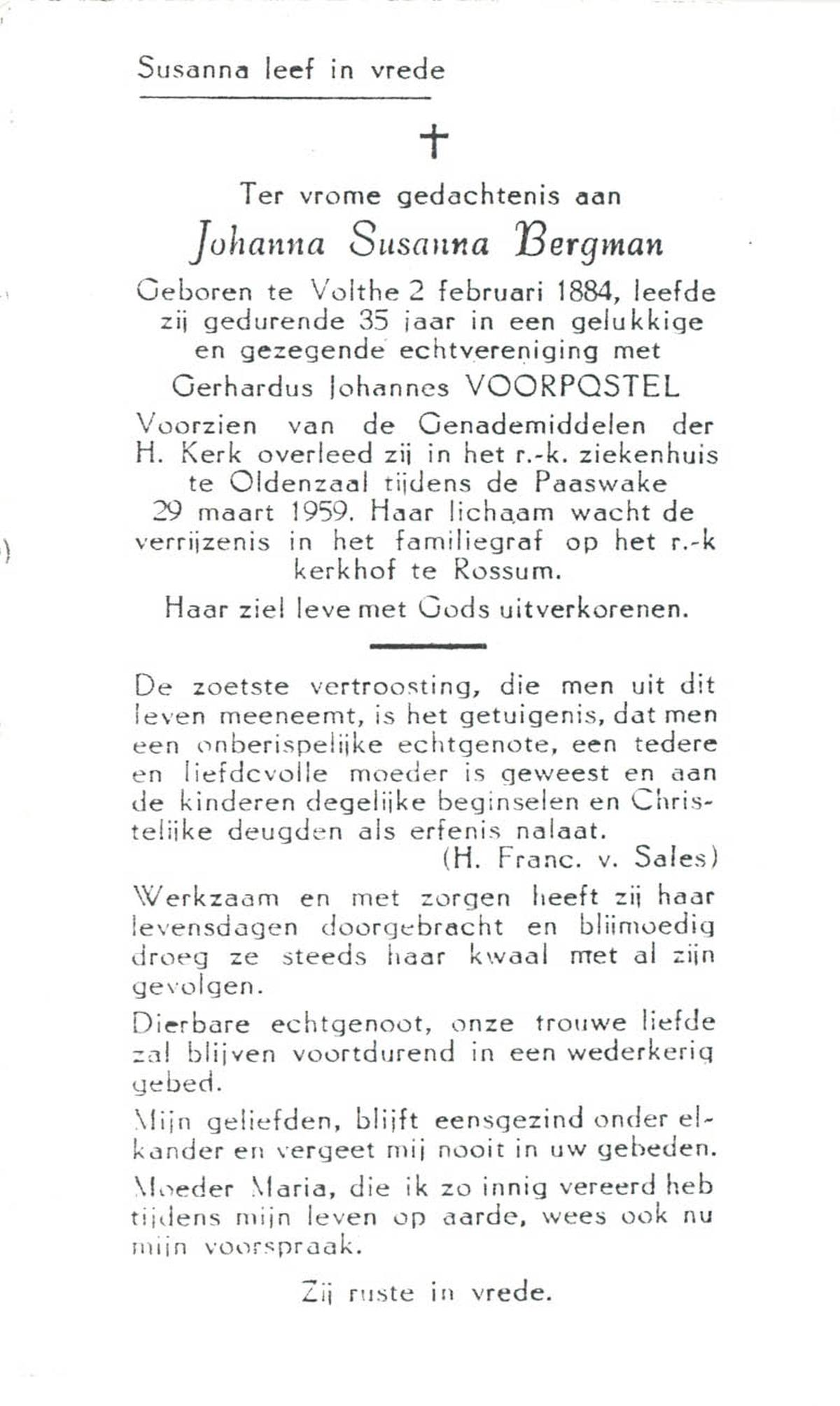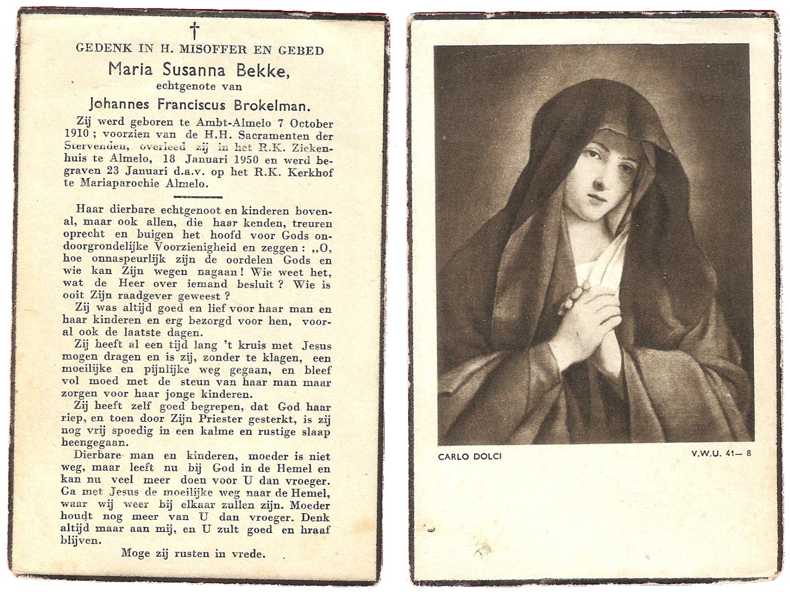 BEKKE, Maria Susanna, geboren op 7-10-1910 te Almelo, Ambt, overleden op 18-1-1950 te Almelo op 39-jarige leeftijd, begraven op 23-1-1950 te Mariaparochie.