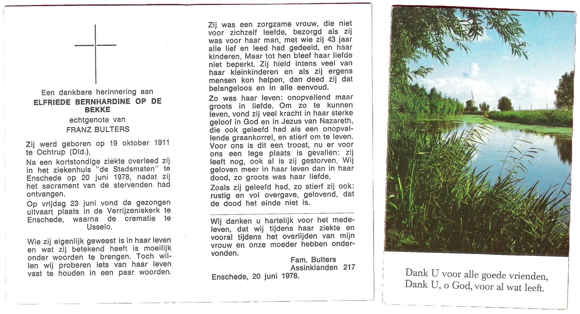 BEKKE, op de, Elfriede Bernhardine, geboren op 19-10-1911 te Ochtrup (Dld.), overleden op 20-6-1978 te Enschede op 66-jarige leeftijd, gecremeerd op 23-6-1978 te Usselo.