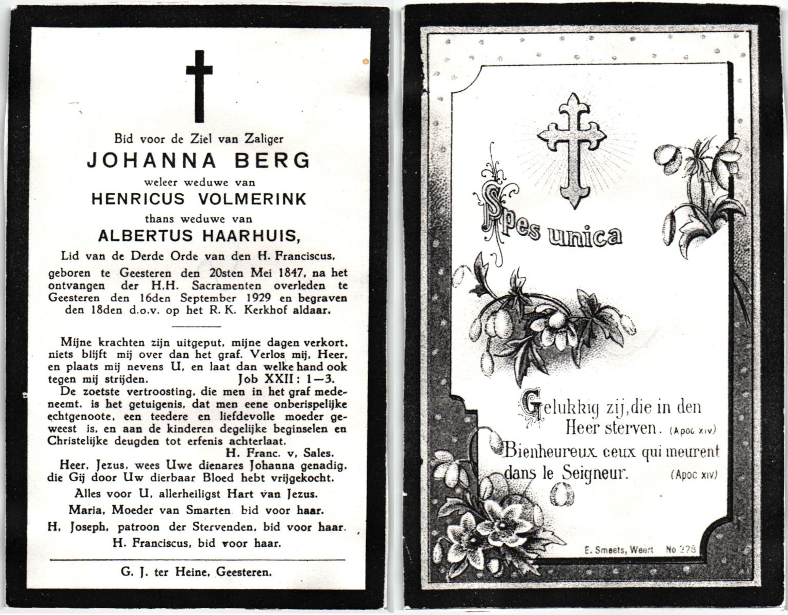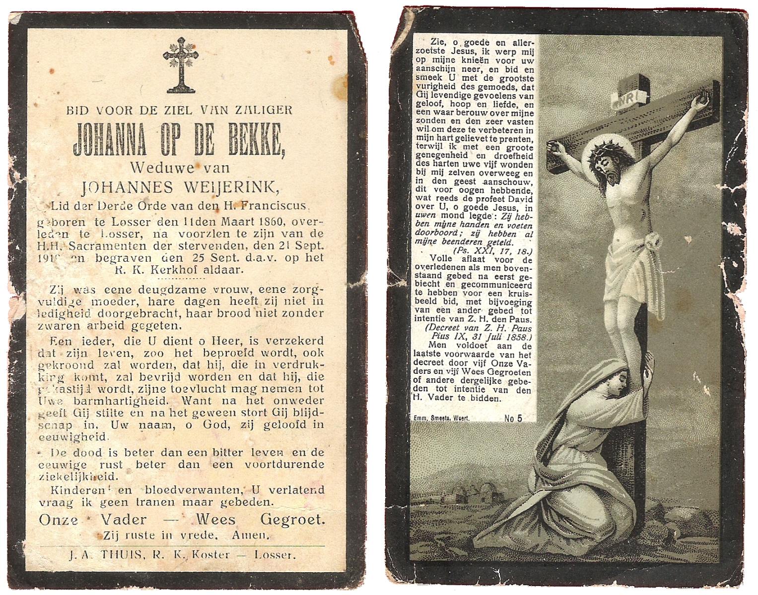 BEKKE, op de, Johanna, geboren op 11-03-1860 te Losser, overleden op 21-9-1919 te Losser op 59-jarige leeftijd, begraven op 25-9-1919 te Losser.