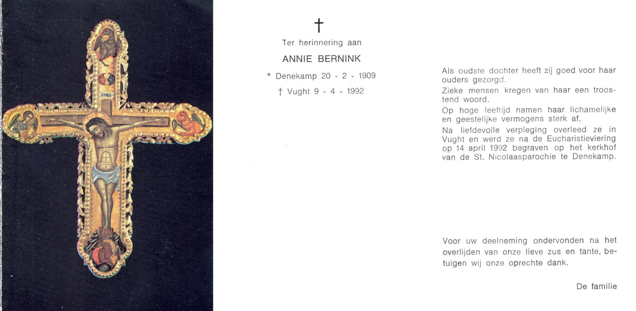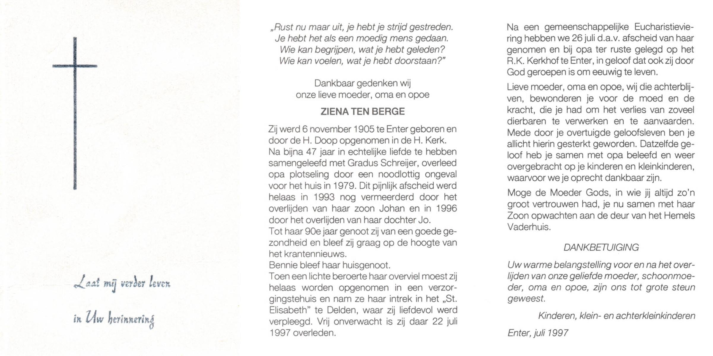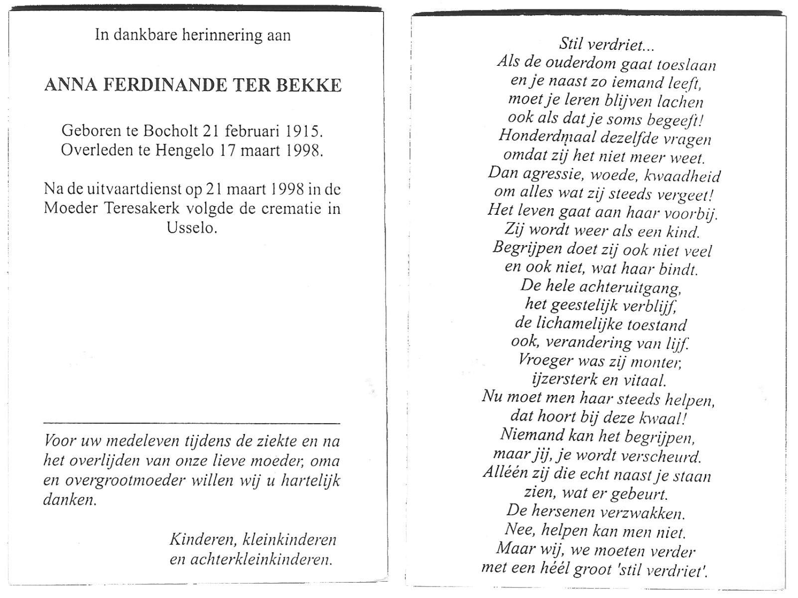 BEKKE, ter, Anna Ferdinande, geboren op 21-2-1915 te Bocholt (Dld), overleden op 17-3-1998 te Hengelo (Ov.) op 82-jarige leeftijd, gecremeerd op 21-3-1998 te Usselo.