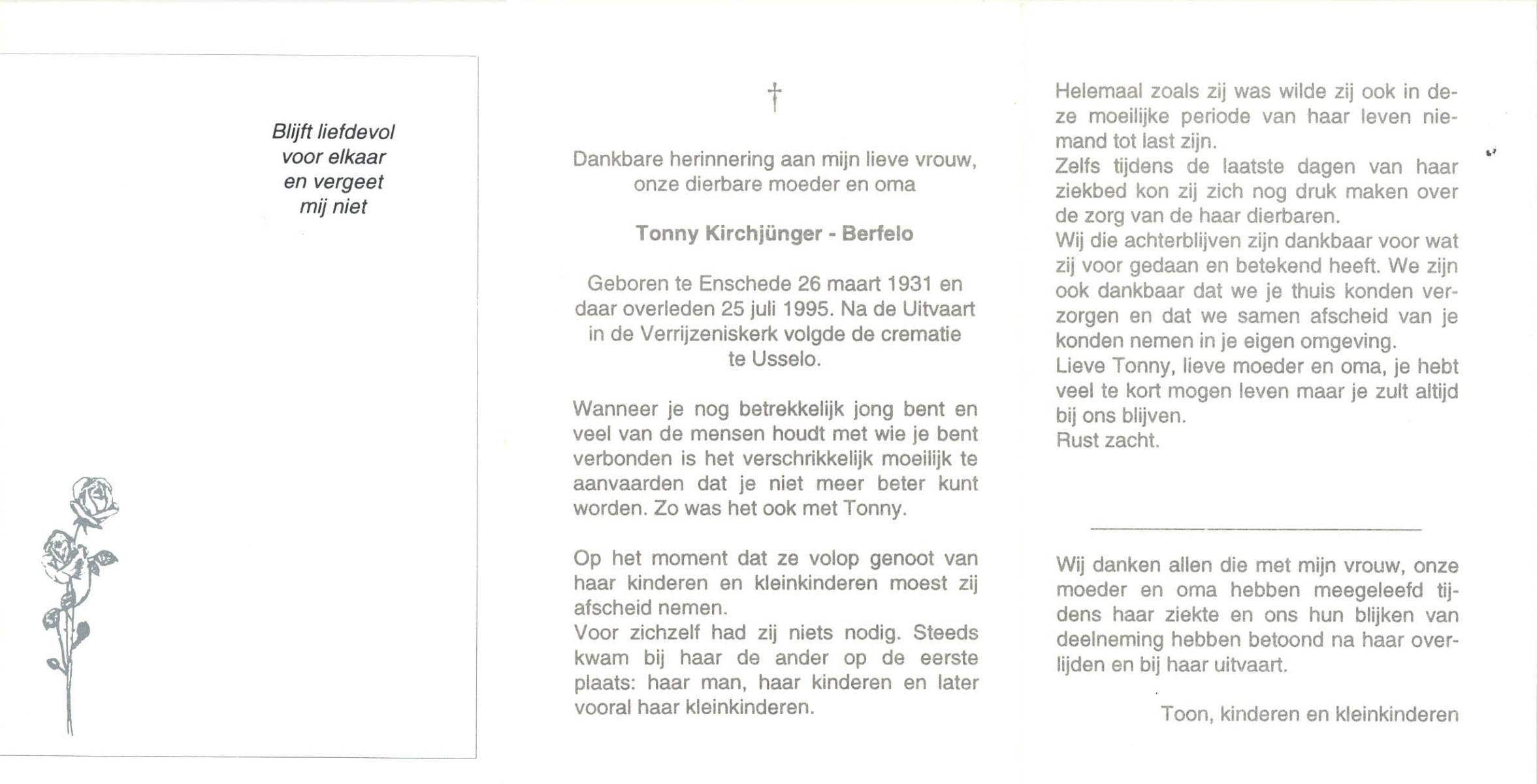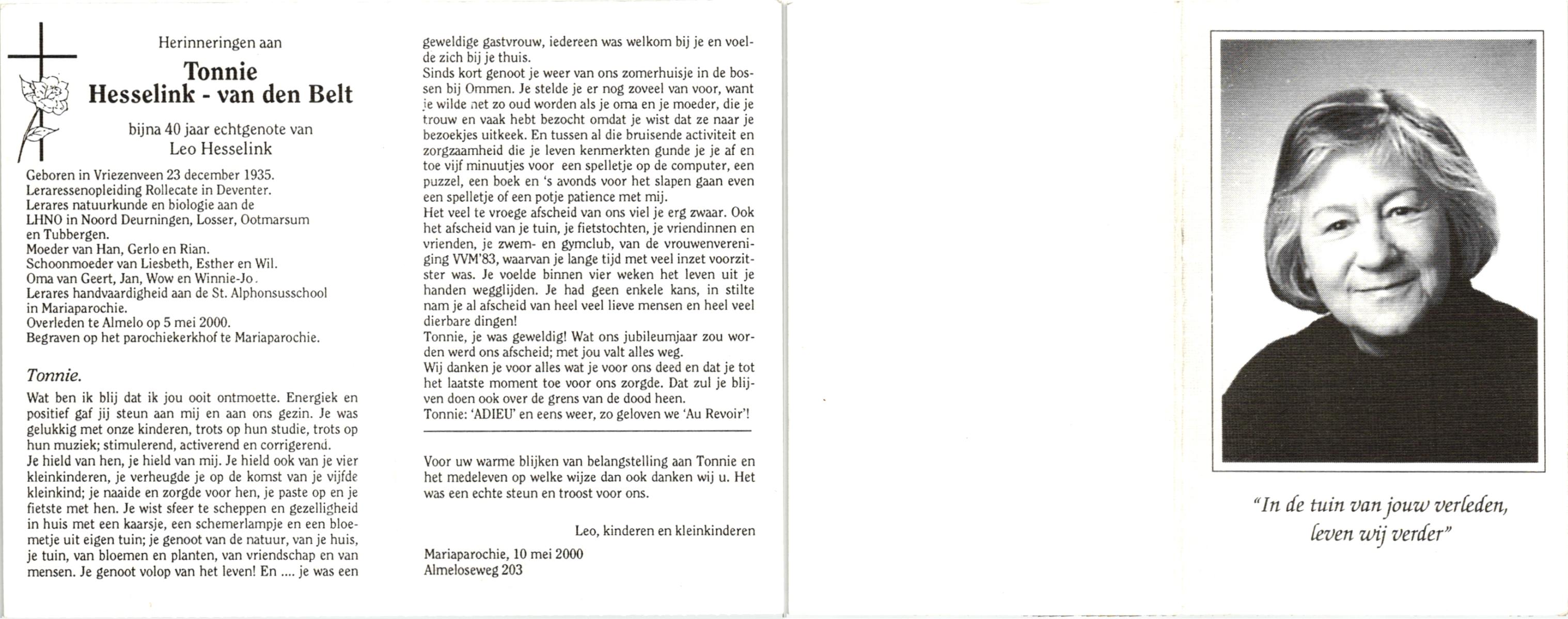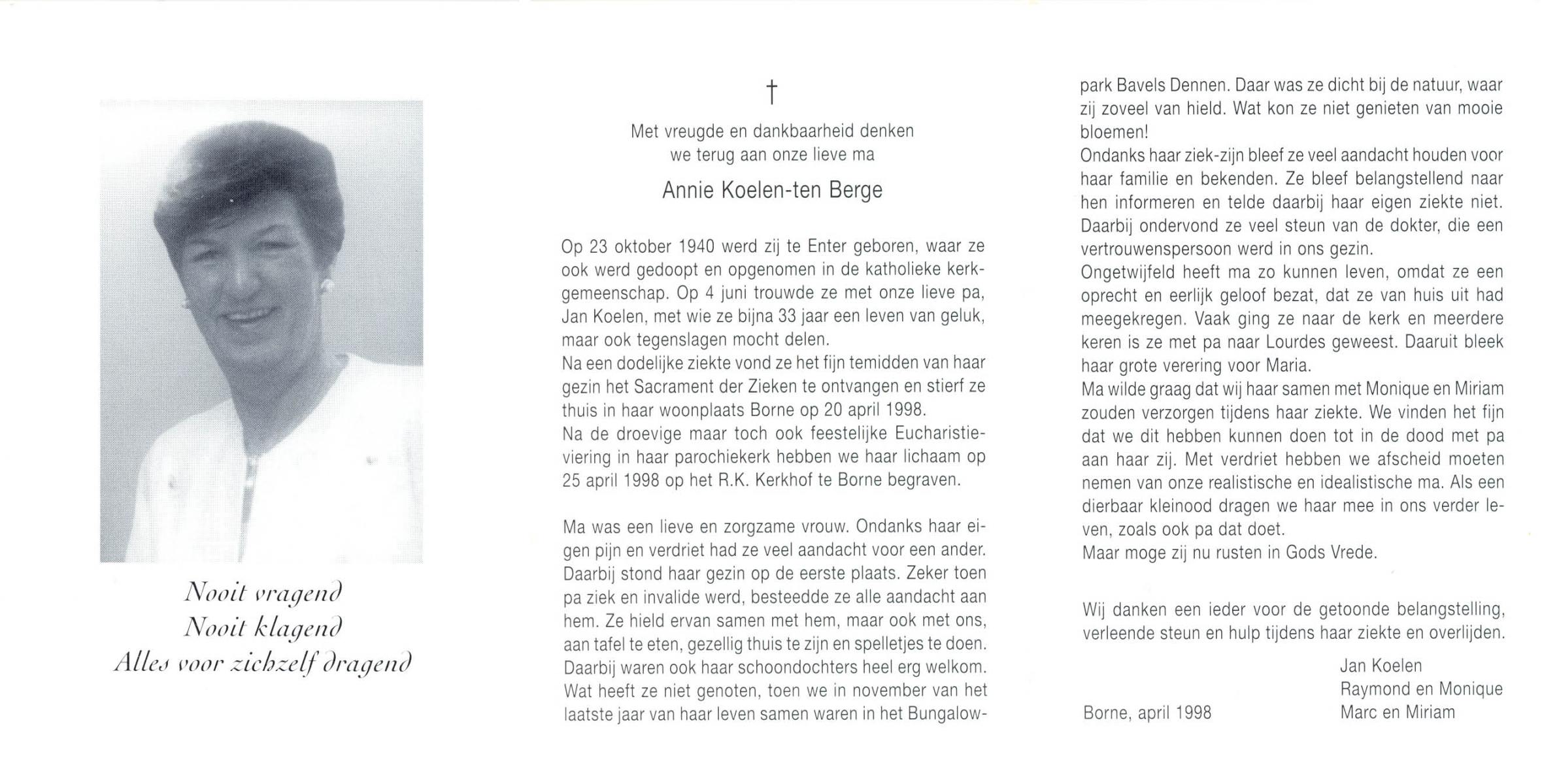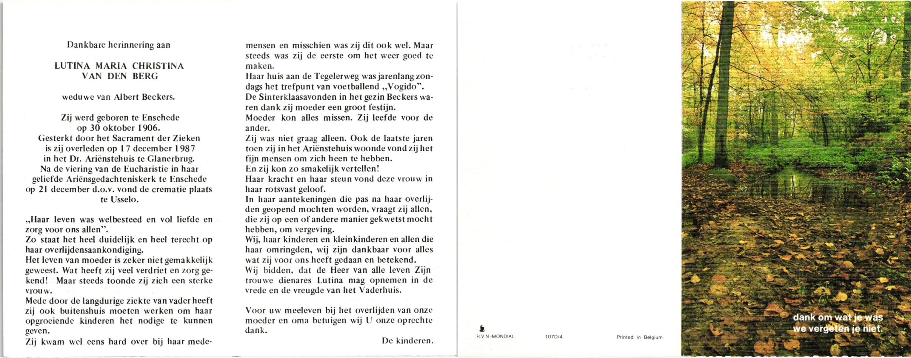 BEKKE, ter, Anna Ferdinande, geboren op 21-2-1915 te Bocholt (Dld), overleden op 17-3-1998 te Hengelo (Ov.) op 82-jarige leeftijd, gecremeerd op 21-3-1998 te Usselo.