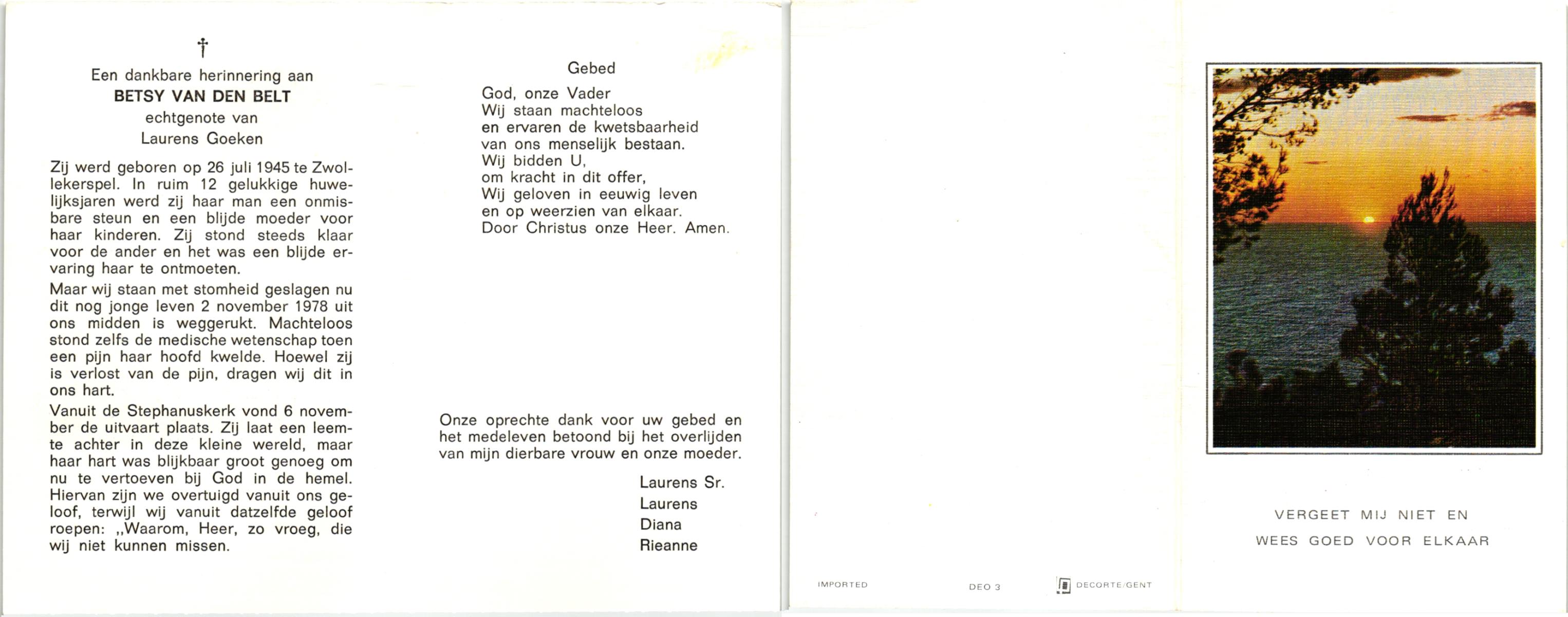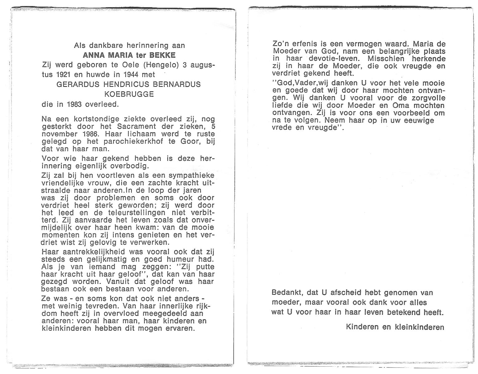 BEKKE, ter, Anna Maria, geboren op 3-8-1921 te Oele, overleden op 5-11-1986 te Goor op 65-jarige leeftijd.
