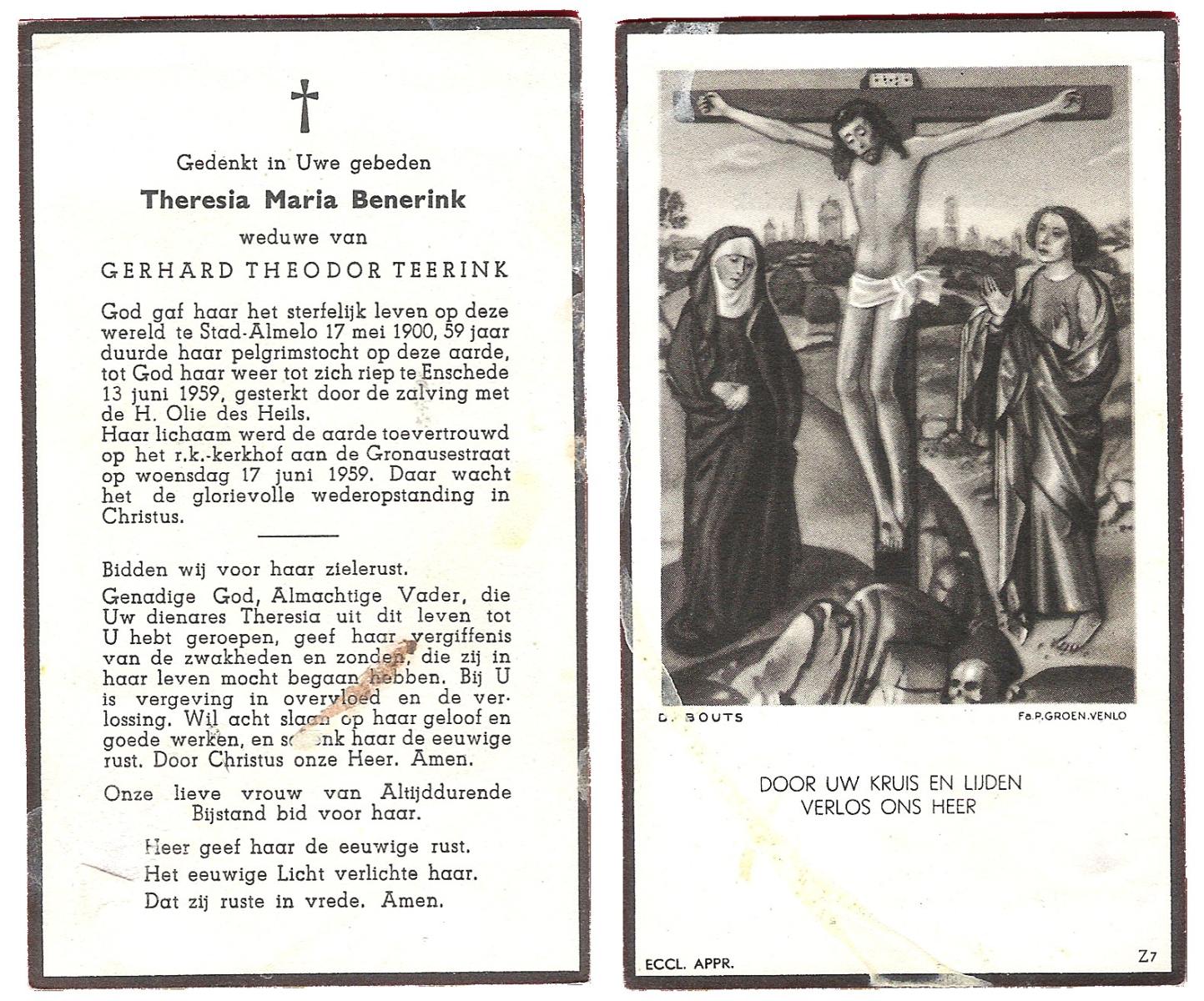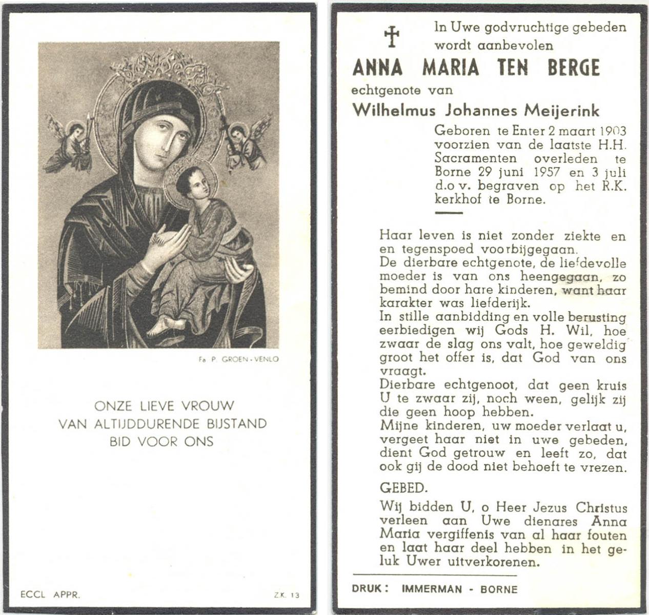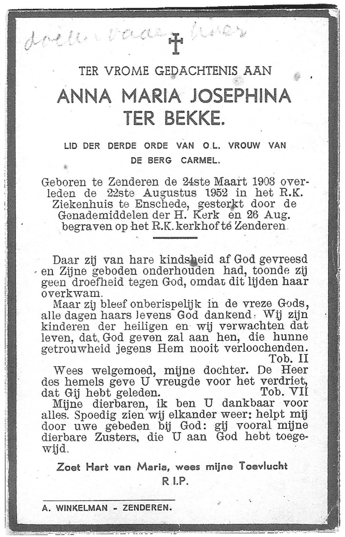 BEKKE, ter, Anna Maria Josephina, geboren op 24-3-1903 te Zenderen, overleden op 22-8-1952 te Enschede op 49-jarige leeftijd, begraven op 26-8-1952 te Zenderen.