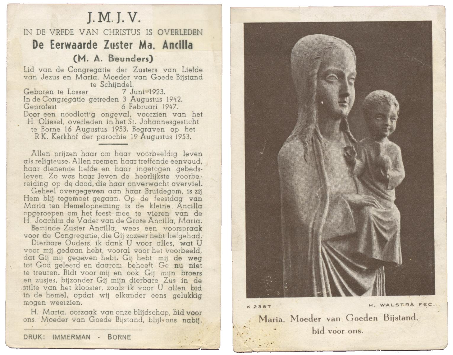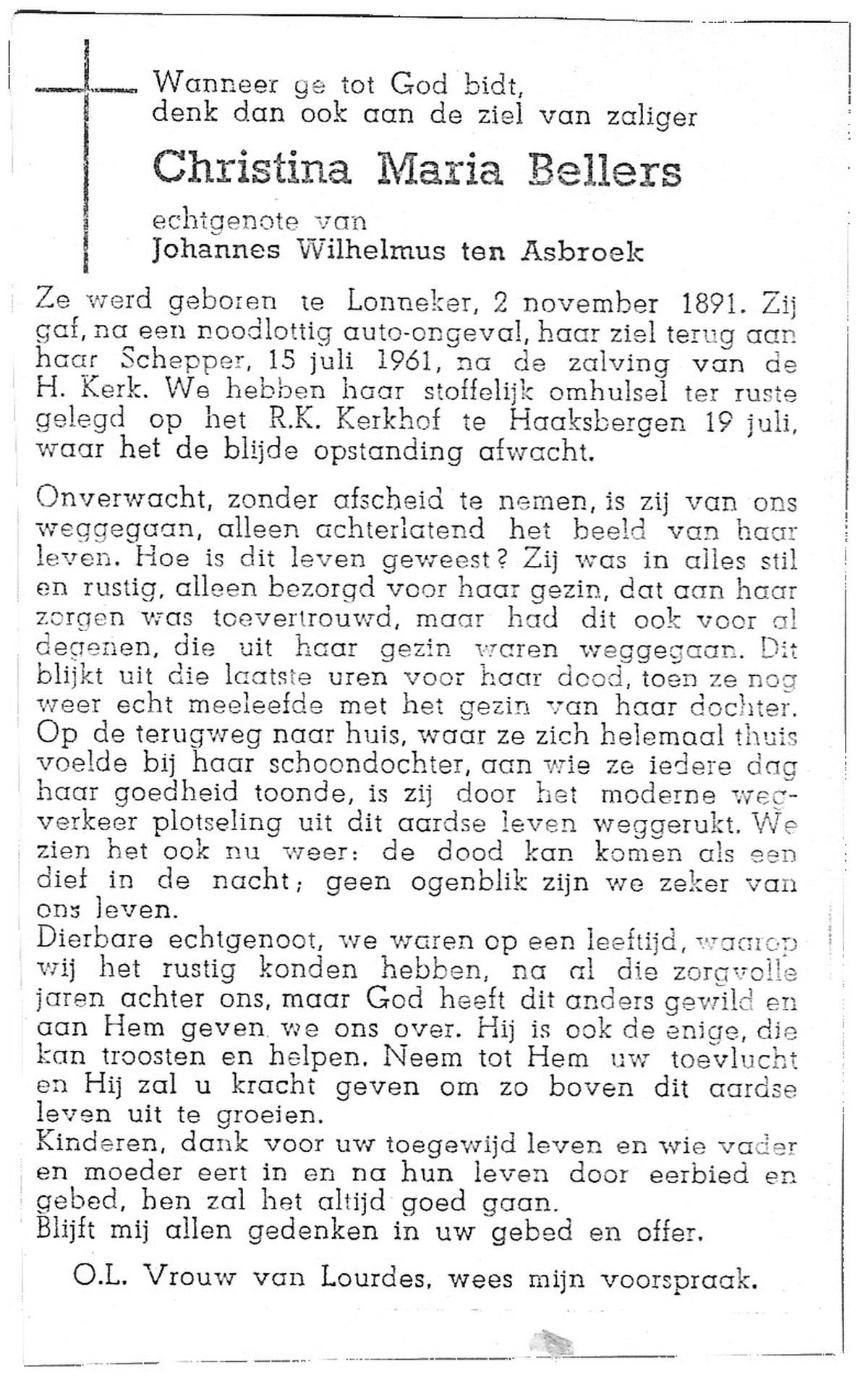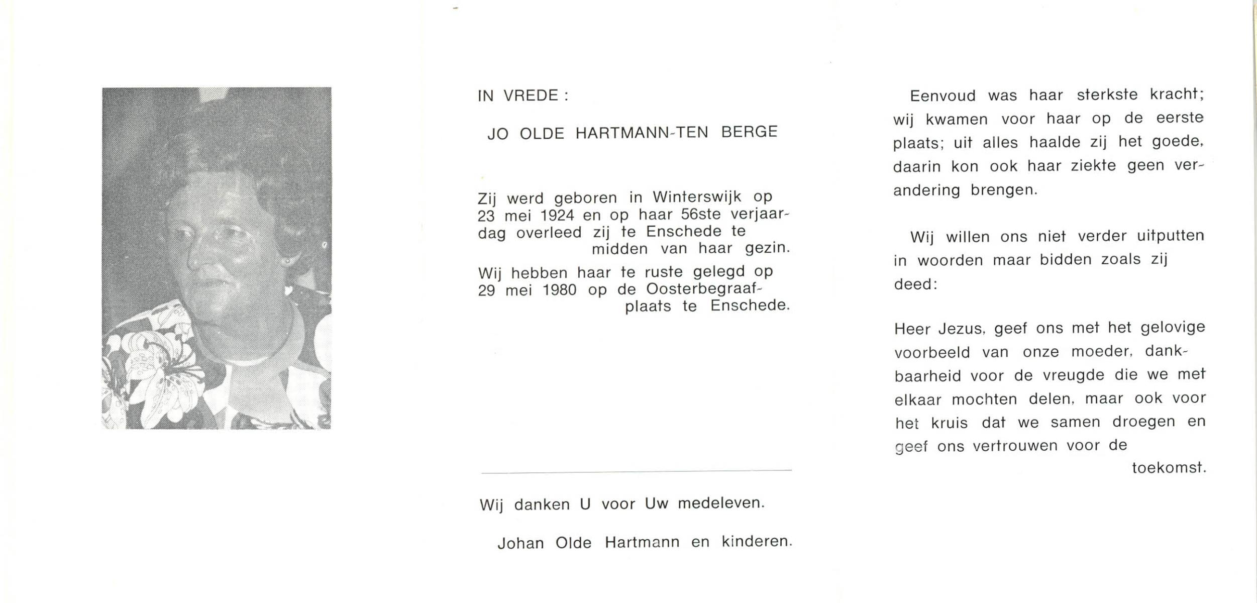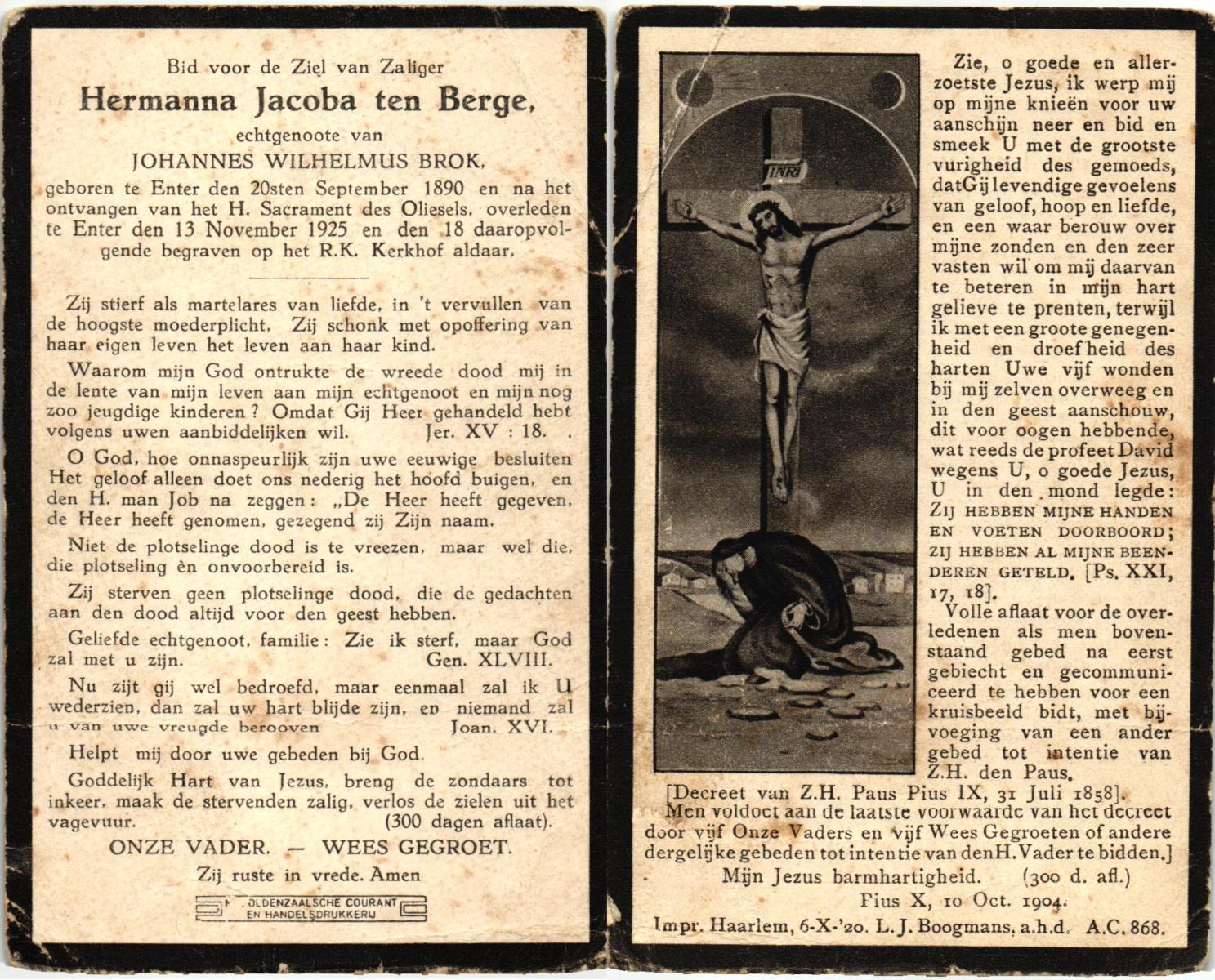 BEKKE, ter, Anna Maria Josephina, geboren op 24-3-1903 te Zenderen, overleden op 22-8-1952 te Enschede op 49-jarige leeftijd, begraven op 26-8-1952 te Zenderen.
