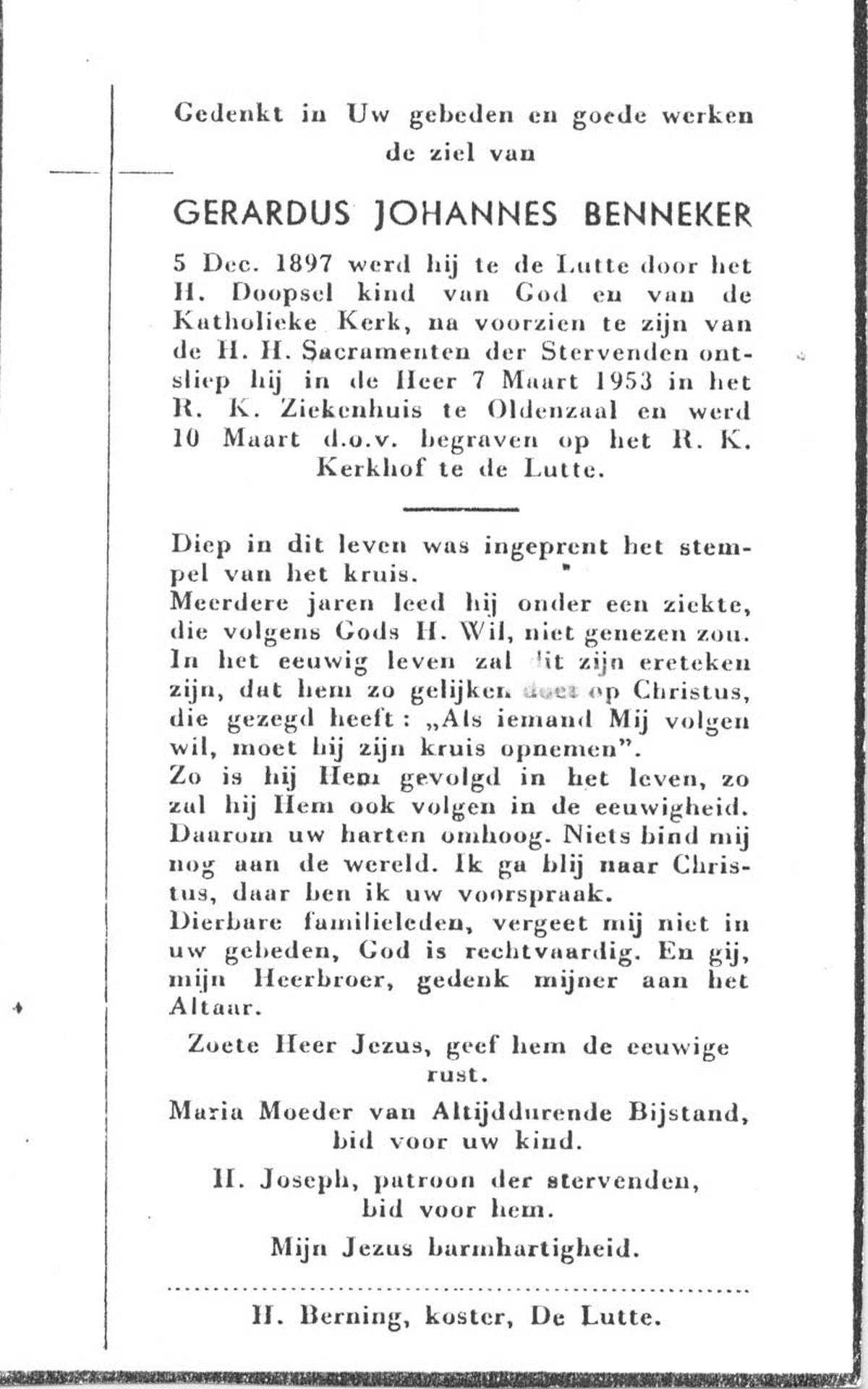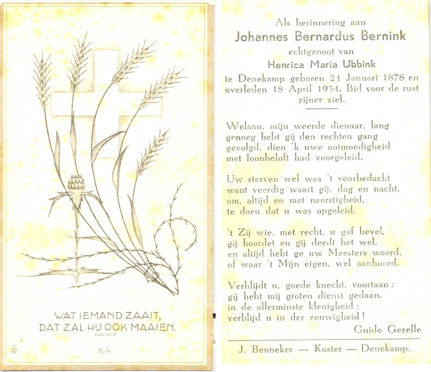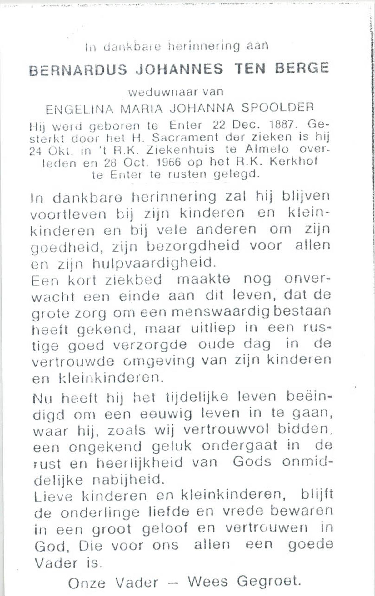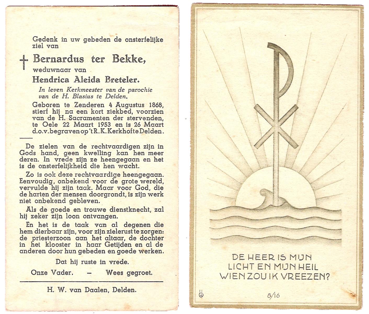 BEKKE, ter, Bernardus, geboren op 04-08-1868 te Zenderen, overleden op 22-3-1953 te Oele op 84-jarige leeftijd, begraven op 26-3-1953 te Delden.