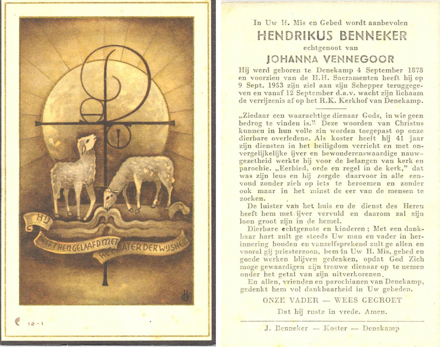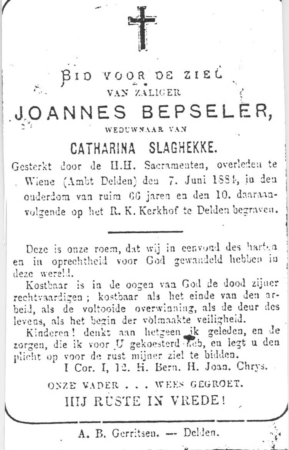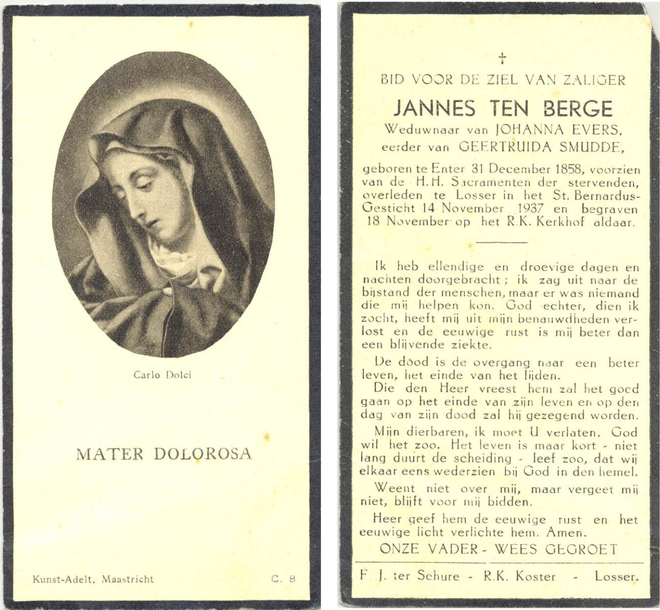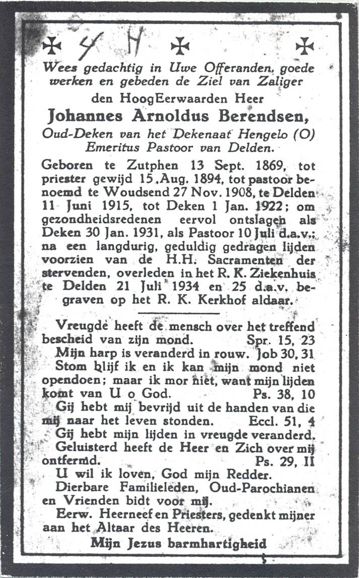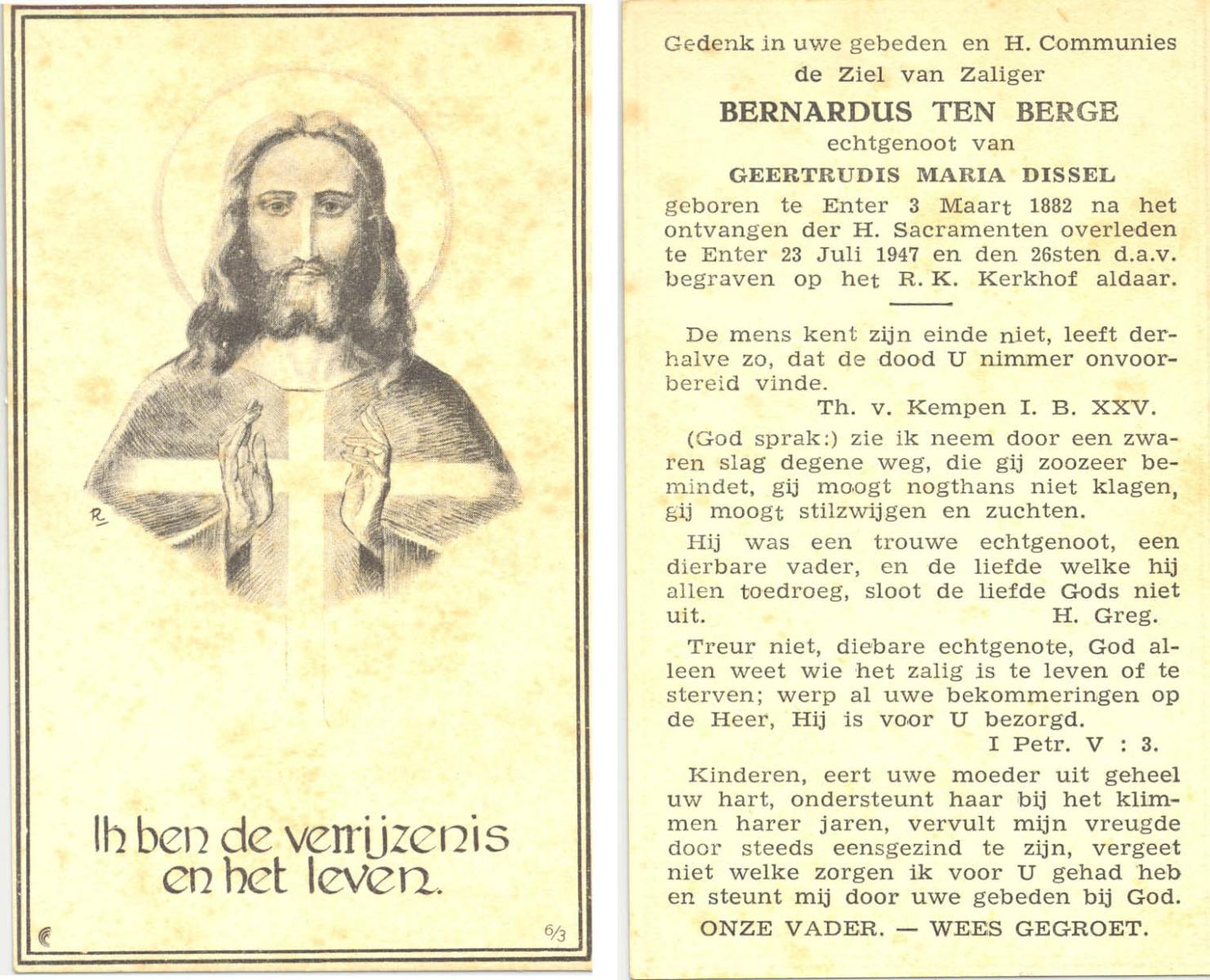 BEKKE, ter, Bernardus, geboren op 04-08-1868 te Zenderen, overleden op 22-3-1953 te Oele op 84-jarige leeftijd, begraven op 26-3-1953 te Delden.