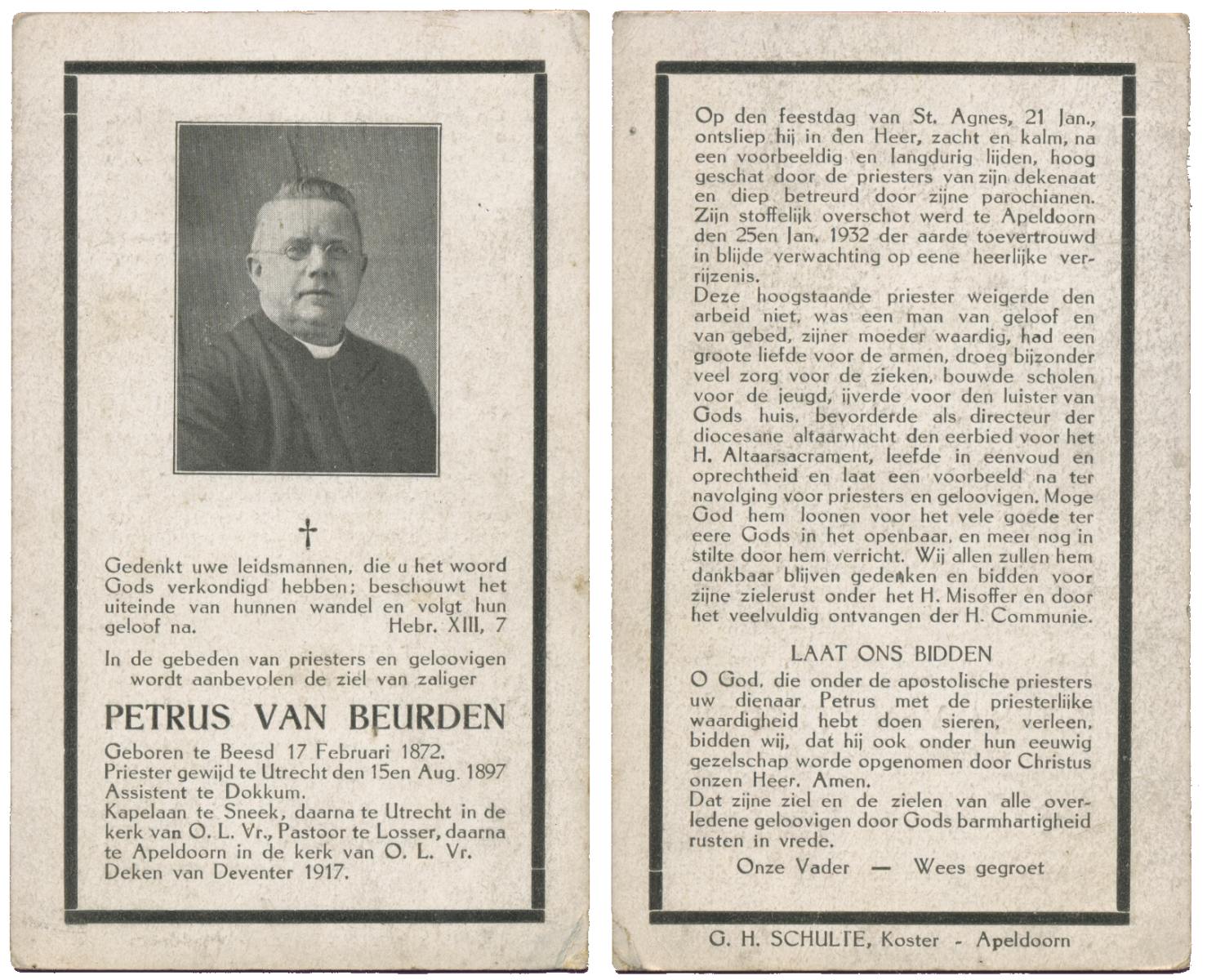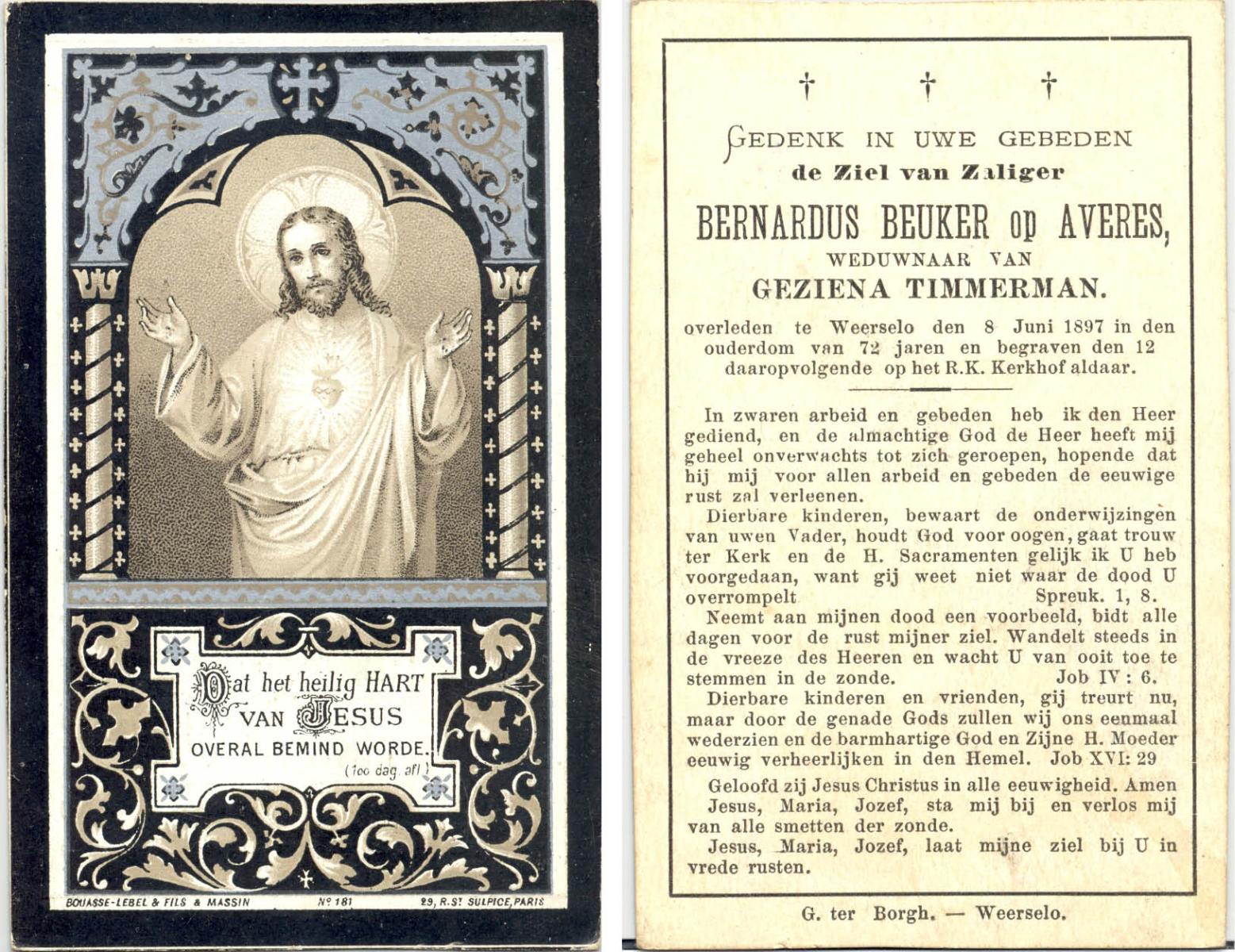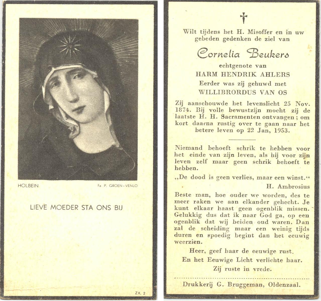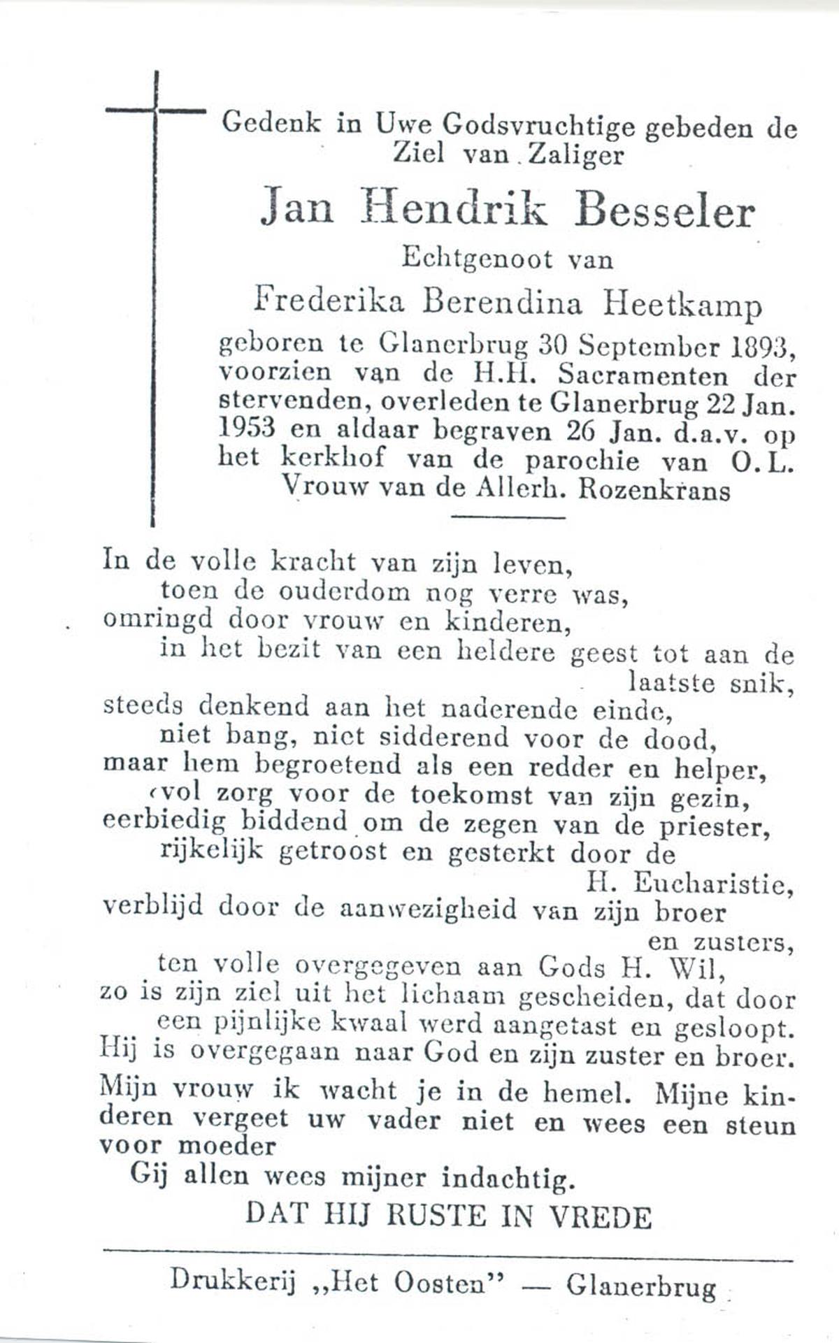 BEKKE, ter, Bernardus, geboren op 04-08-1868 te Zenderen, overleden op 22-3-1953 te Oele op 84-jarige leeftijd, begraven op 26-3-1953 te Delden.