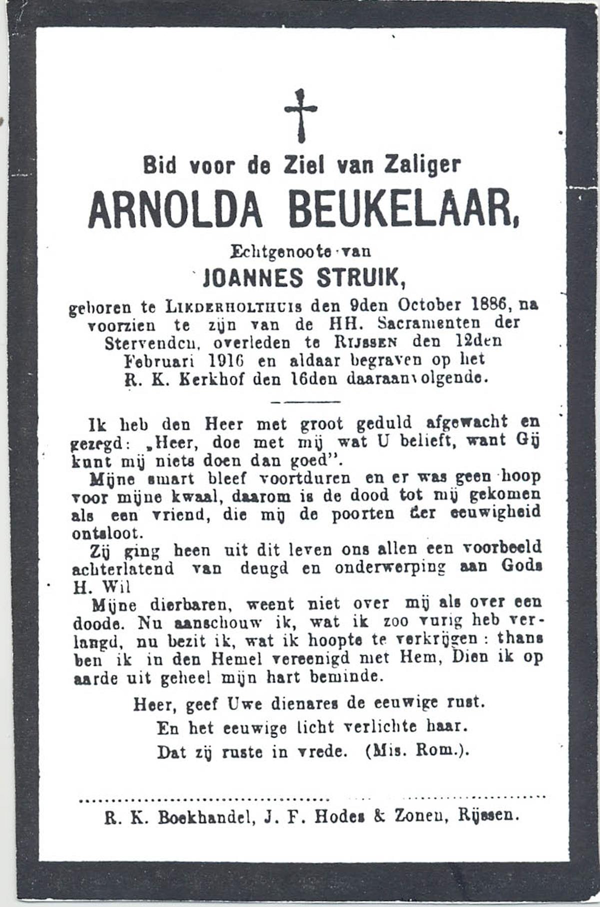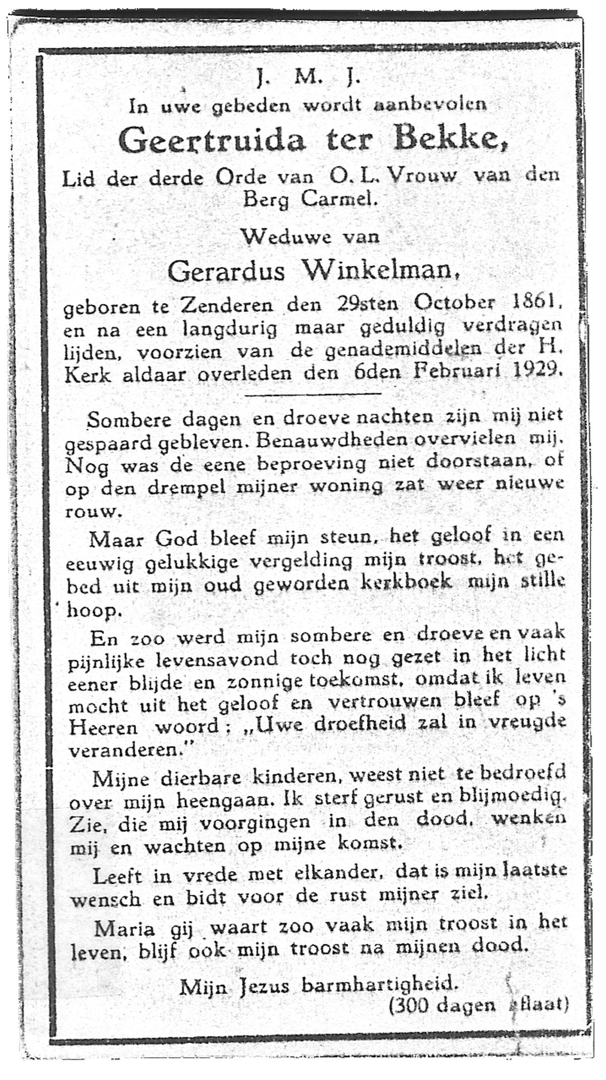 BEKKE, ter, Geertruida, geboren op 29-10-1861 te Zenderen, overleden op 6-2-1929 te Zenderen op 67-jarige leeftijd.