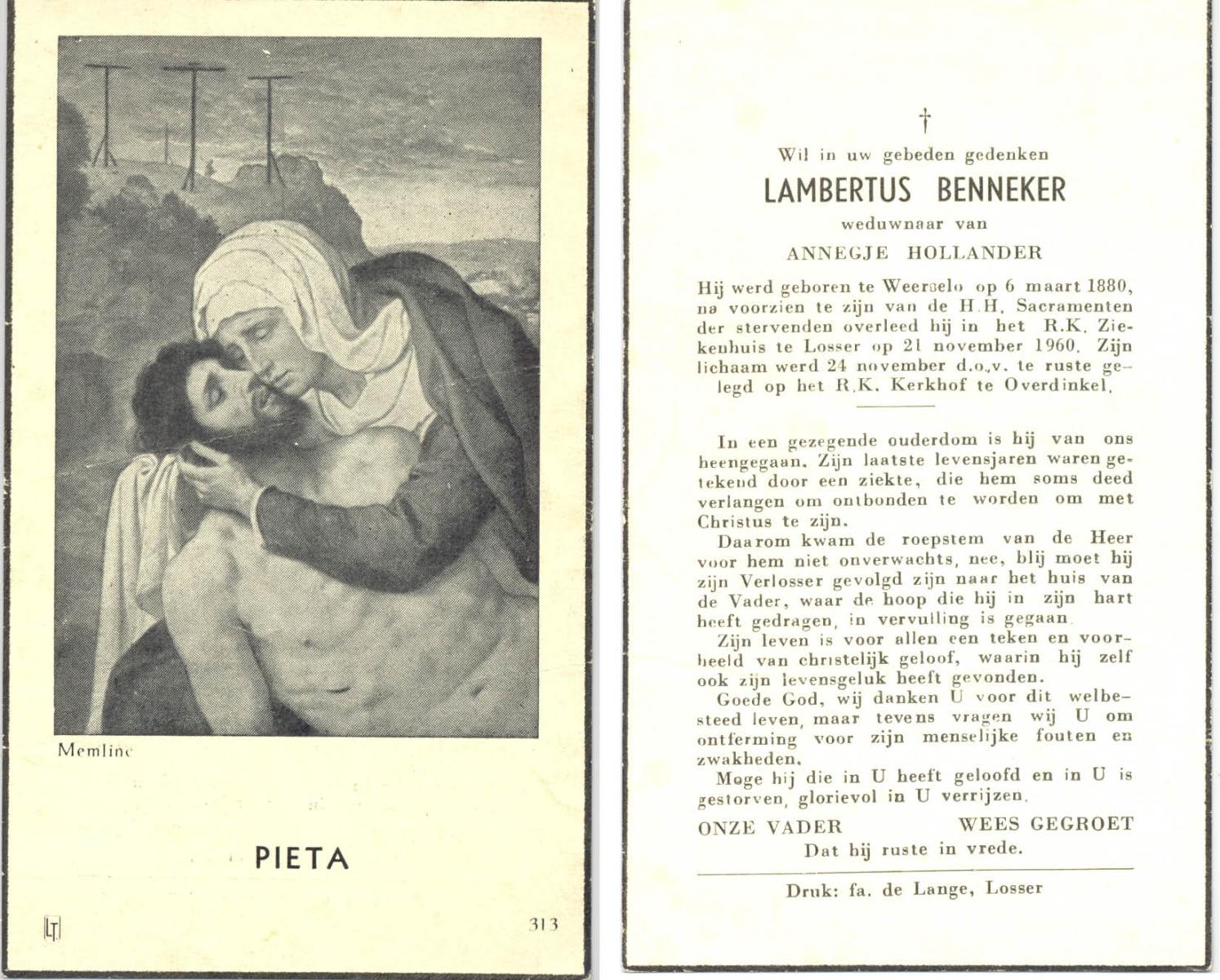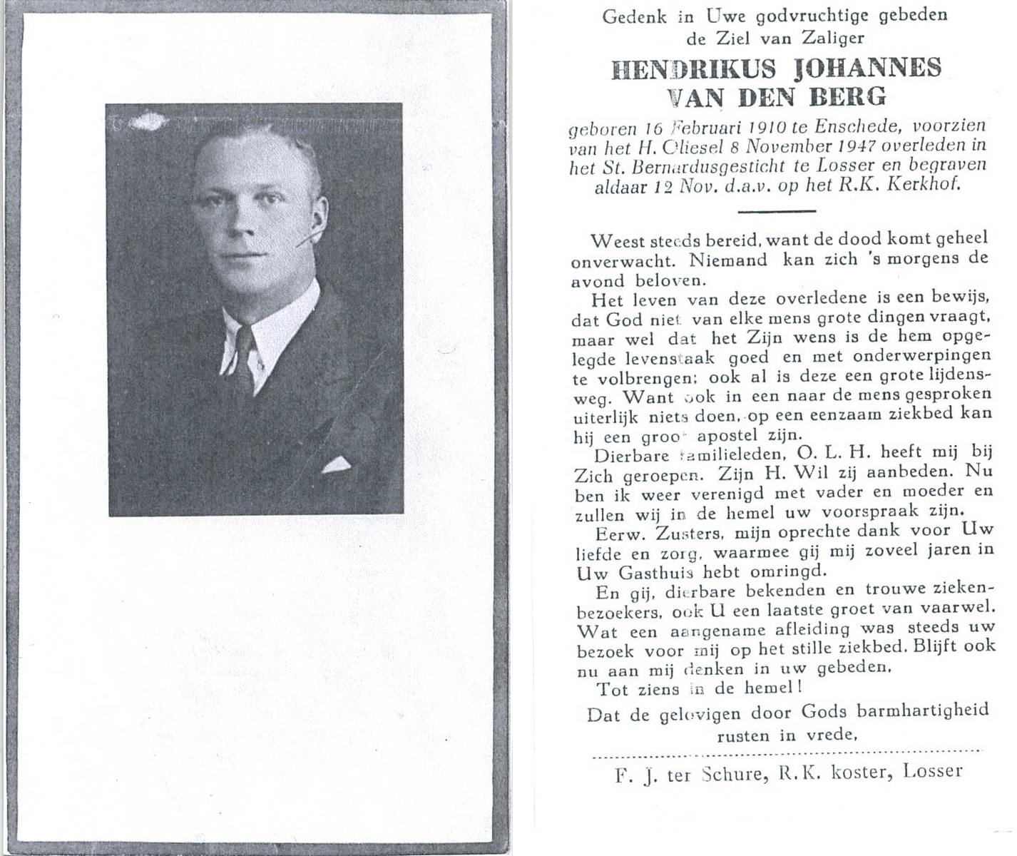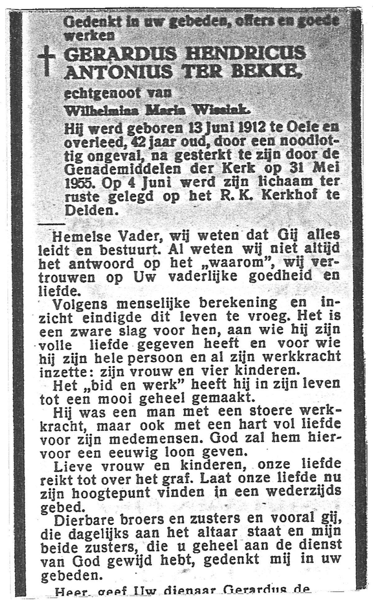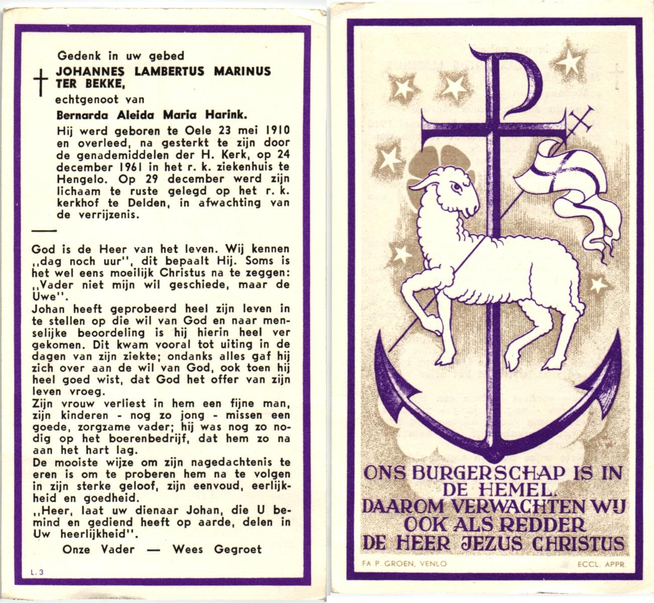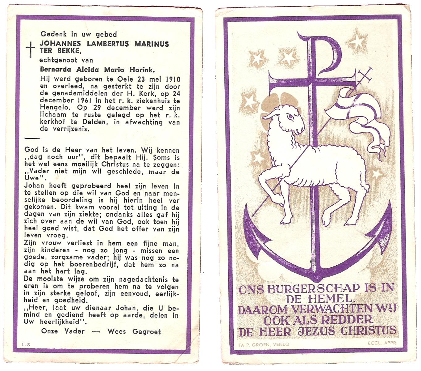 BEKKE, ter, Johannes Lambertus Marinus, geboren op 23-5-1910 te Oele, overleden op 24-12-1961 te Hengelo, ziekenhuis op 51-jarige leeftijd, begraven op 29-12-1961 te Delden.