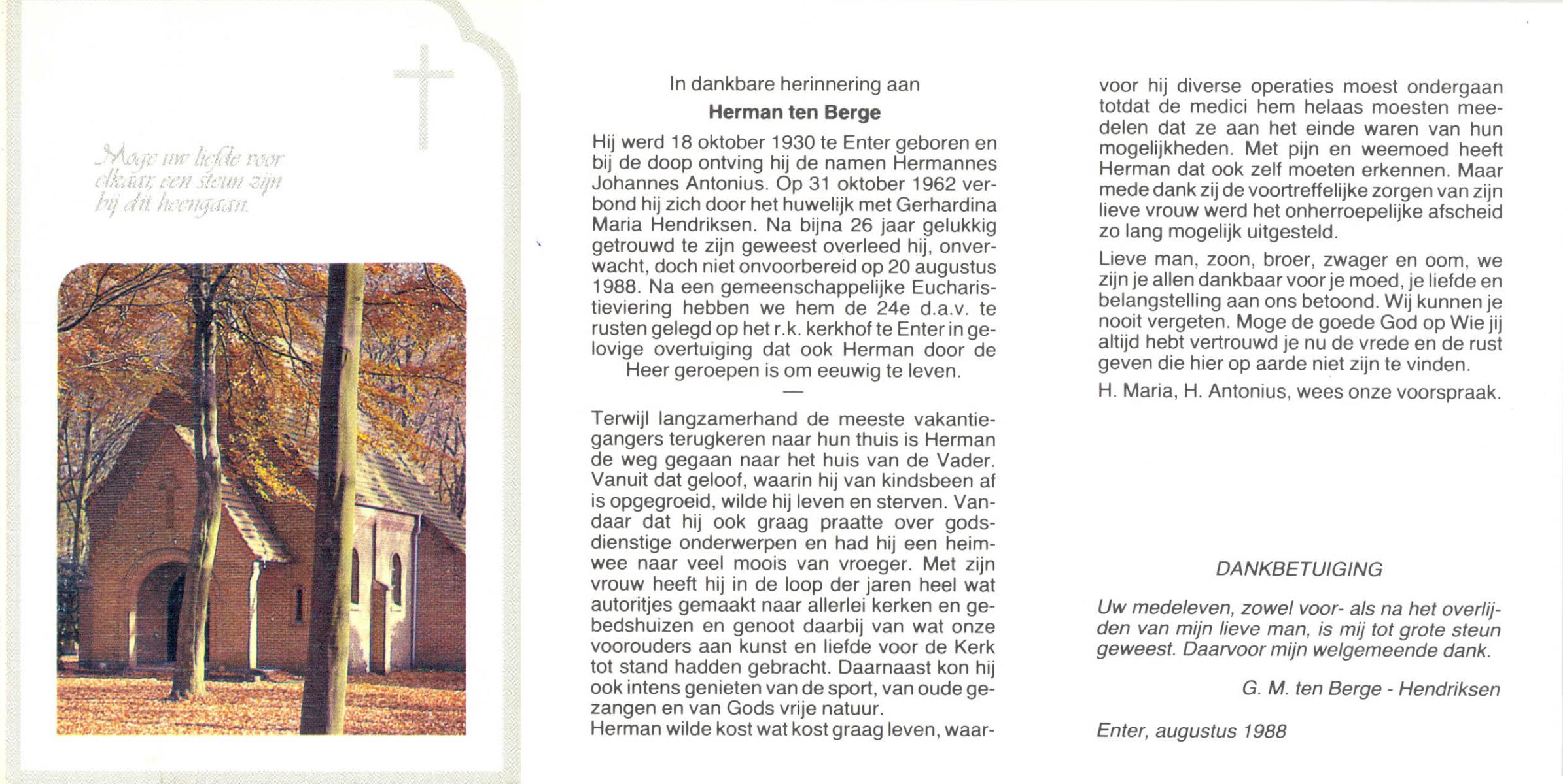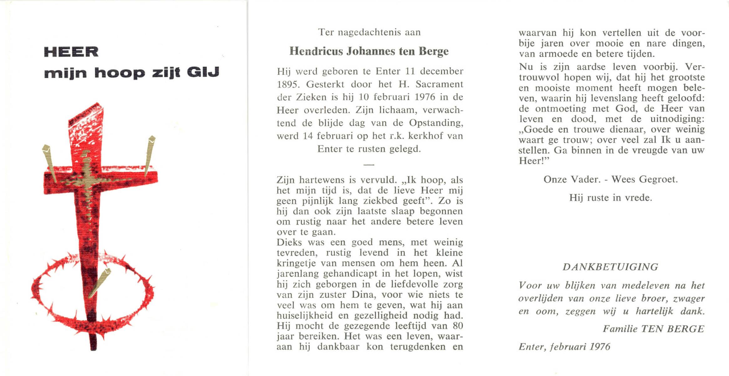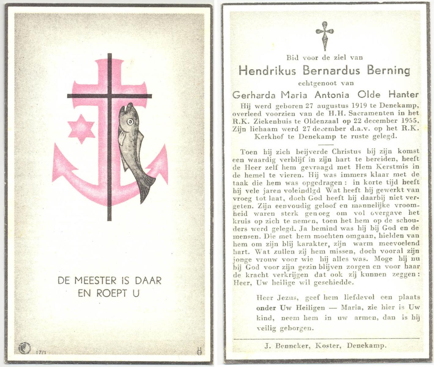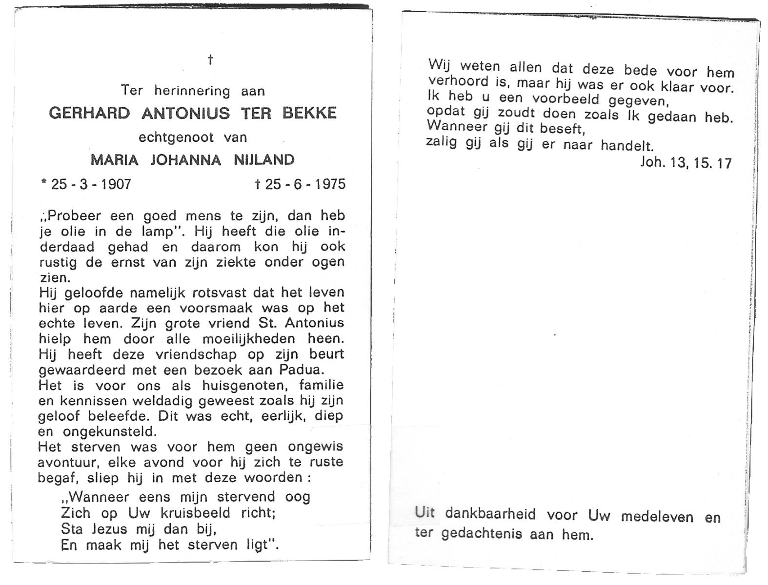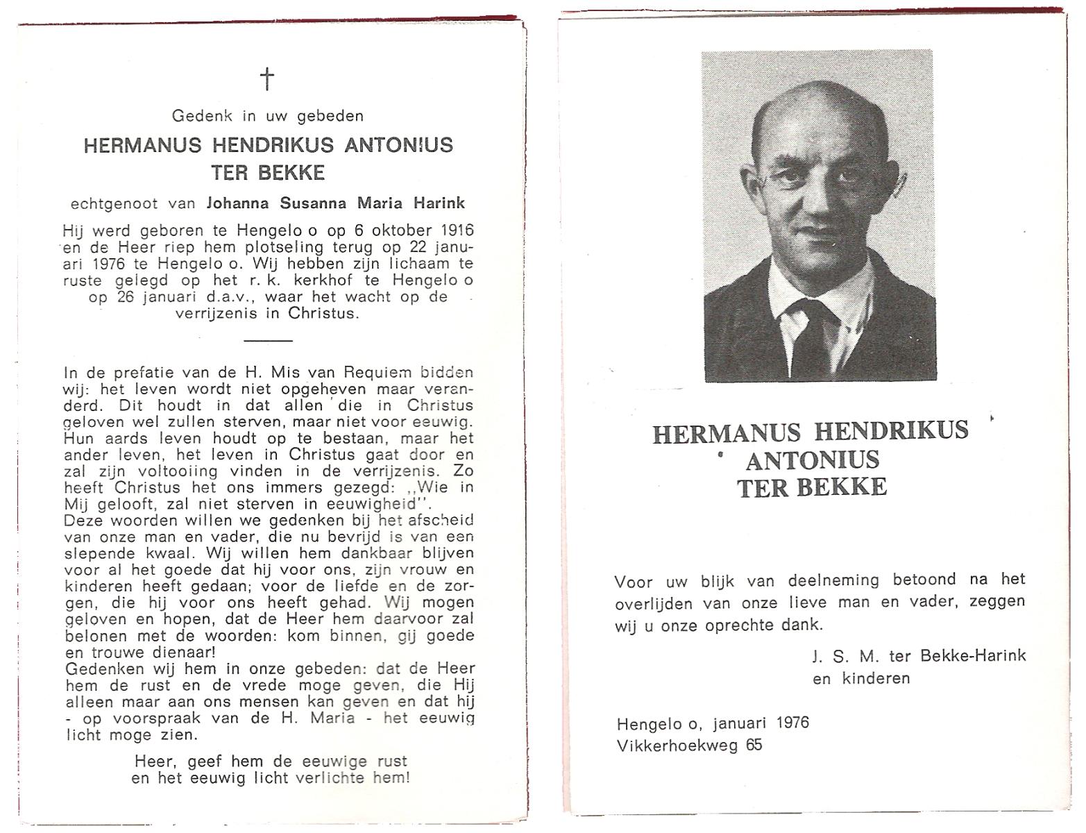 BEKKE, ter, Hermanus Hendrikus Antonius, geboren op 6-10-1916 te Hengelo (O), overleden op 22-1-1976 te Hengelo (Ov.) op 59-jarige leeftijd, begraven op 26-1-1976 te Hengelo (Ov.).