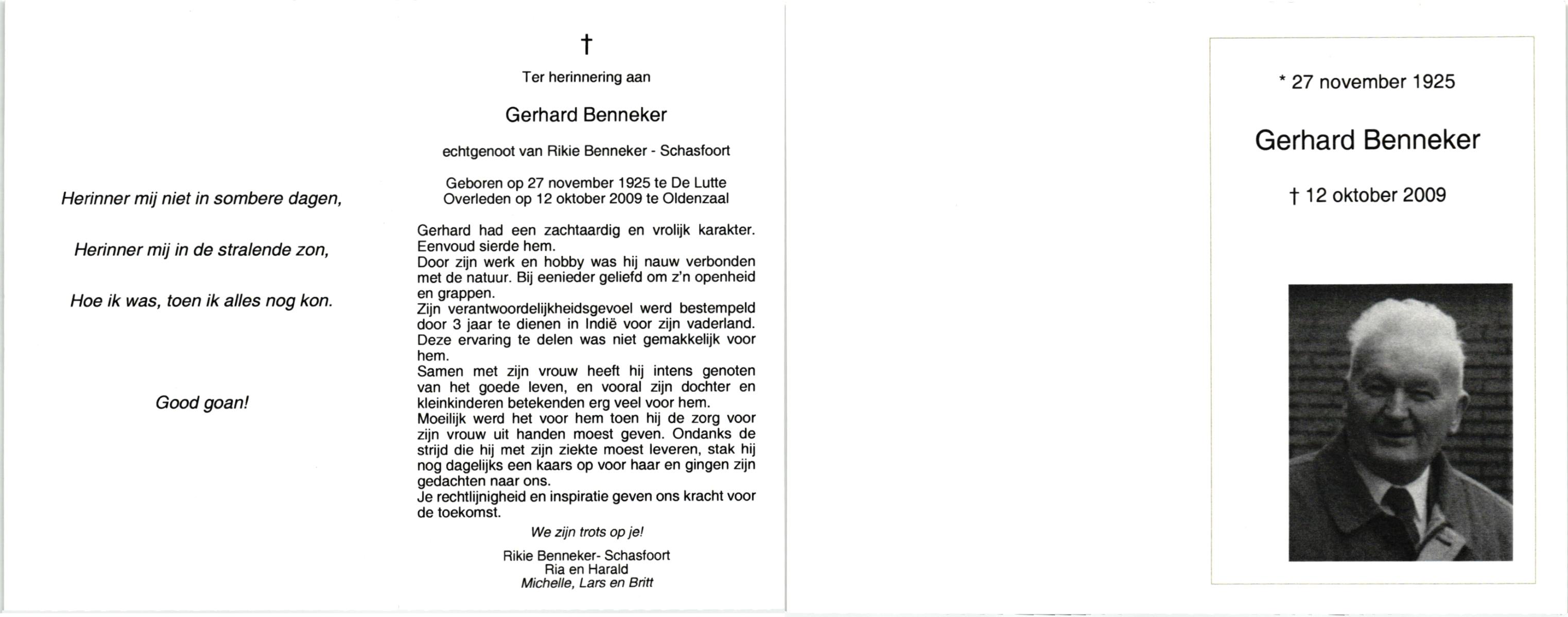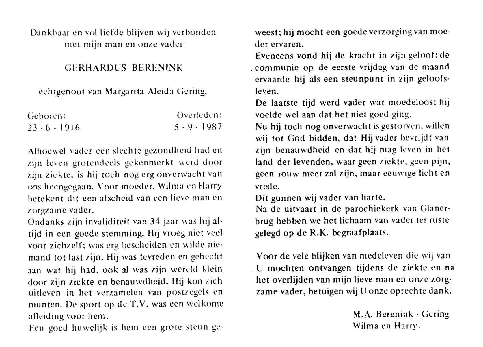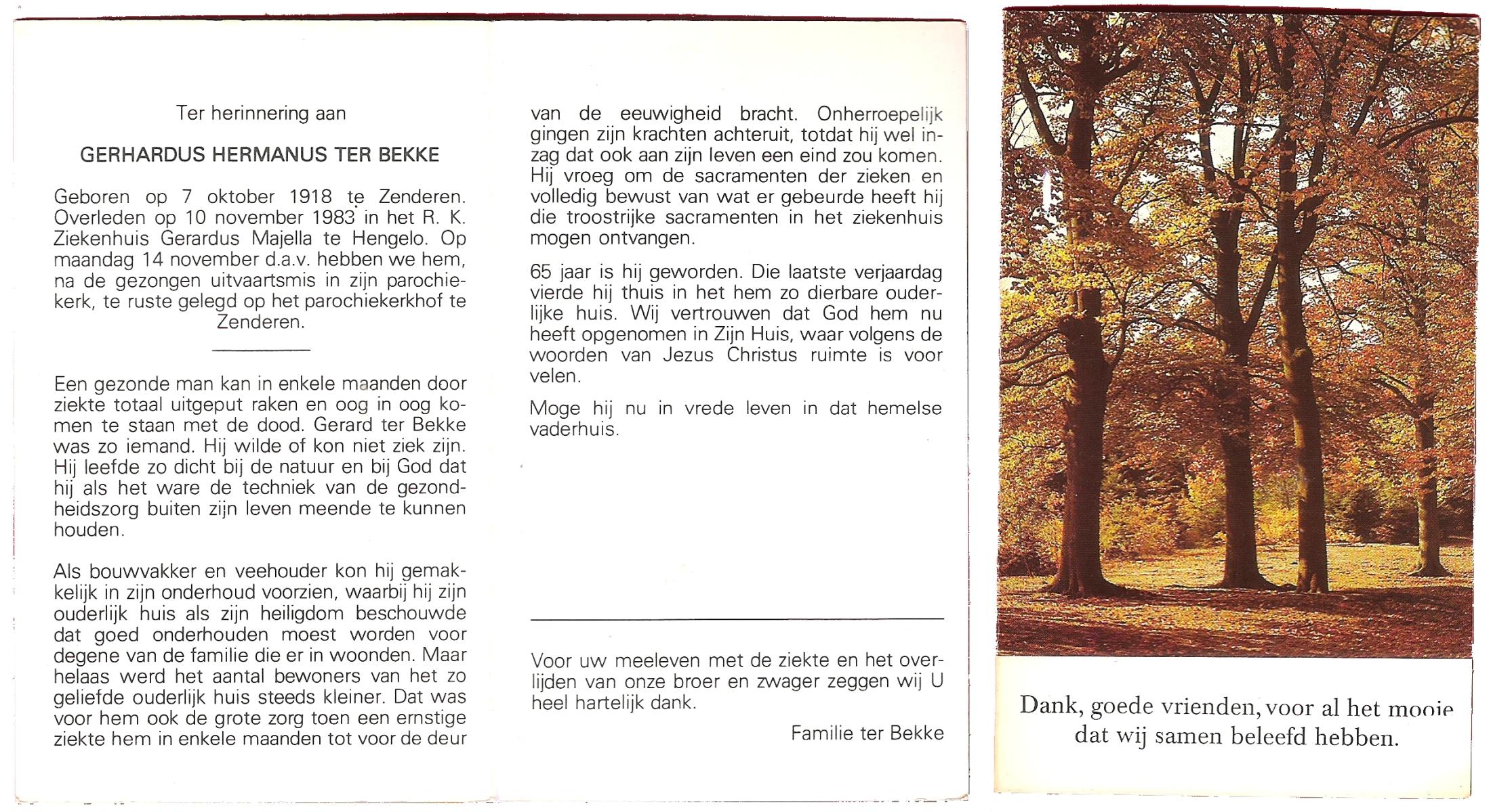 BEKKE, ter, Gerhardus Hermanus, geboren op 7-10-1918 te Zenderen, overleden op 10-11-1983 te Hengelo (Ov.) op 65-jarige leeftijd, begraven op 14-11-1983 te Zenderen.