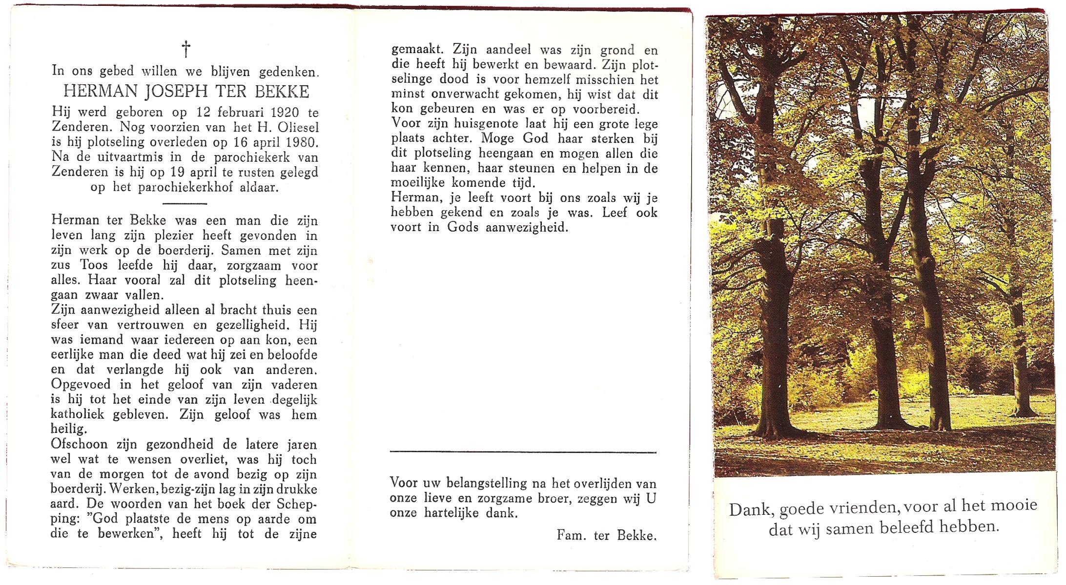 BEKKE, ter, Herman Joseph, geboren op 12-2-1920 te Zenderen, overleden op 16-4-1980 op 59-jarige leeftijd, begraven op 19-4-1980 te Zenderen.