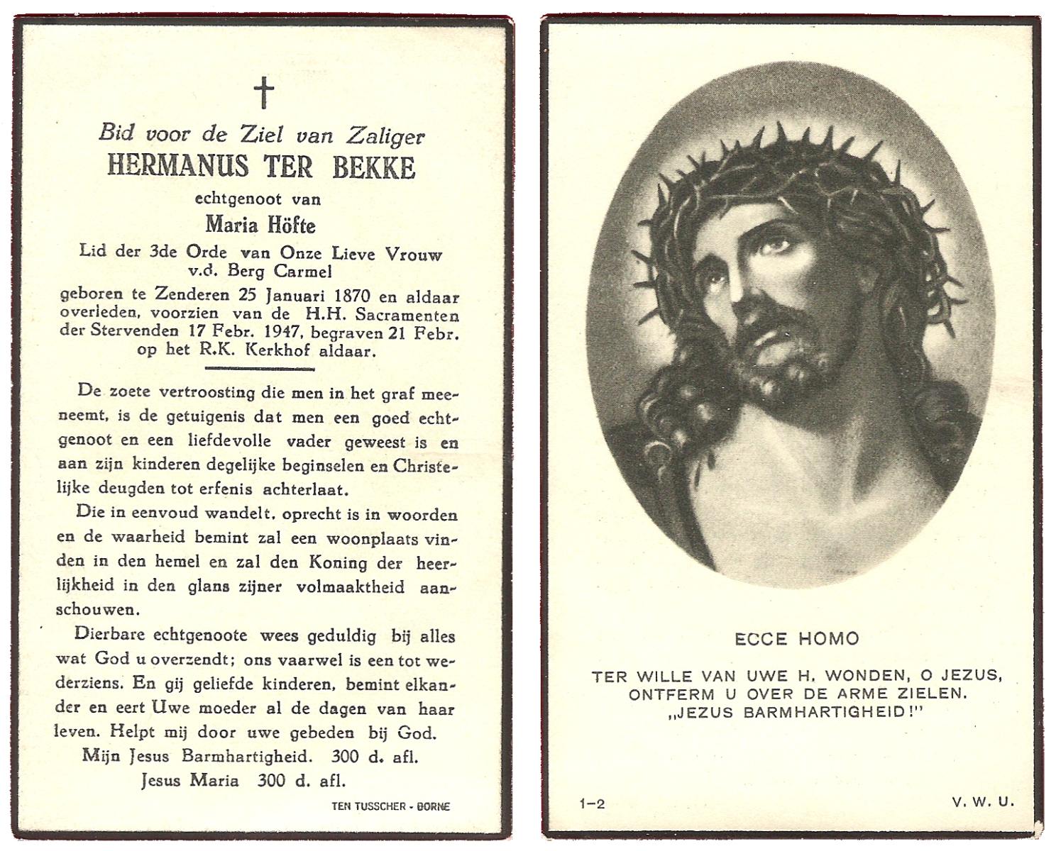 BEKKE, ter, Hermanus, geboren op 25-01-1870 te Zenderen, overleden op 17-2-1947 te Zenderen op 77-jarige leeftijd, begraven op 21-2-1947 te Zenderen.