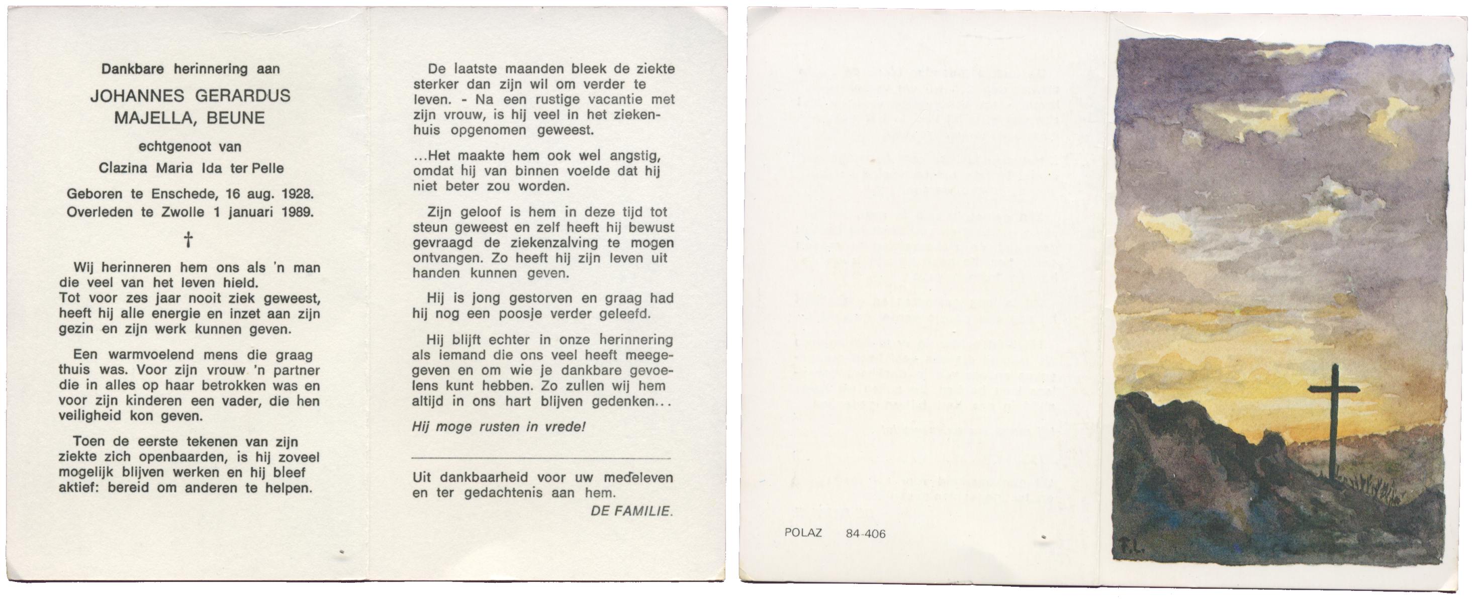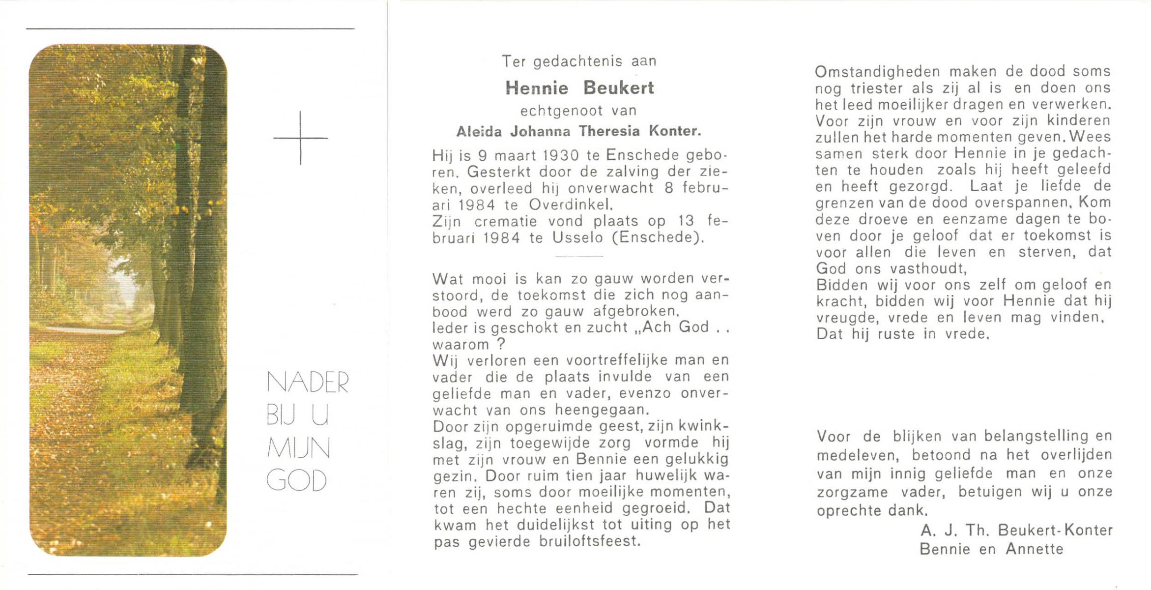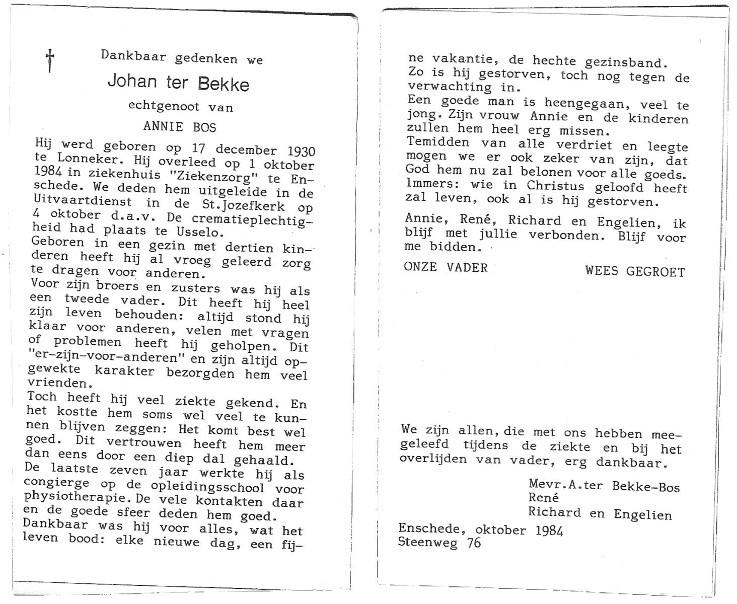 BEKKE, ter, Johan, geboren op 17-12-1930 te Lonneker, overleden op 1-10-1984 te Enschede op 53-jarige leeftijd, gecremeerd op 4-10-1984 te Usselo.