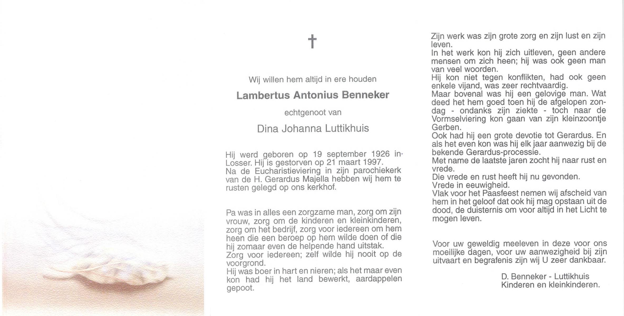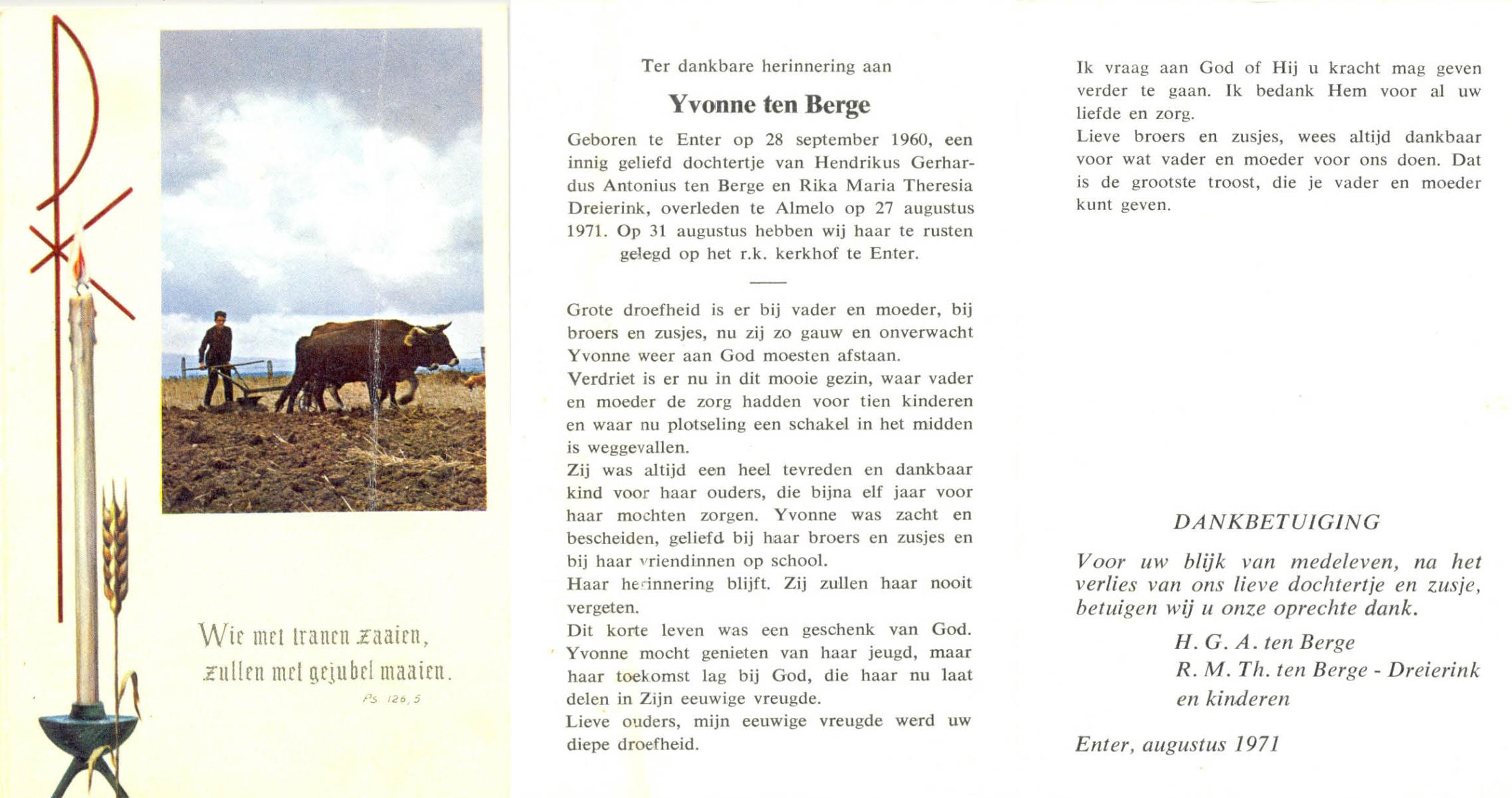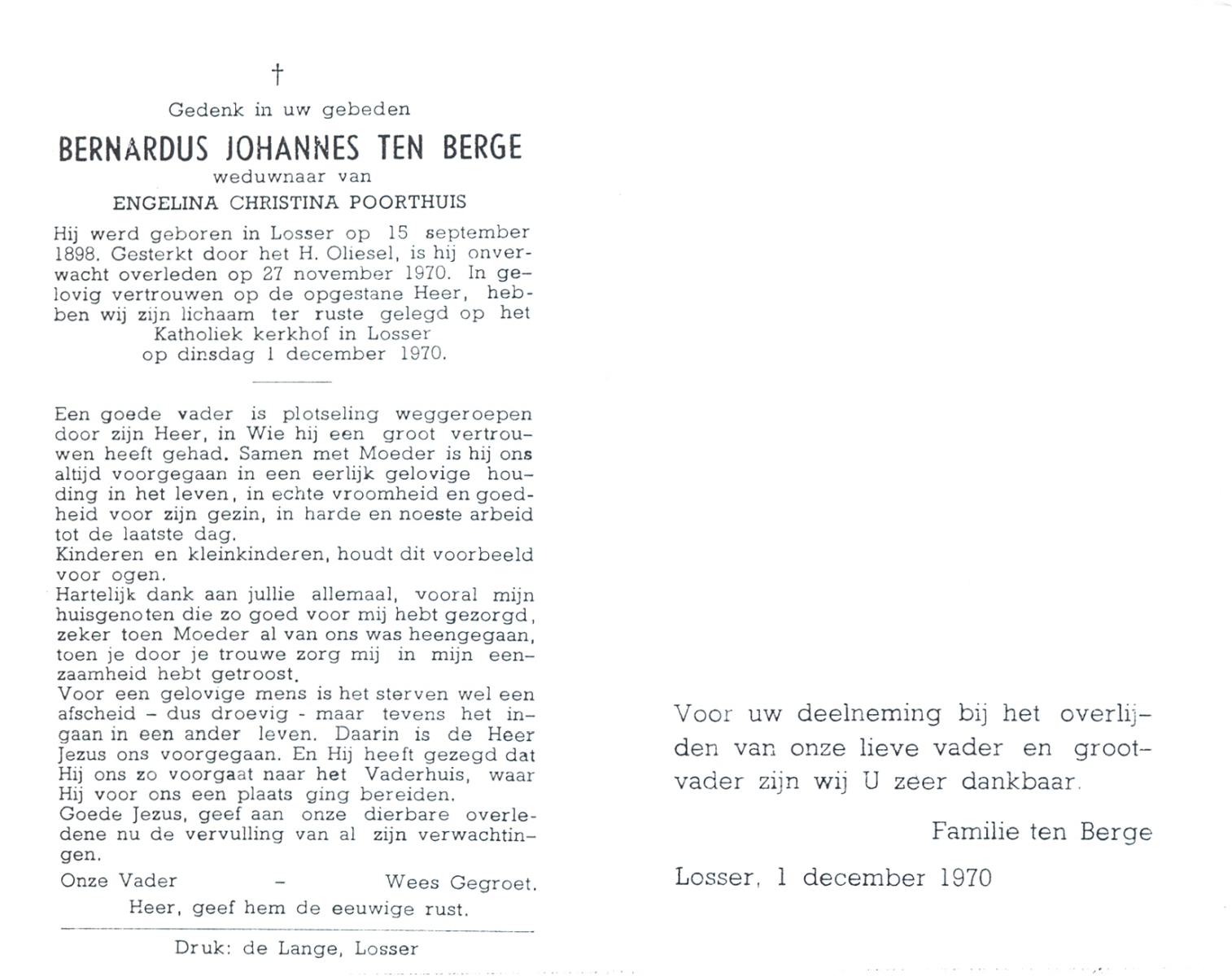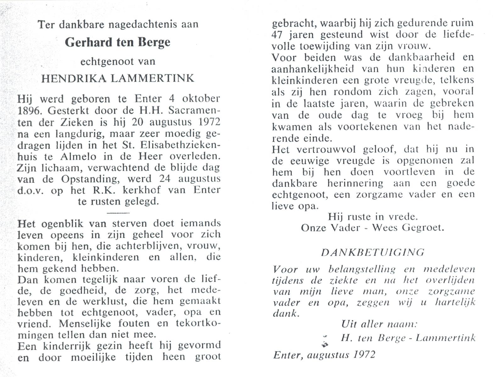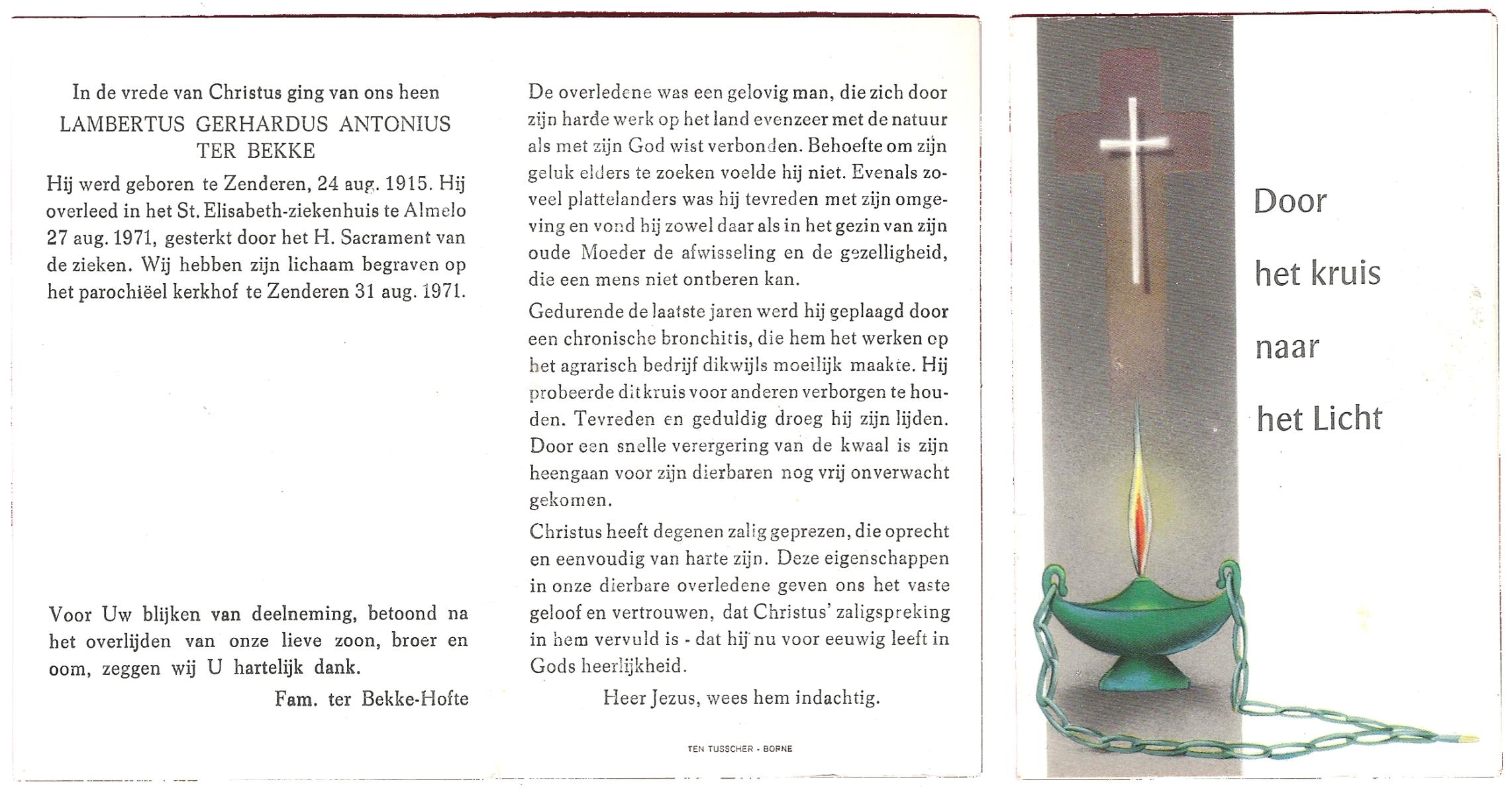 BEKKE, ter, Lambertus Gerhardus Antonius, geboren op 24-8-1915 te Zenderen, overleden op 27-8-1971 te Almelo op 56-jarige leeftijd, begraven op 31-8-1971 te Zenderen.
