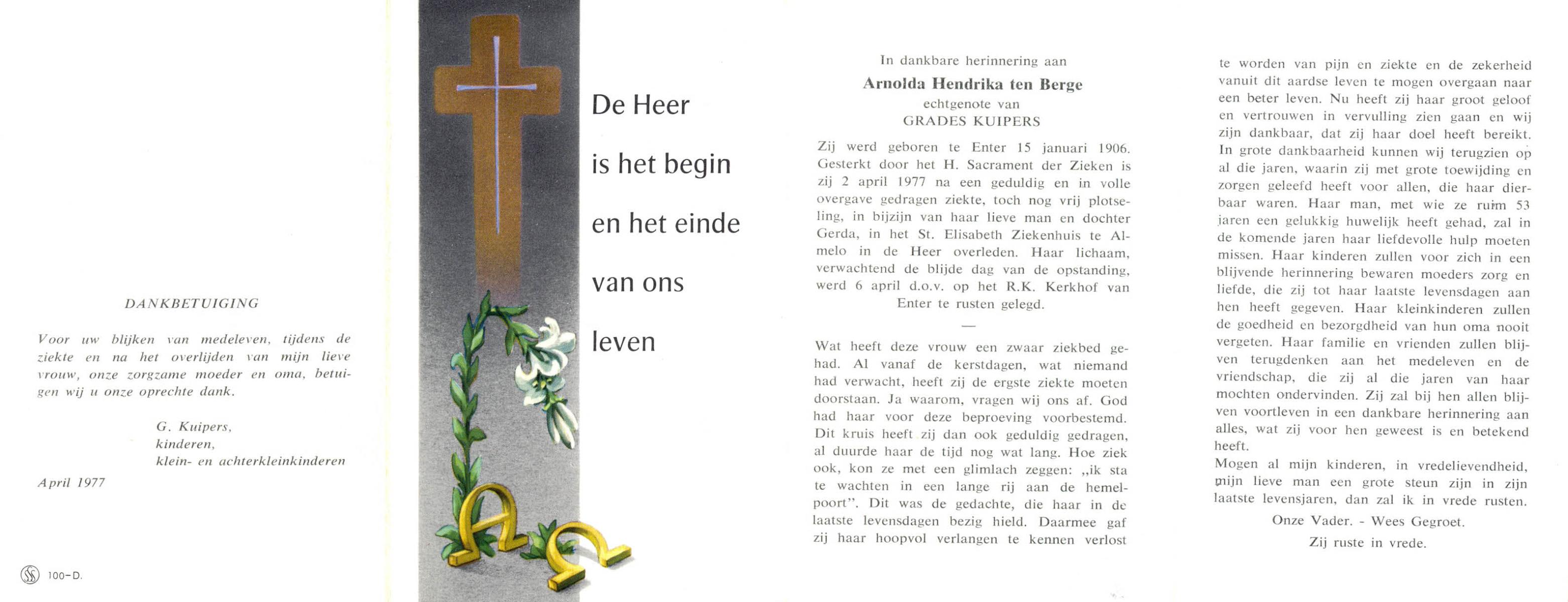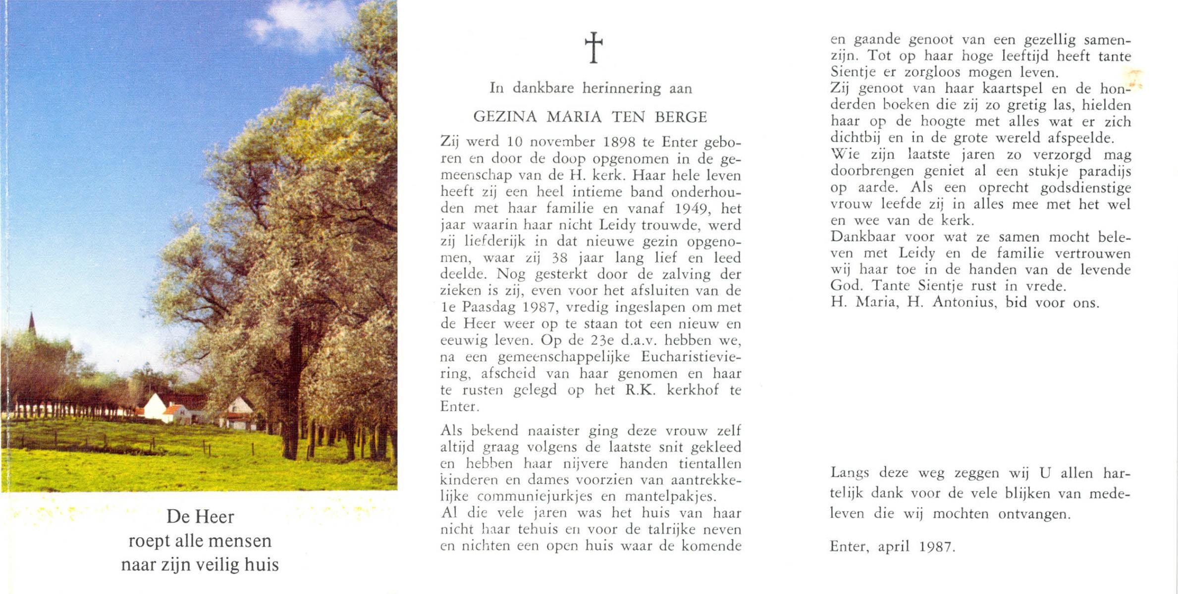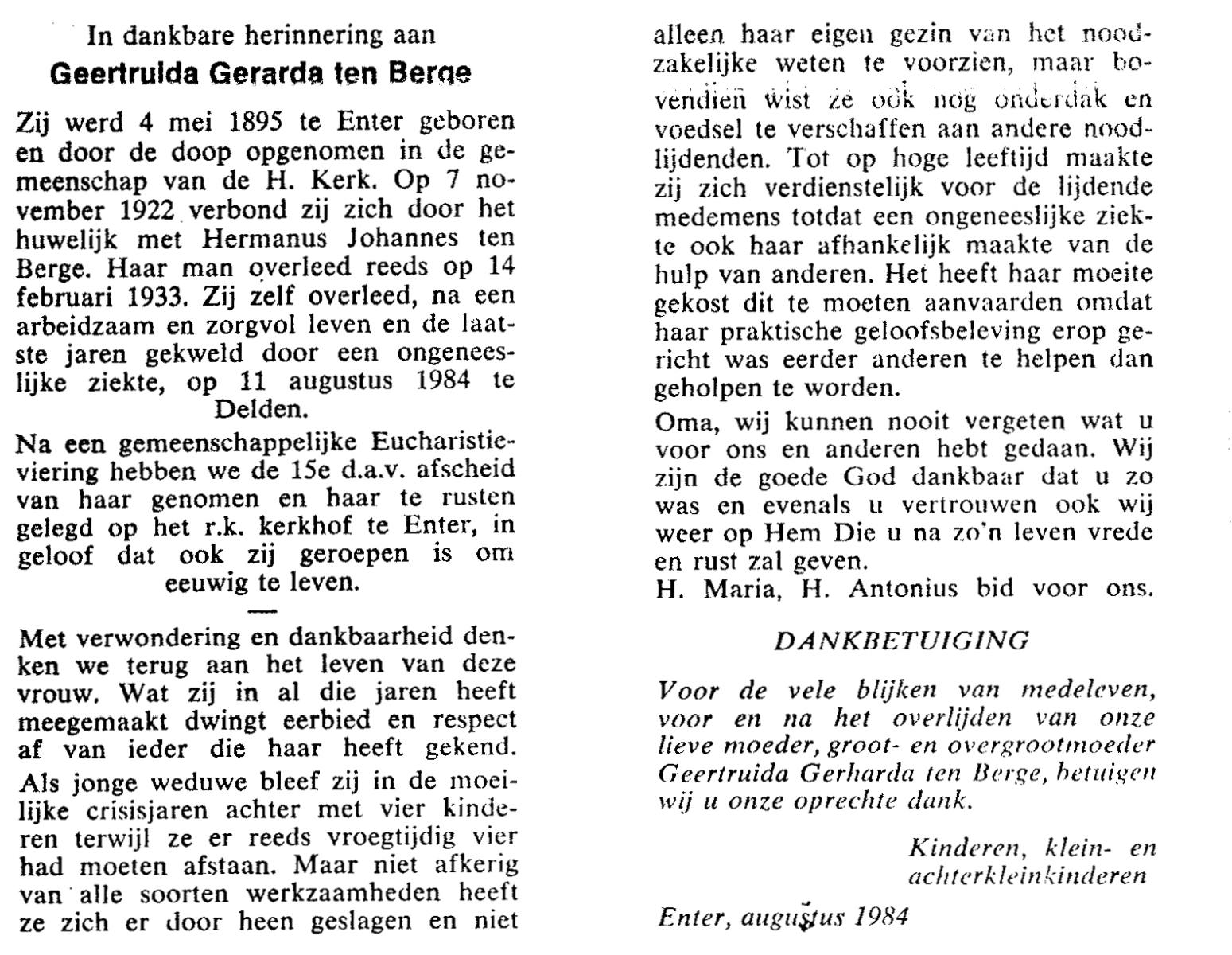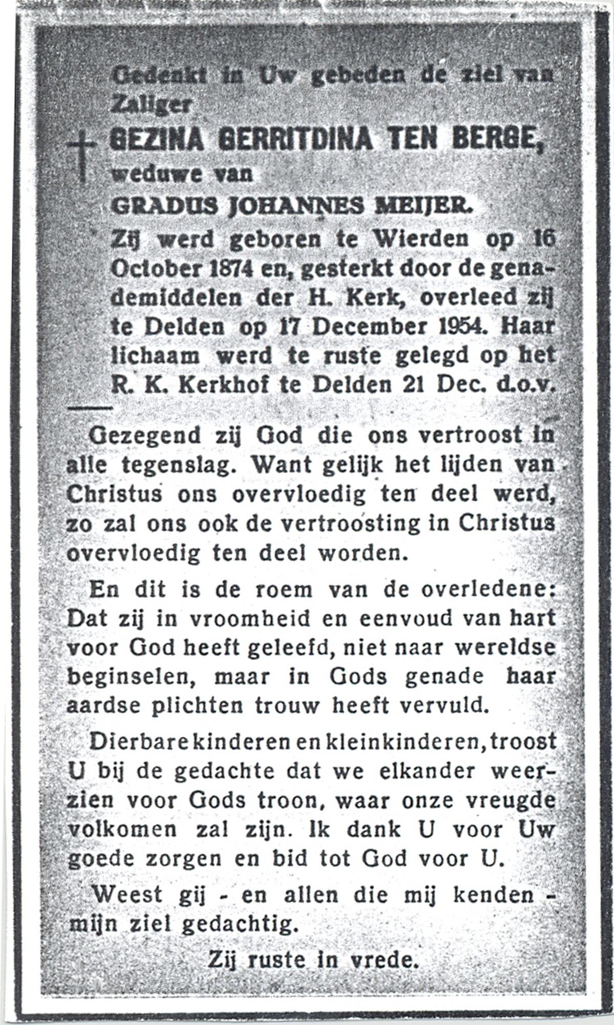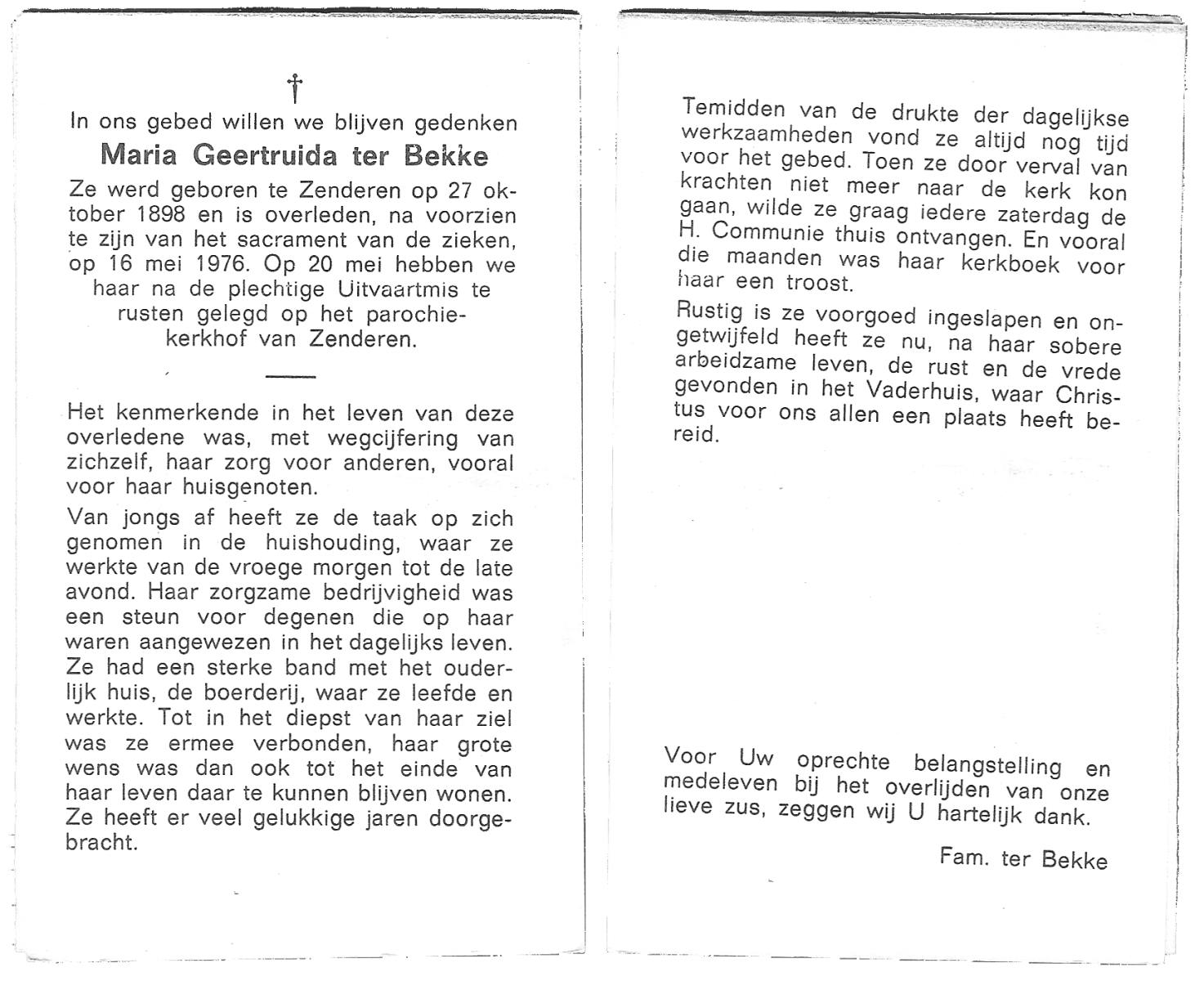 BEKKE, ter, Maria Geertruida, geboren op 27-10-1898 te Zenderen, overleden op 16-5-1976 te Zenderen op 77-jarige leeftijd, begraven op 20-5-1976 te Zenderen.