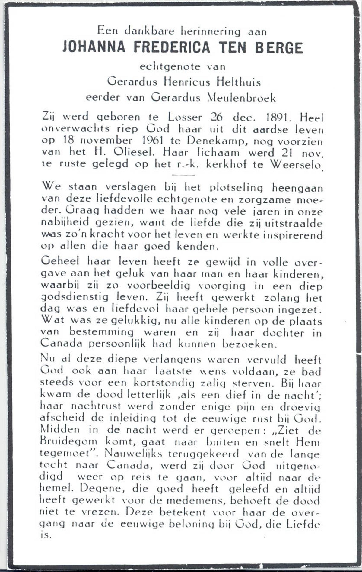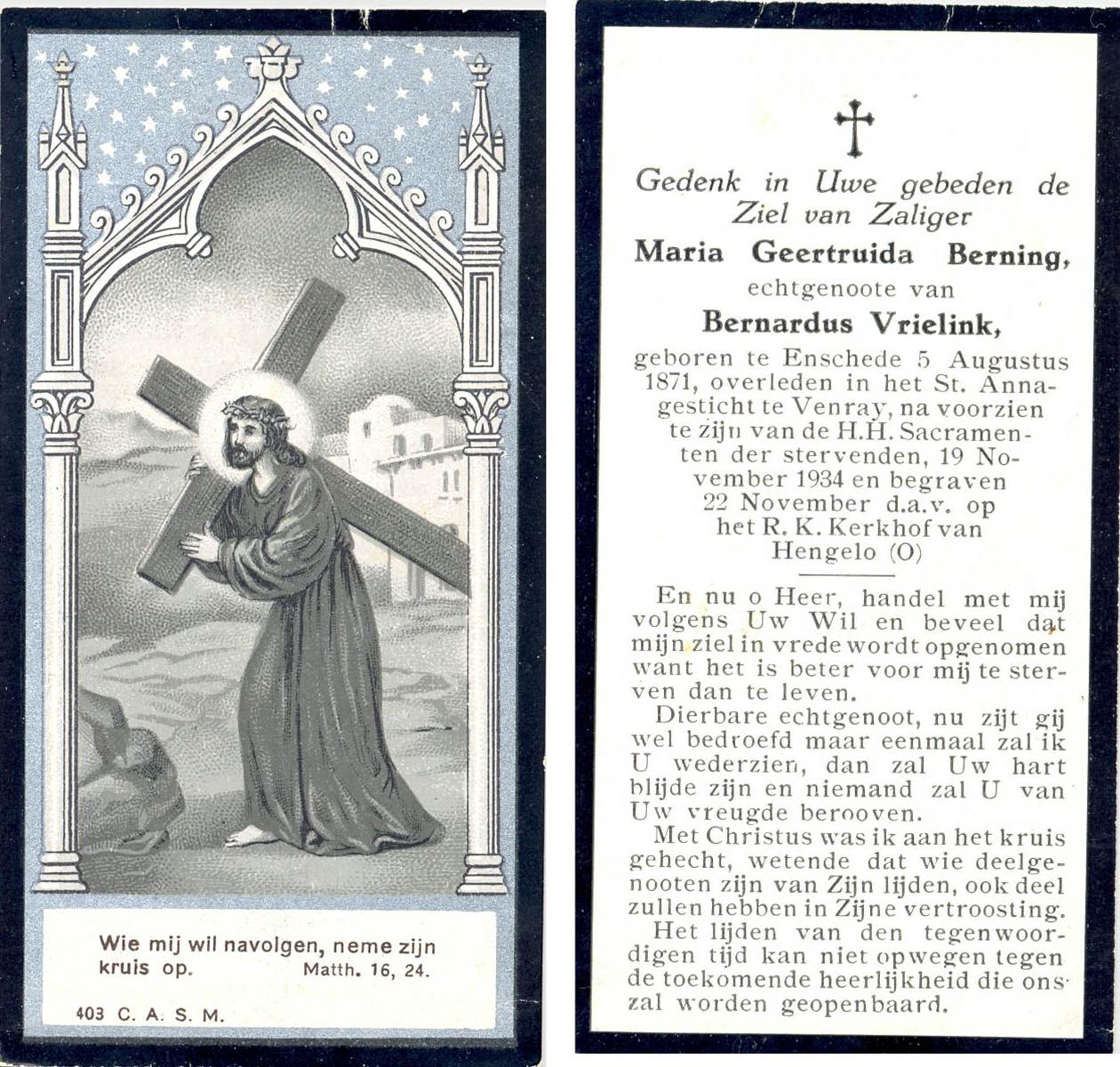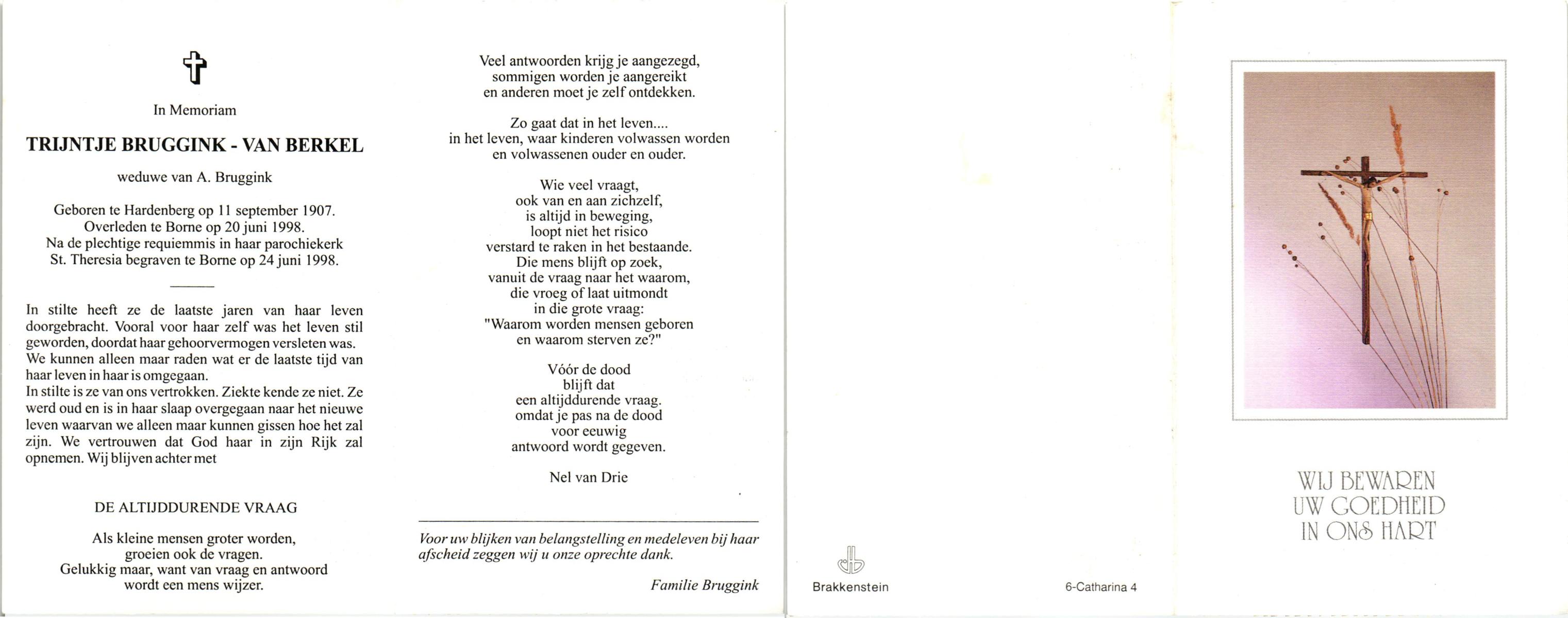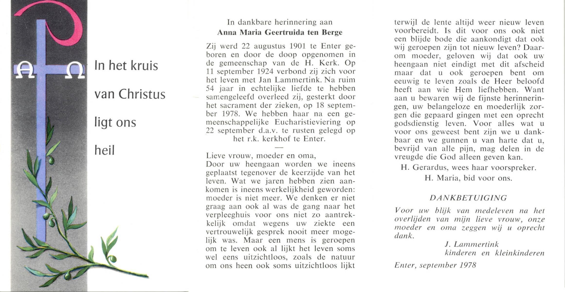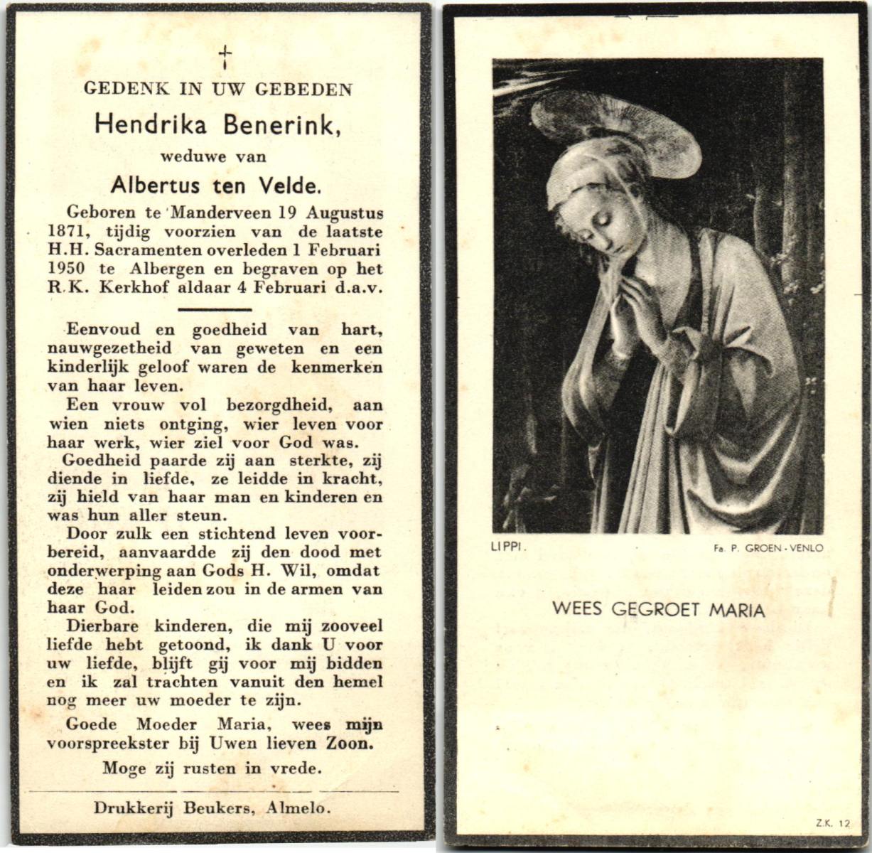 BEKKE, ter, Maria Geertruida, geboren op 27-10-1898 te Zenderen, overleden op 16-5-1976 te Zenderen op 77-jarige leeftijd, begraven op 20-5-1976 te Zenderen.