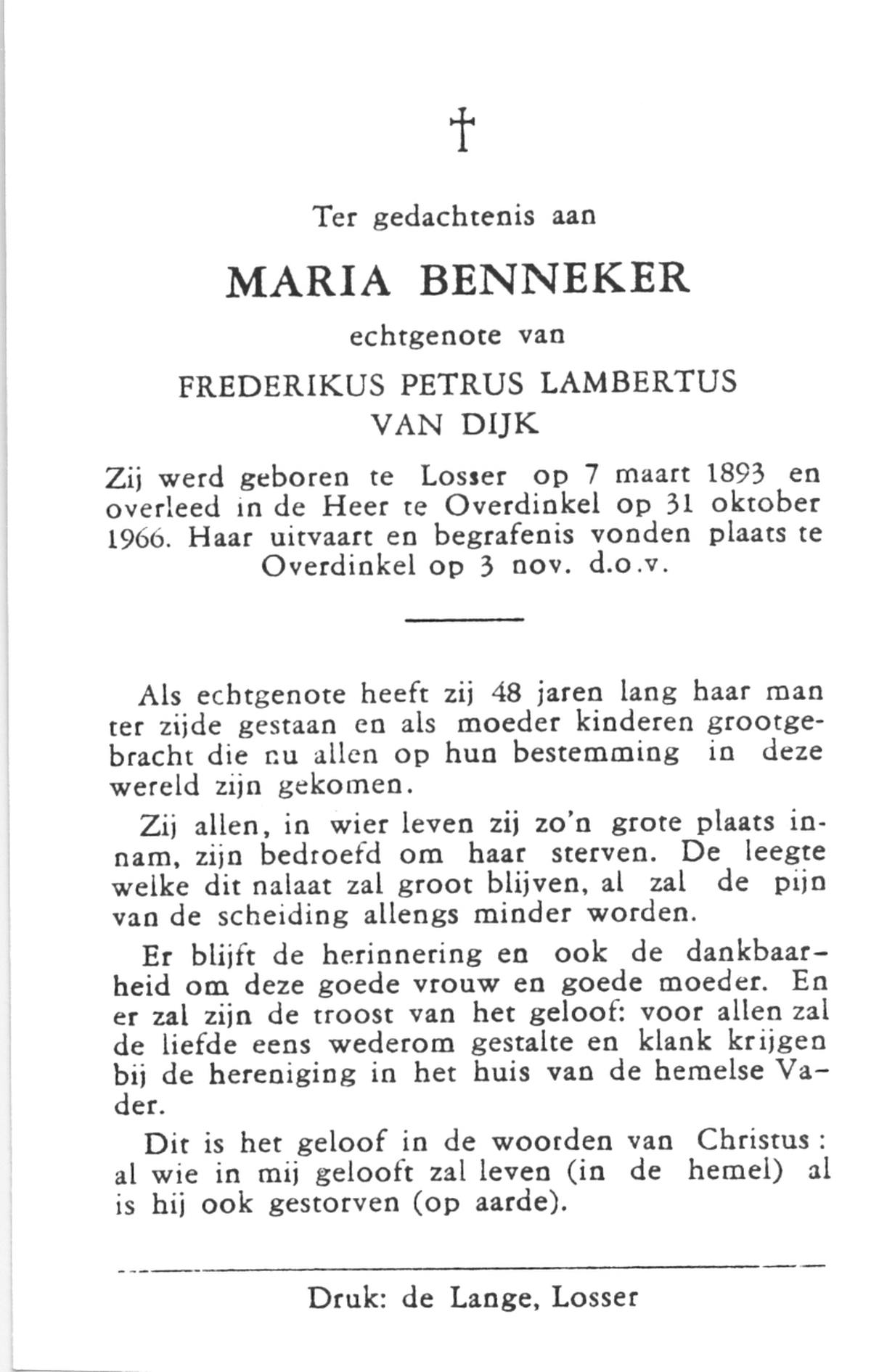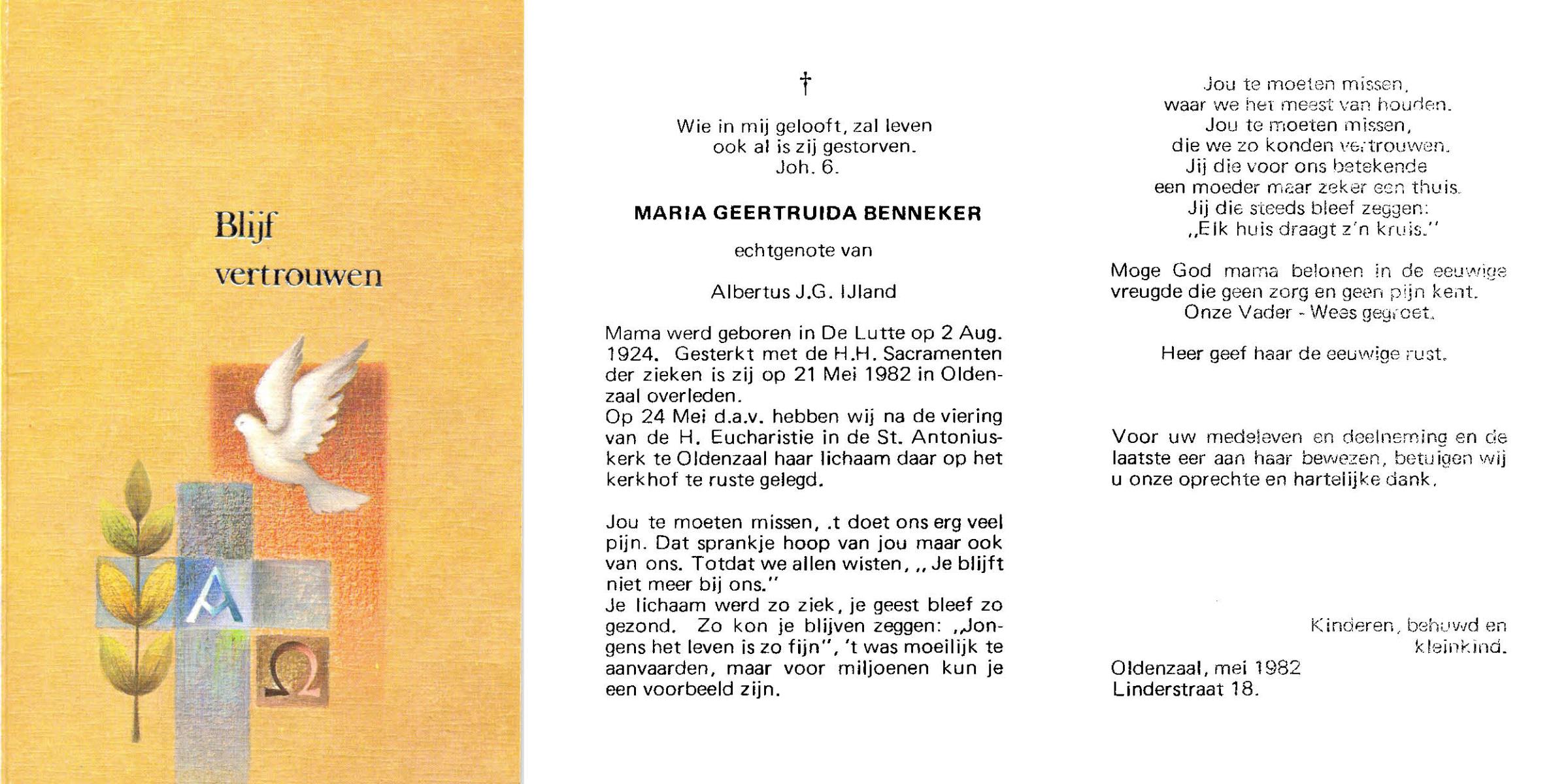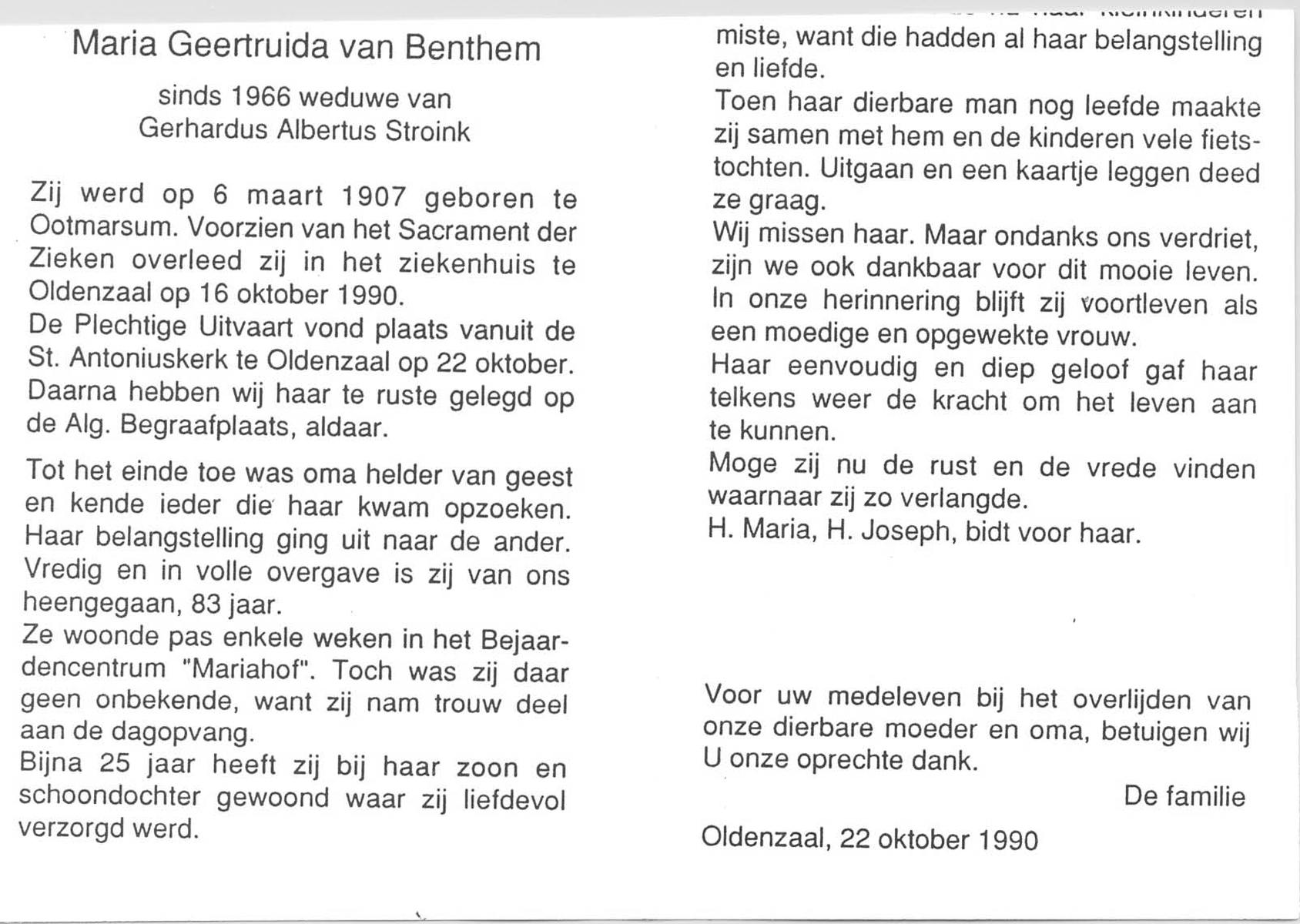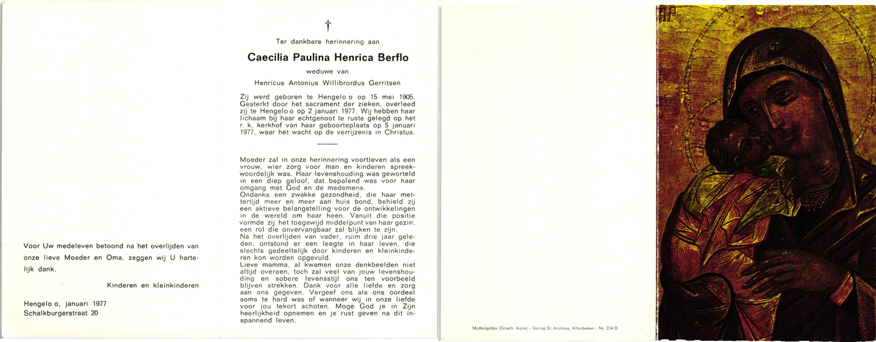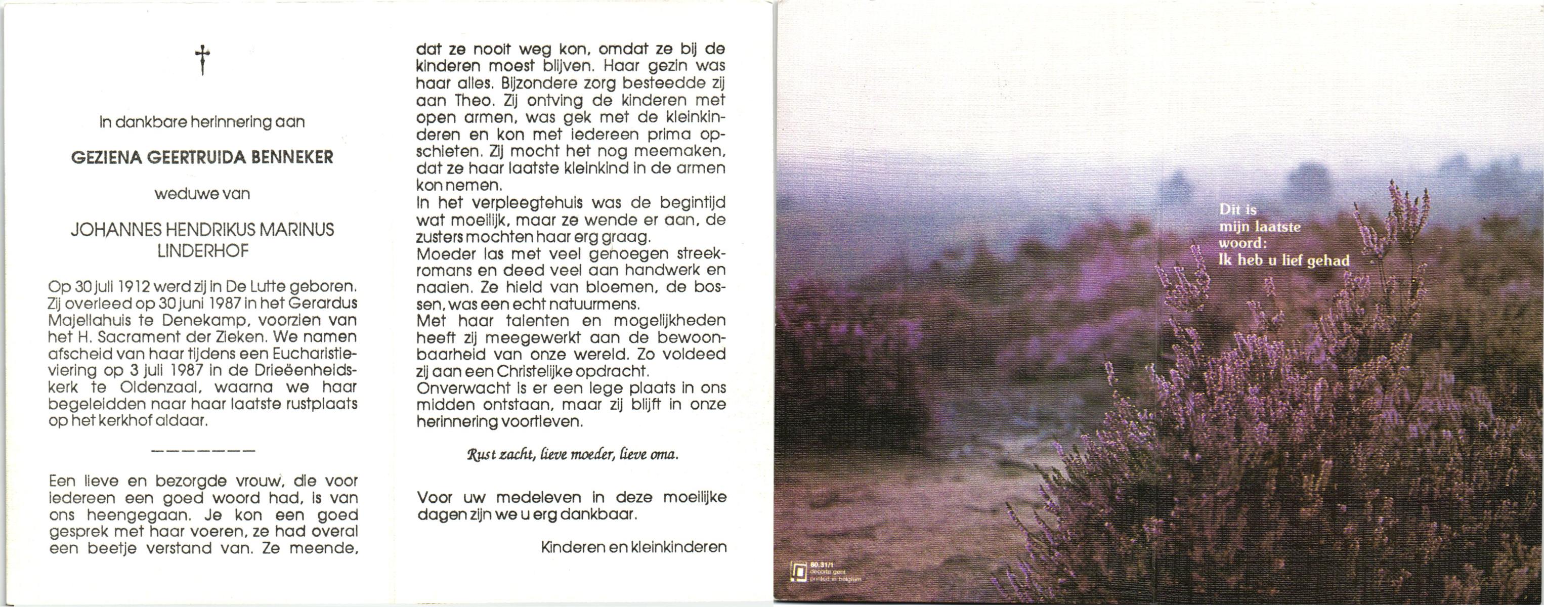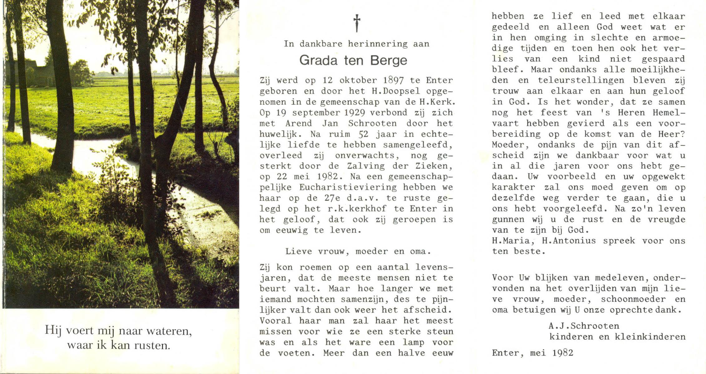 BEKKE, ter, Maria Geertruida, geboren op 27-10-1898 te Zenderen, overleden op 16-5-1976 te Zenderen op 77-jarige leeftijd, begraven op 20-5-1976 te Zenderen.