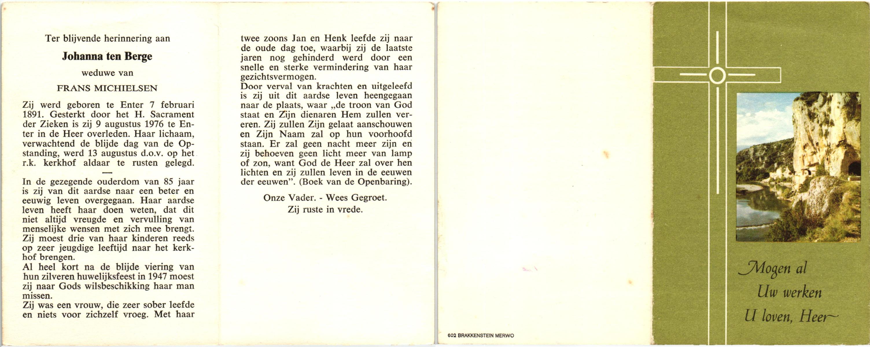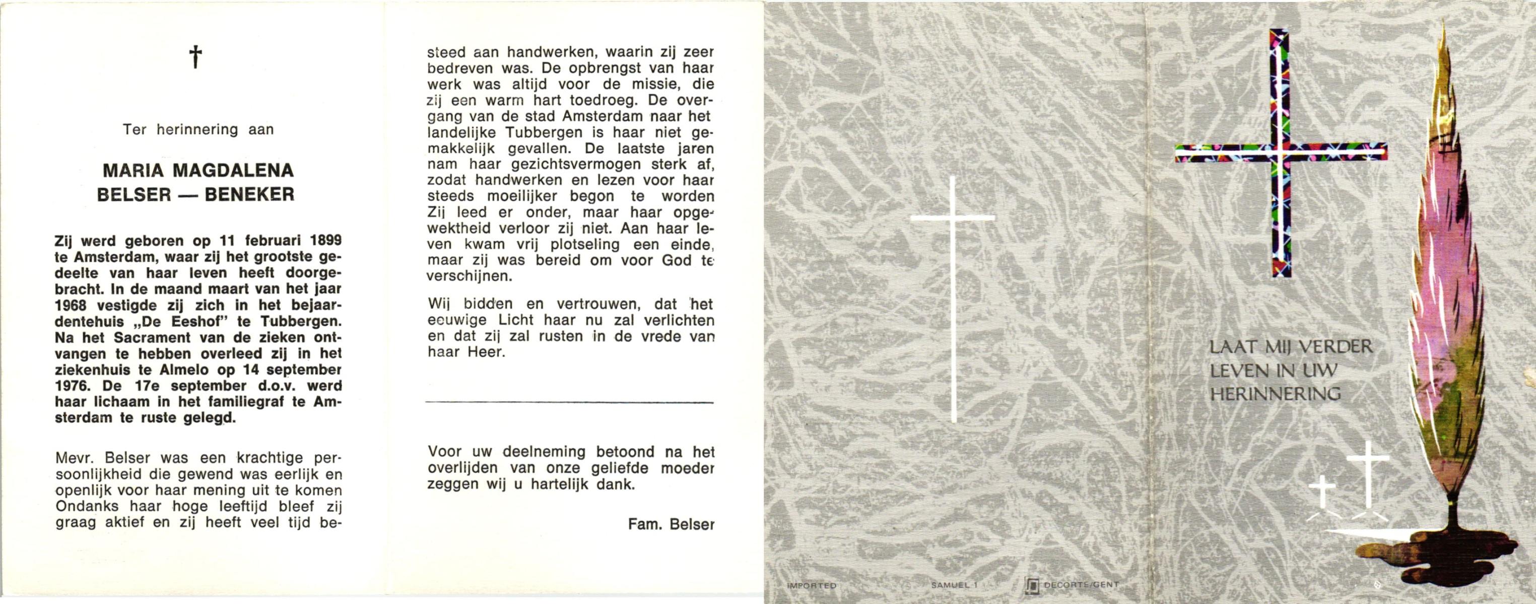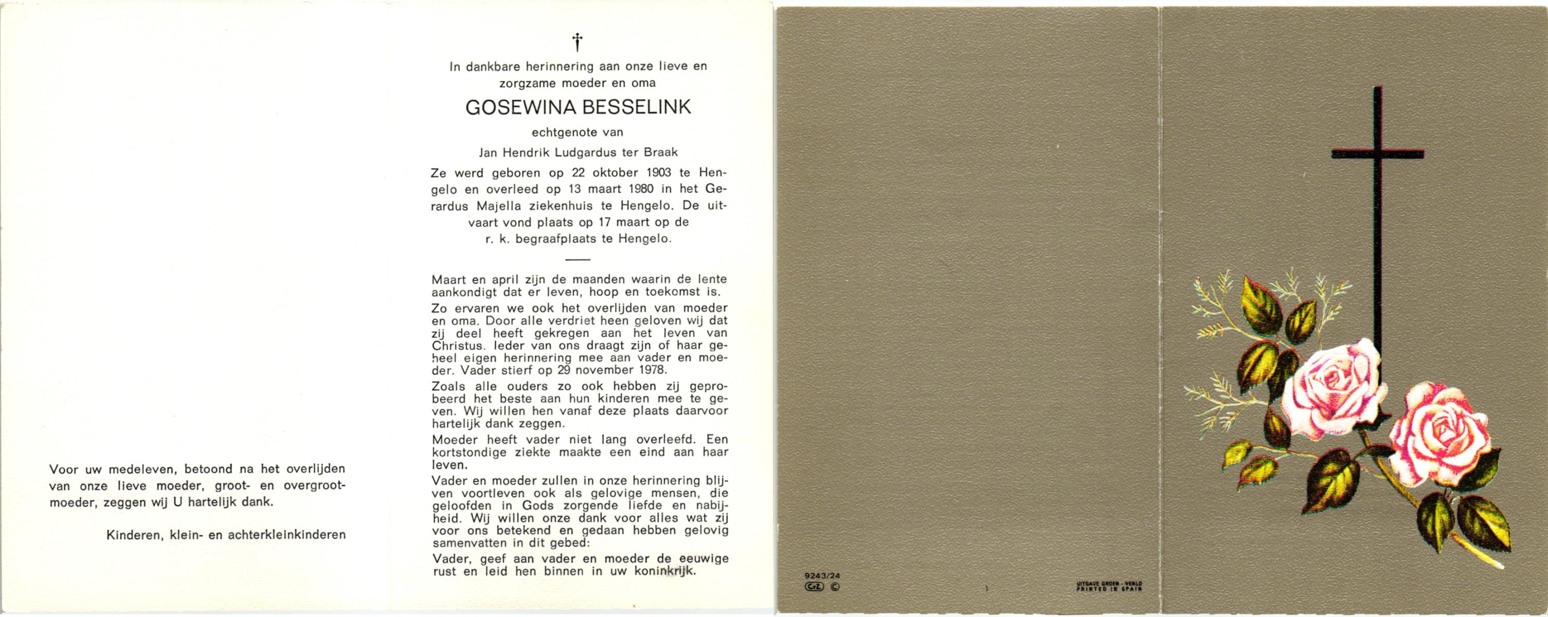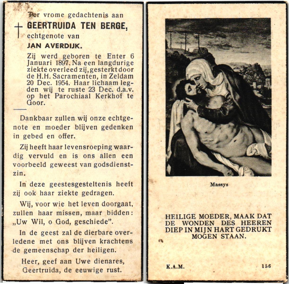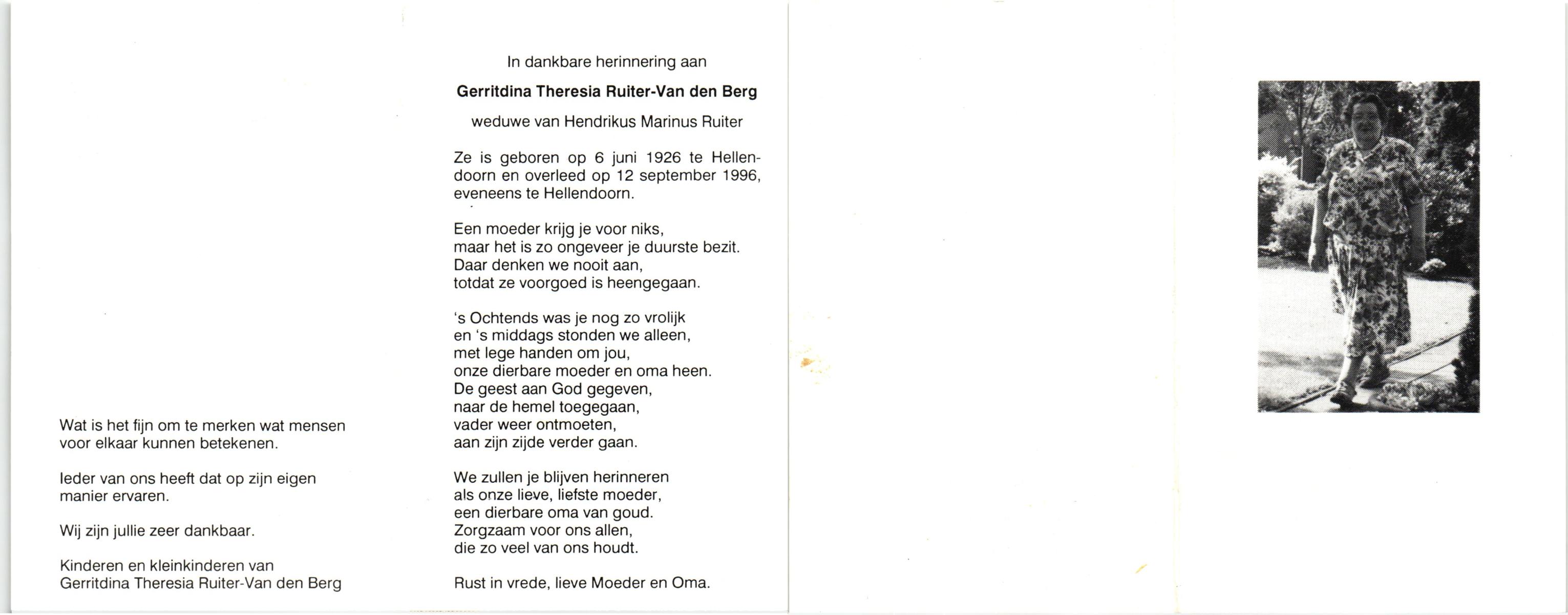 BEKKE, ter, Maria Geertruida, geboren op 27-10-1898 te Zenderen, overleden op 16-5-1976 te Zenderen op 77-jarige leeftijd, begraven op 20-5-1976 te Zenderen.