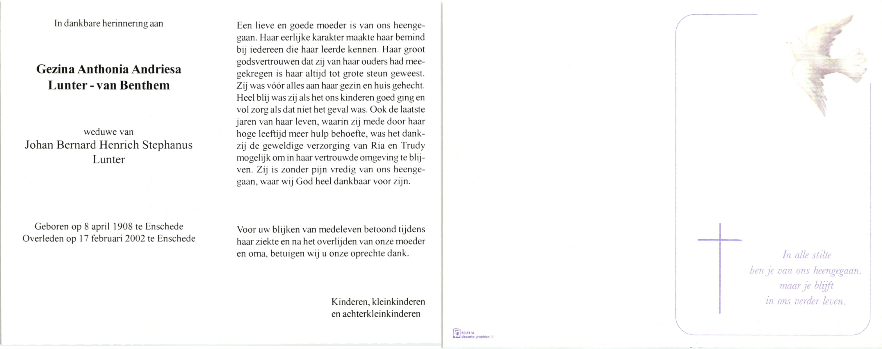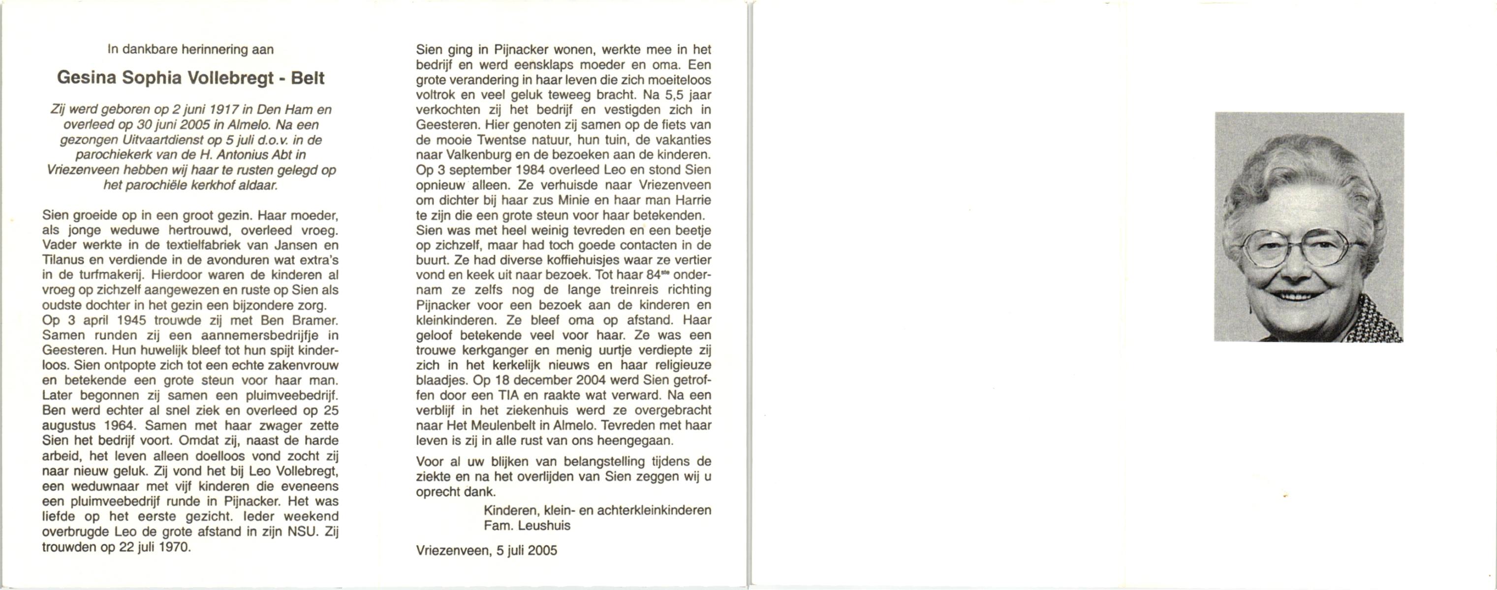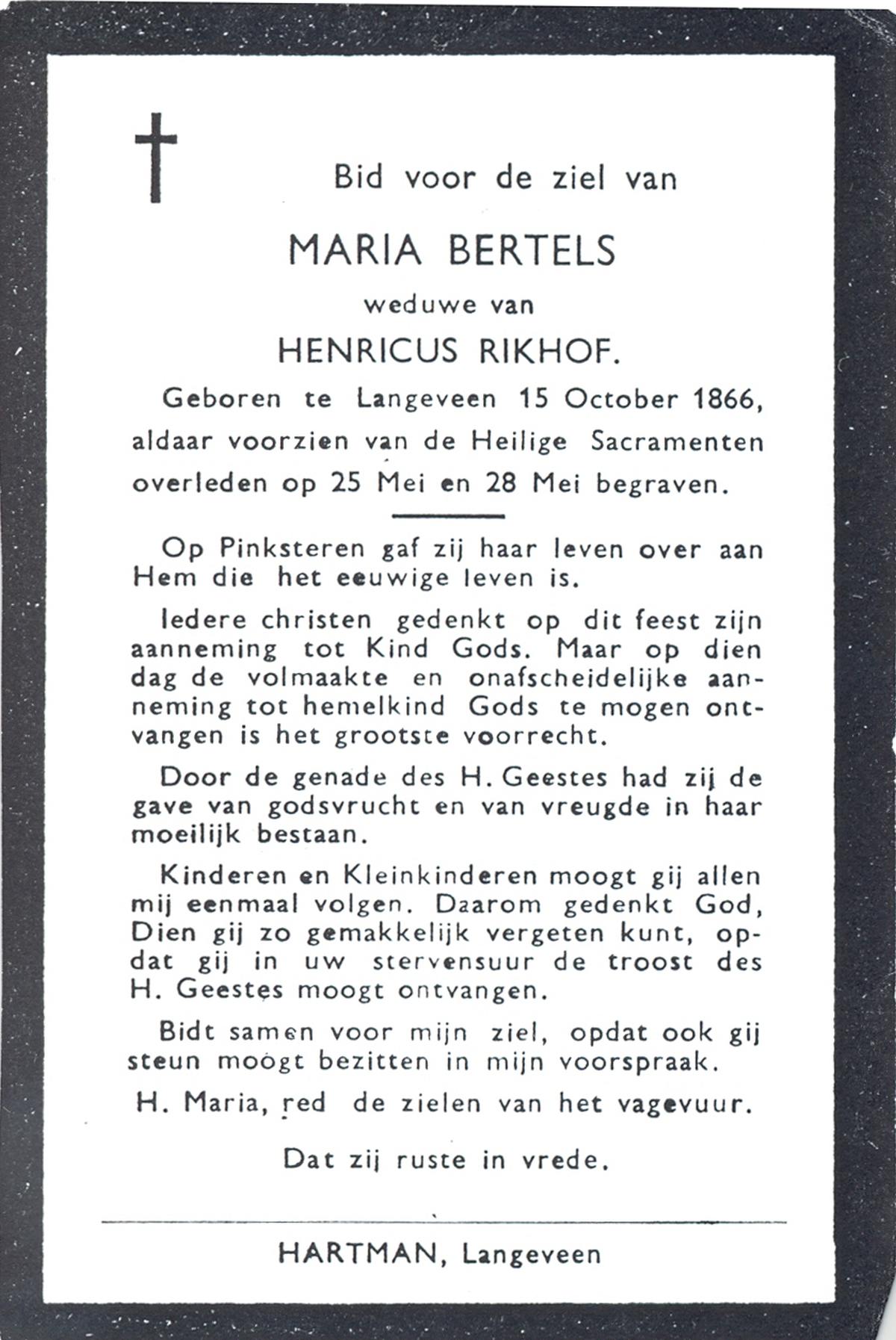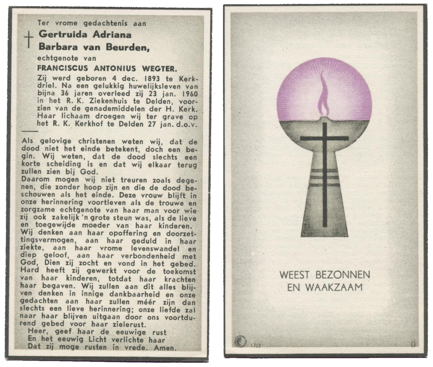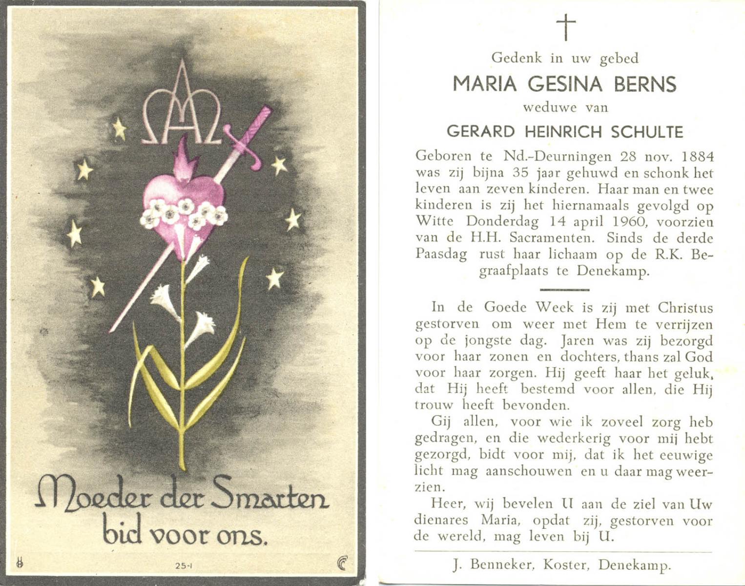 BEKKE, ter, Maria Geertruida, geboren op 27-10-1898 te Zenderen, overleden op 16-5-1976 te Zenderen op 77-jarige leeftijd, begraven op 20-5-1976 te Zenderen.