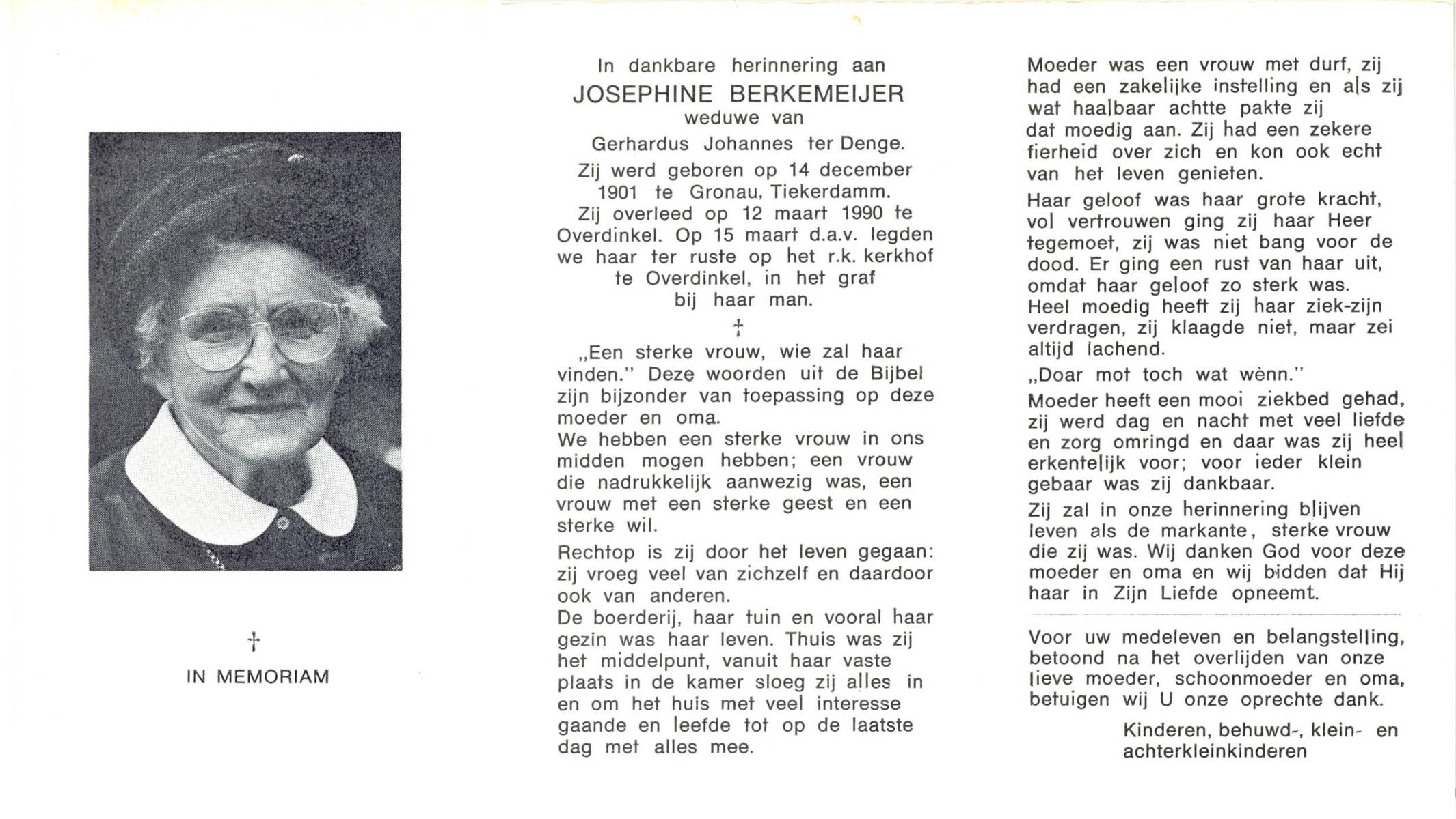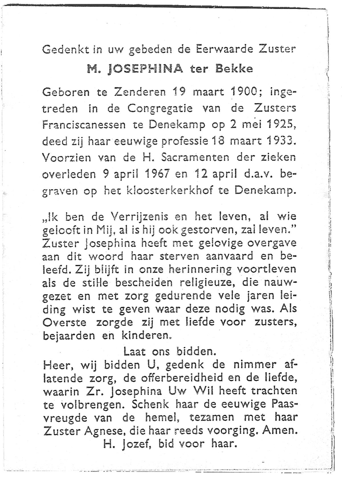 BEKKE, ter, M. Josephina, geboren op 19-3-1900 te Zenderen, overleden op 9-4-1967 op 67-jarige leeftijd, begraven op 12-4-1967 te Denekamp.