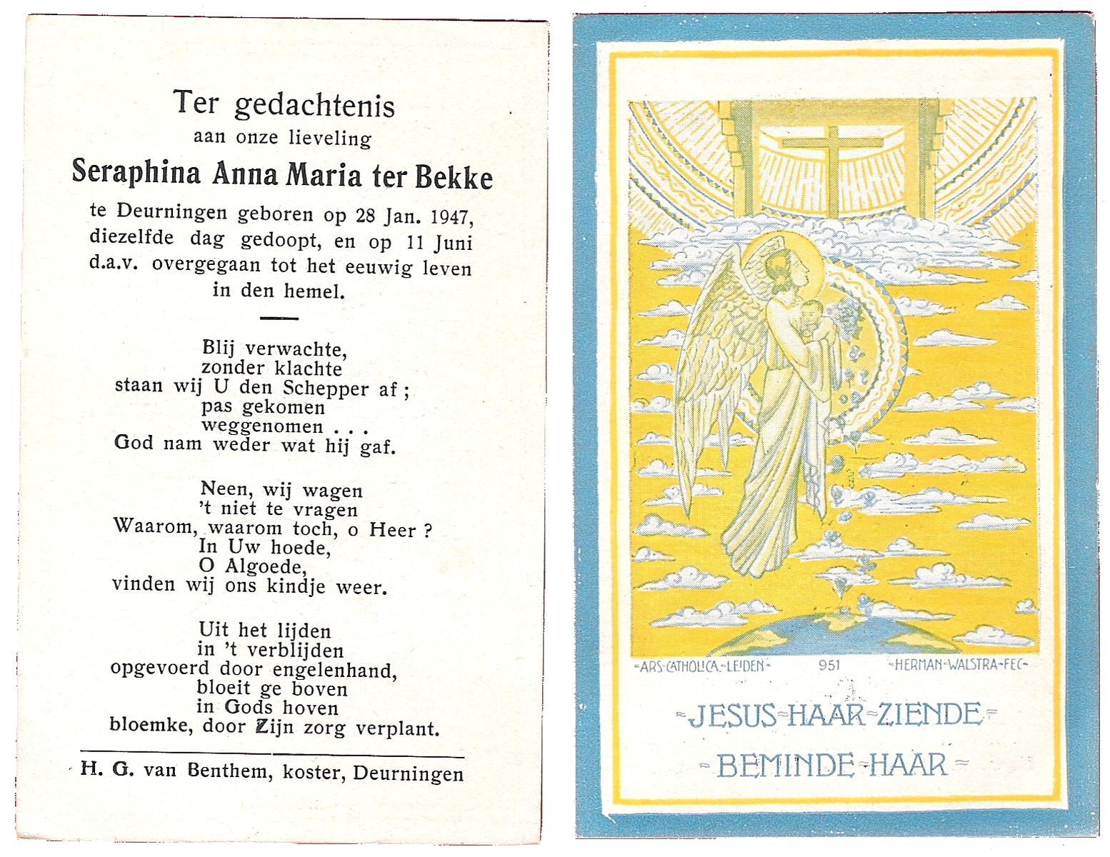 BEKKE, ter, Seraphina Anna Maria, geboren op 28-1-1947 te Deurningen, overleden op 11-6-1947 te Deurningen op 0-jarige leeftijd.