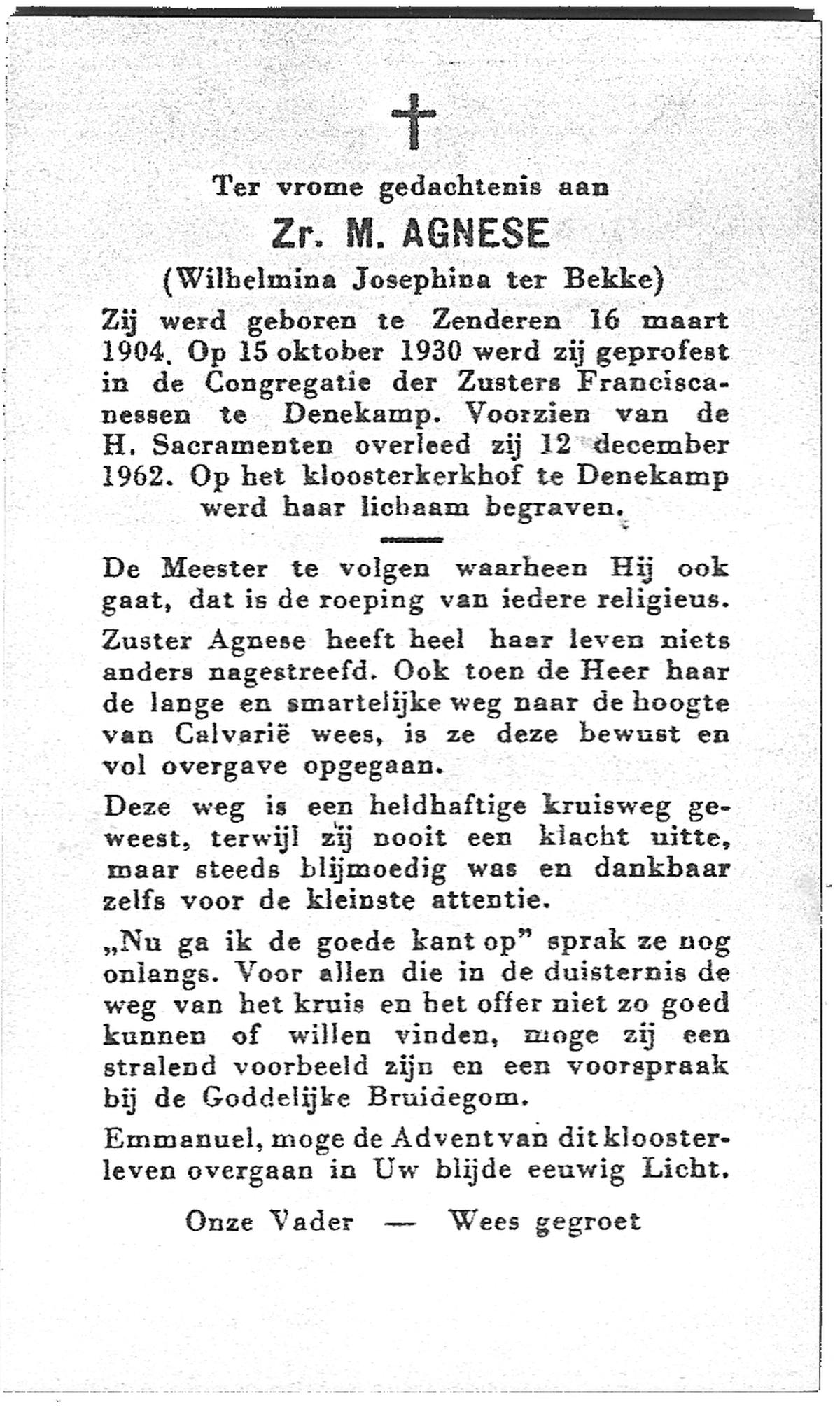 BEKKE, ter, Wilhelmina Josephina, geboren op 16-3-1904 te Zenderen, overleden op 12-12-1962 op 62-jarige leeftijd, begraven op 12-12-1962 te Denekamp.