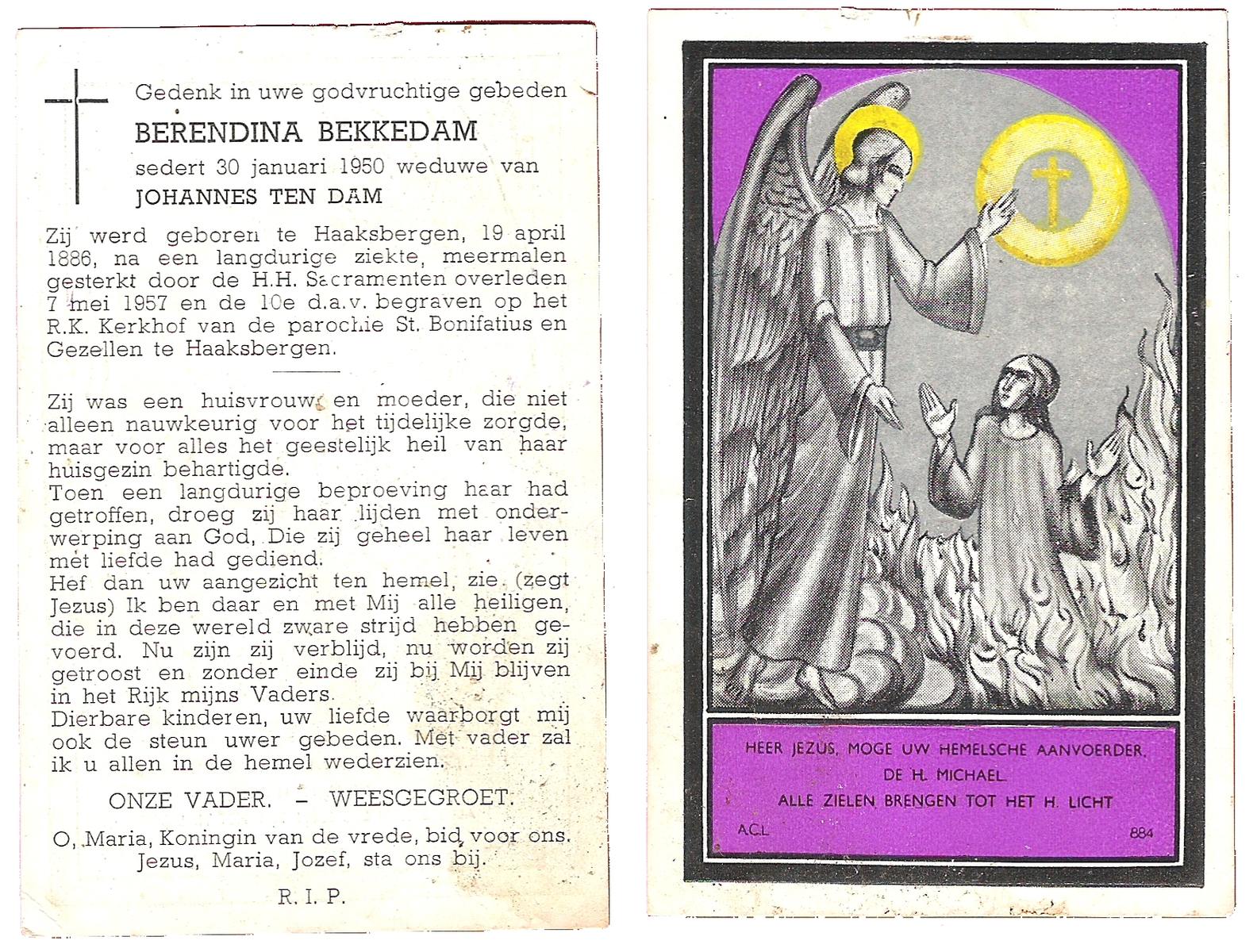 BEKKEDAM, Berendina, geboren op 19-04-1886 te Haaksbergen, overleden op 7-5-1957 op 71-jarige leeftijd, begraven op 10-5-1957 te Haaksbergen.