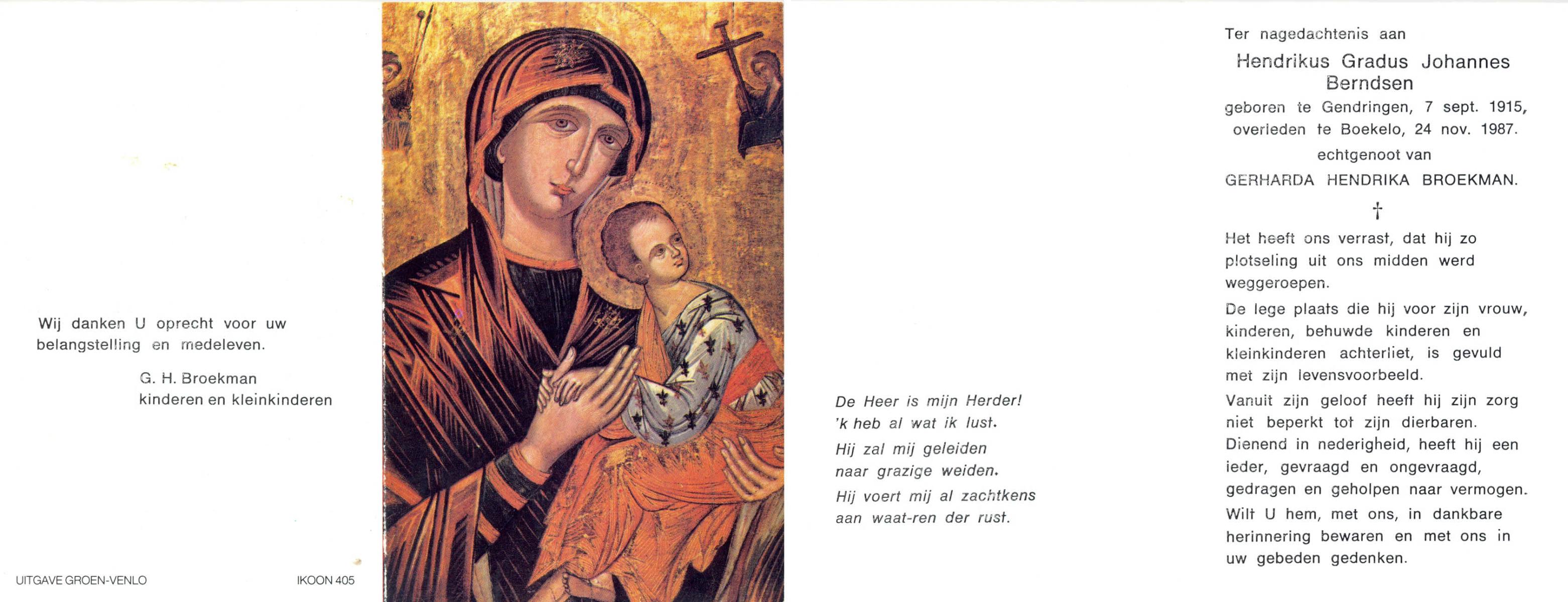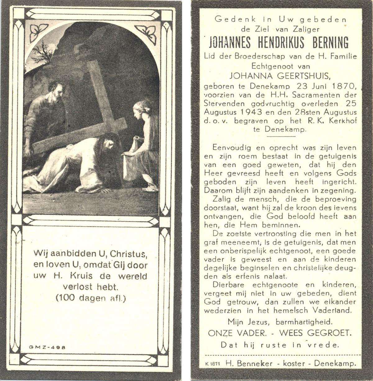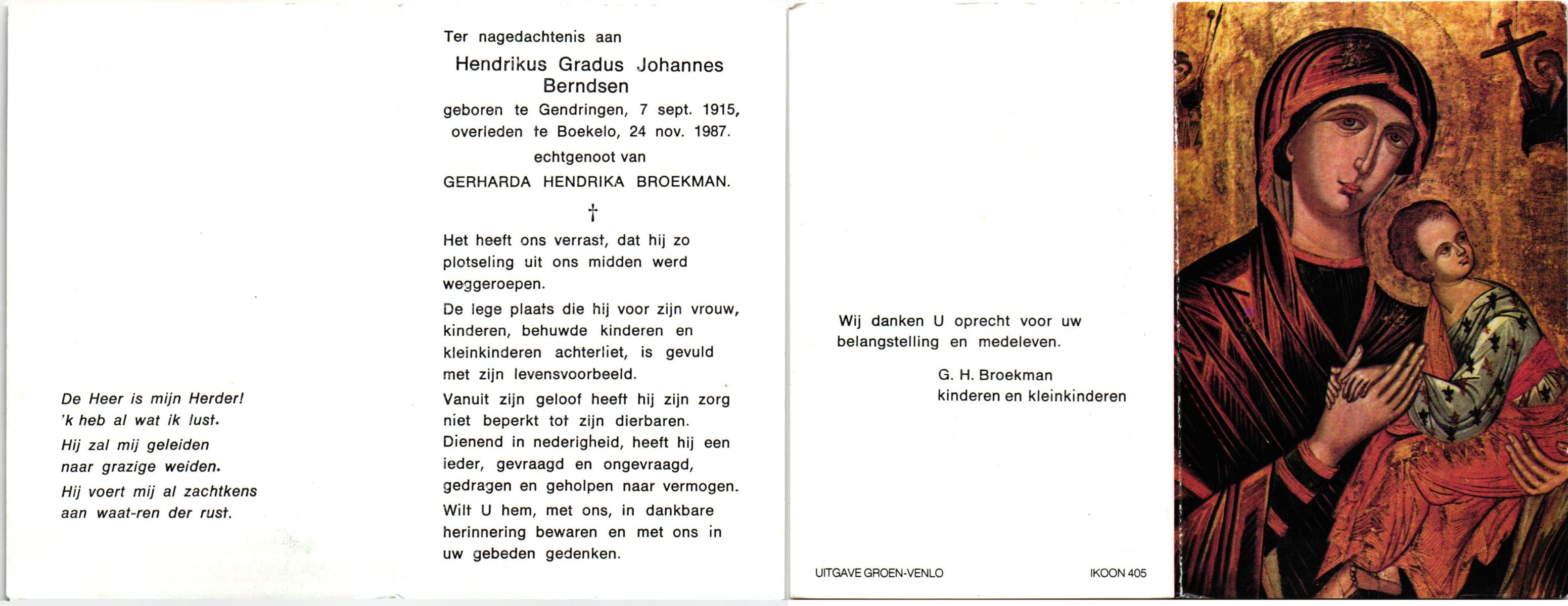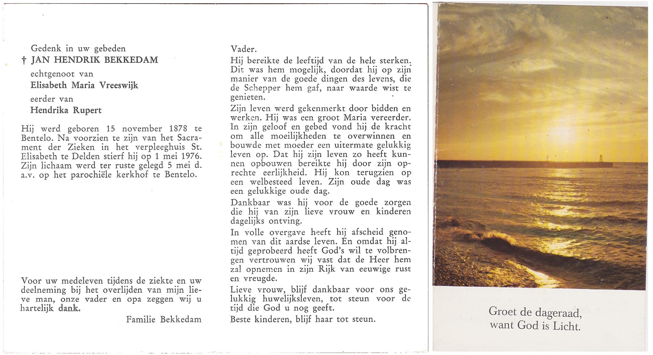 BEKKEDAM, Jan Hendrik, geboren op 15-11-1878 te Bentelo, overleden op 1-5-1976 te Delden op 97-jarige leeftijd, begraven op 5-5-1976 te Bentelo.
