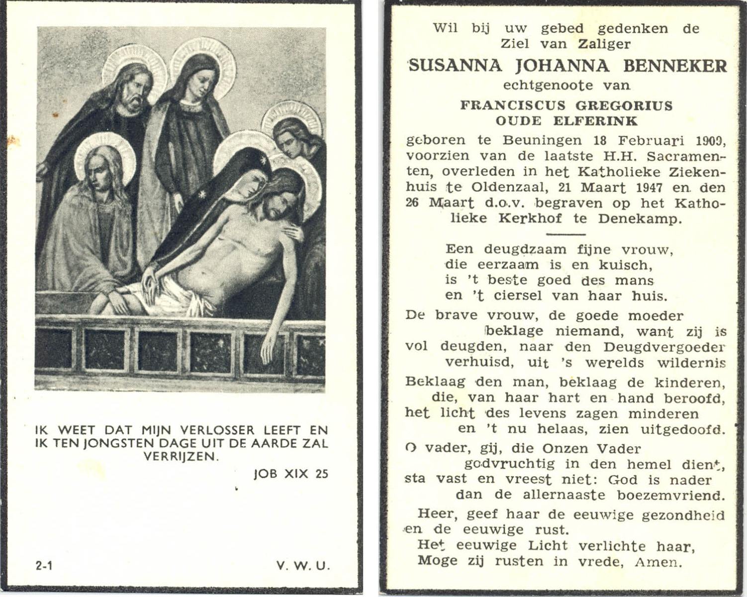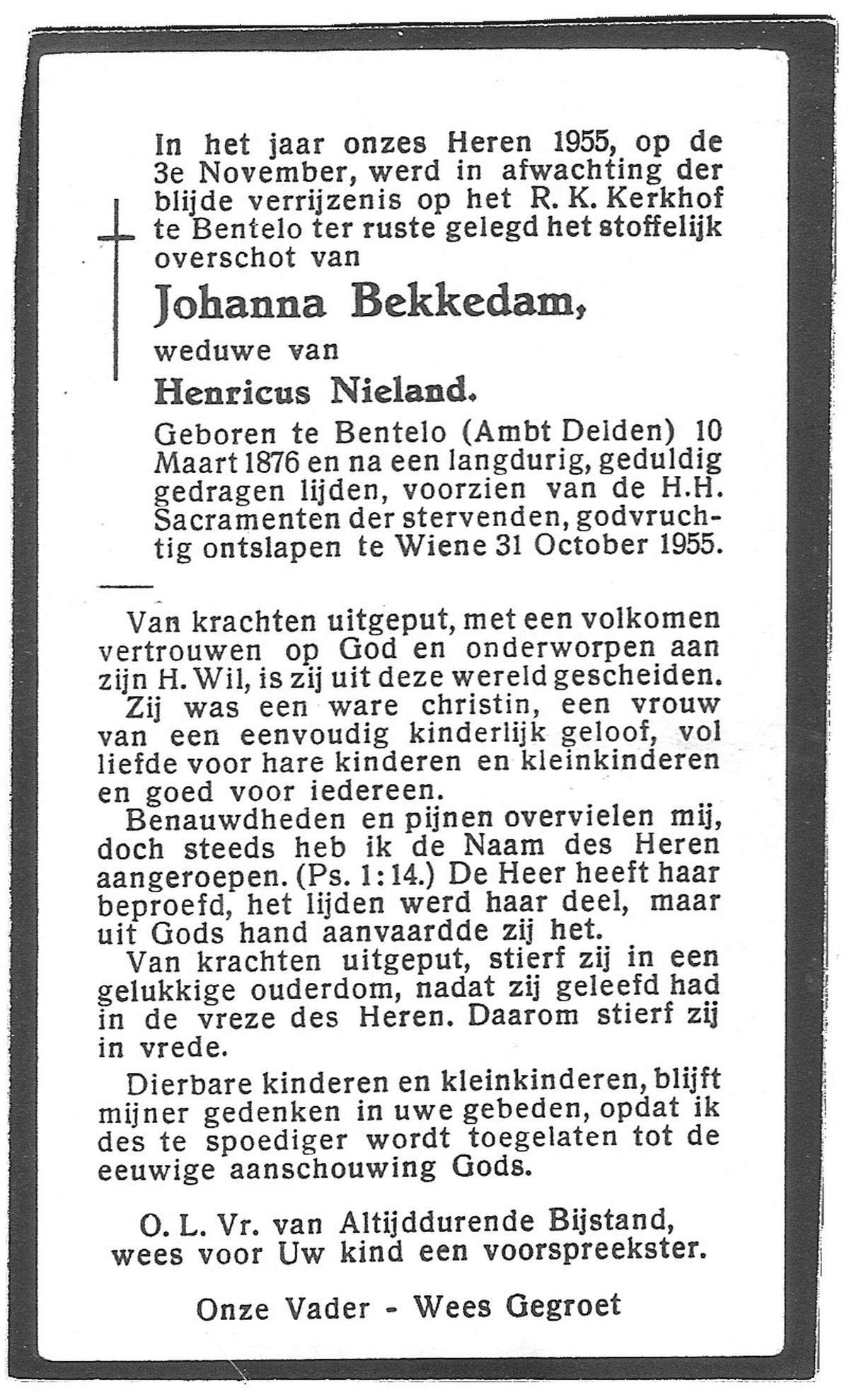 BEKKEDAM, Johanna, geboren op 10-03-1876 te Bentelo, overleden op 31-10-1955 te Wiene op 79-jarige leeftijd.