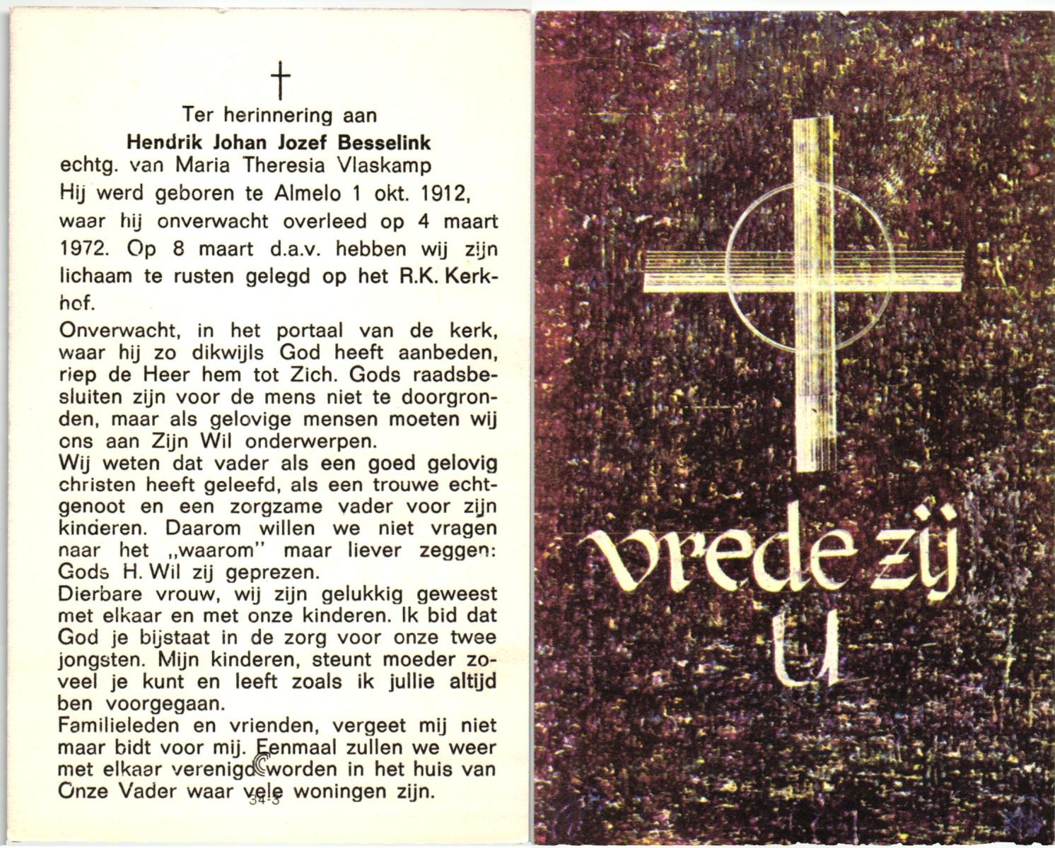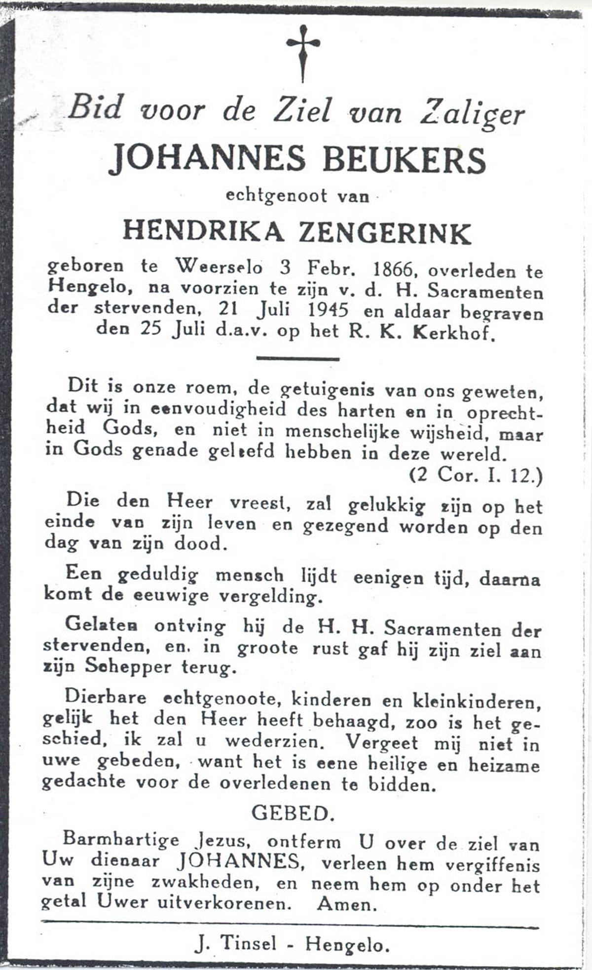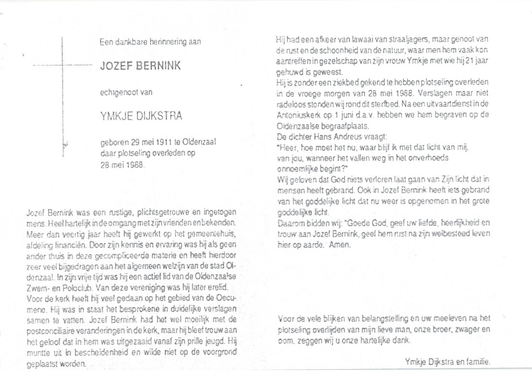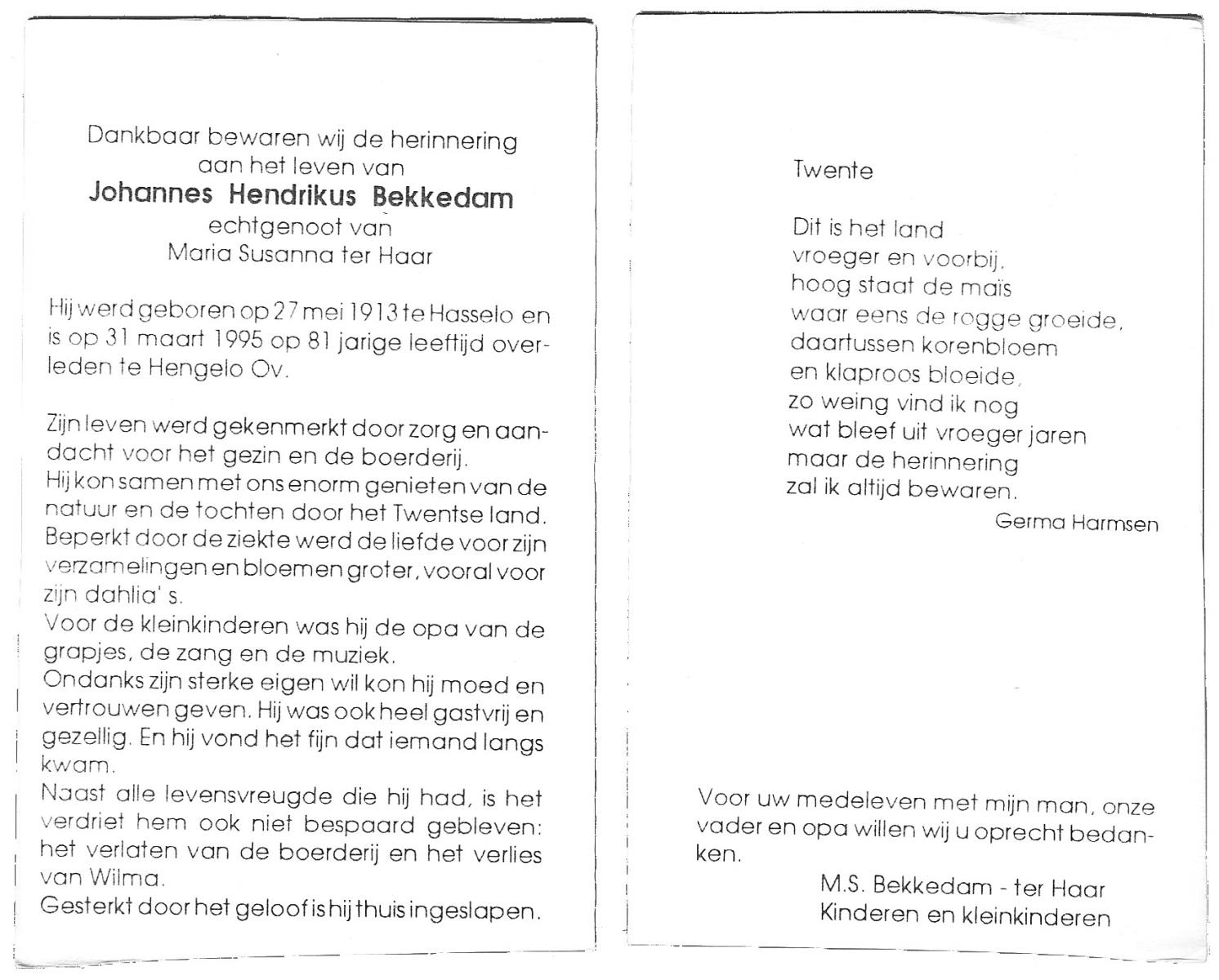BEKKEDAM, Johannes Hendrikus, geboren op 27-5-1913 te Hasselo, overleden op 31-3-1985 te Hengelo (Ov.) op 71-jarige leeftijd.